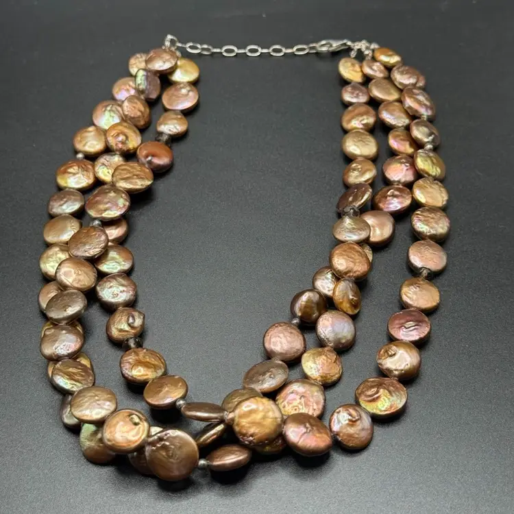 Shimmering bronze with a hint of rose—this Silpada triple-strand necklace layers iridescent freshwater coin pearls and petite sterling accents for a rich, glowing drape at the collarbone. The strands graduate for a full, luxe look without bulk, and the extender lets you set the length just right.