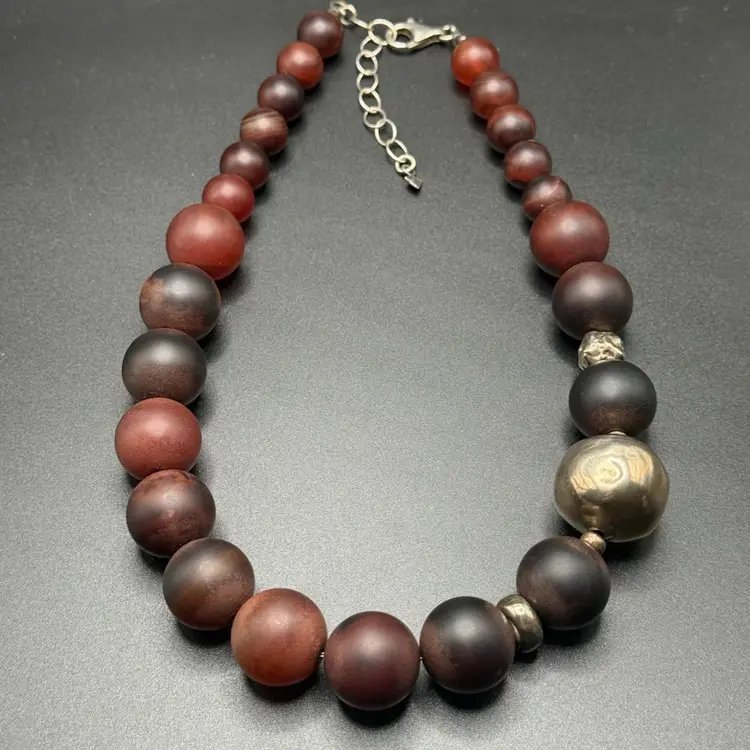 Brick-red beads, bold silver, easy drama. Silpada N1822 graduates matte (frosted) red agate rounds along a sterling chain and finishes them with a hammered sterling focal bead off-center for that modern, artisan look. A lobster clasp and extender let you set the drop just right at the collarbone.