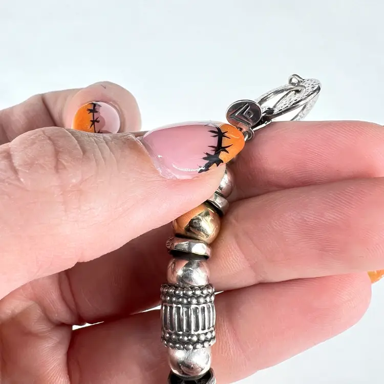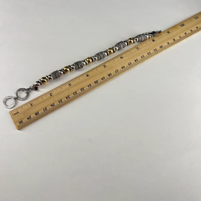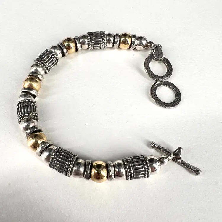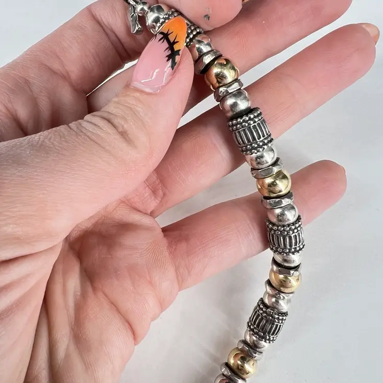 This bracelet is attributed to Silpada. It has the appearance of mixed metals, but is made of sterling. It measures approx 8” long.