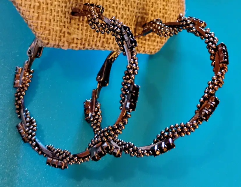 A highly sought after pair of 2inch hoops, Black rhinestone and silver beaded twist, with omega backs. The perfect addition to your outfit.