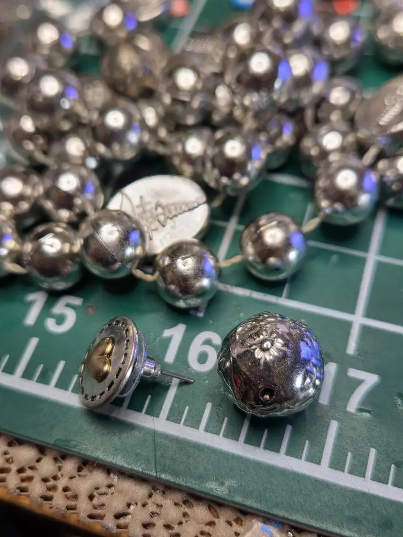 This gal is made with a silver seed bead beak, a silver bead from a necklace, silver and gokd tailefesther earring that has a heart on it, and her body is filled a silver bead that has flower detsiling.