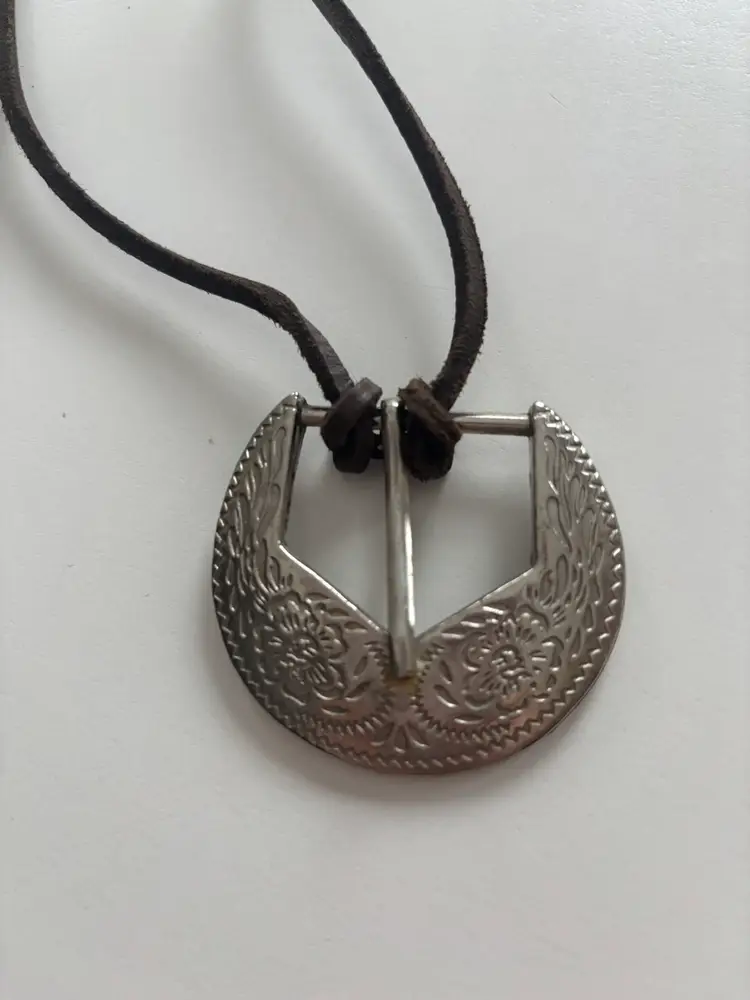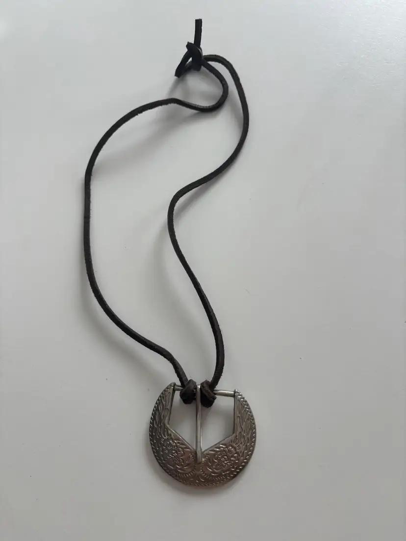 Silver pendant on a brown cord. Perfect for any occasion. 18” long.