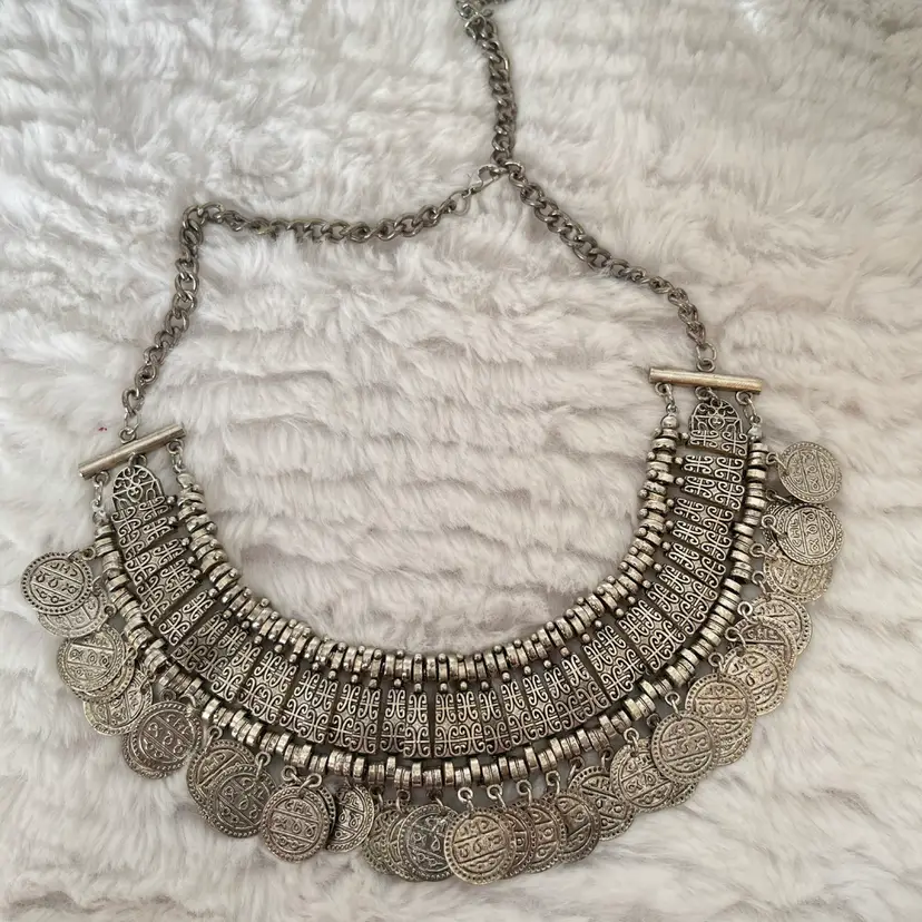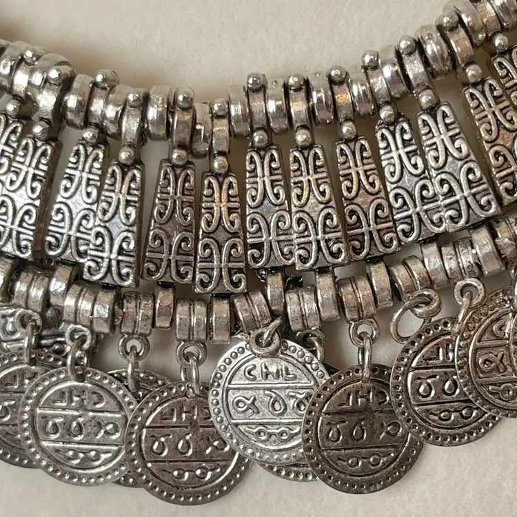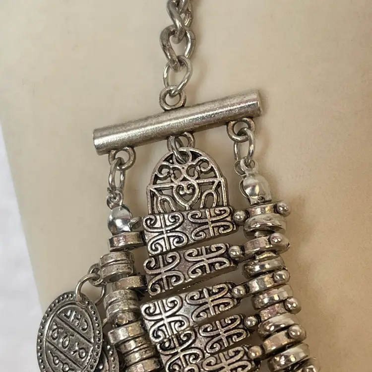 Bold silver tone statement bib necklace featuring detailed silver tone panels with cascading coin fringe accents.