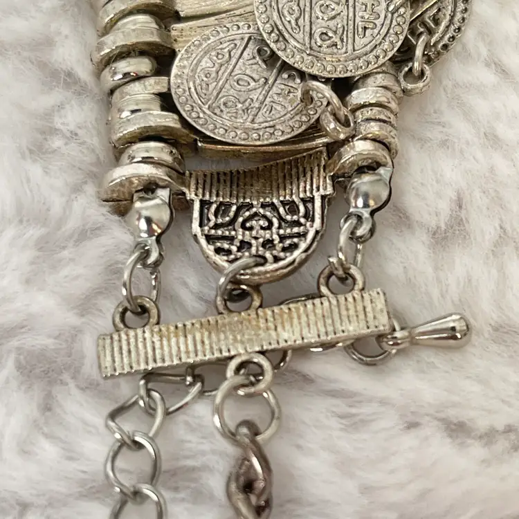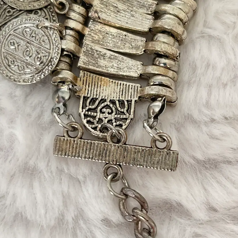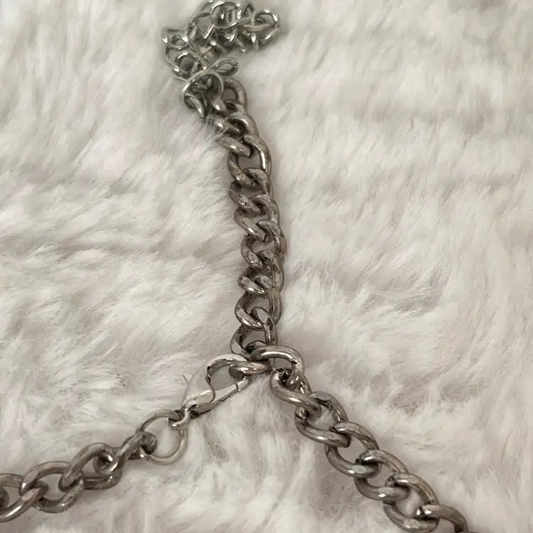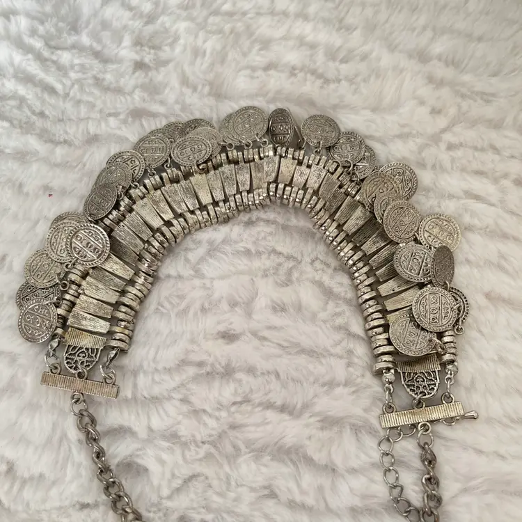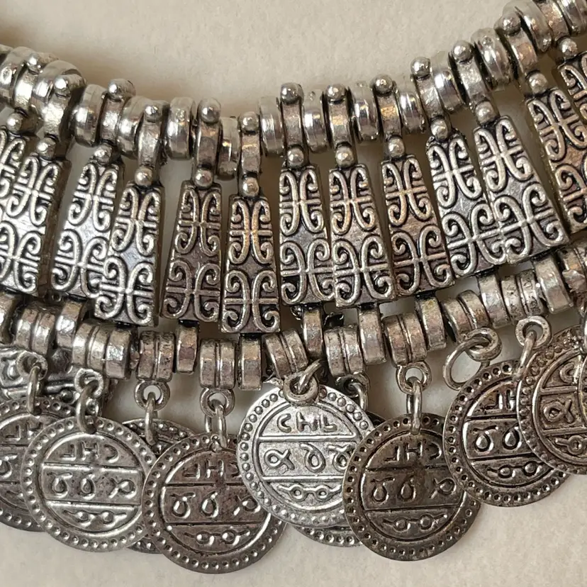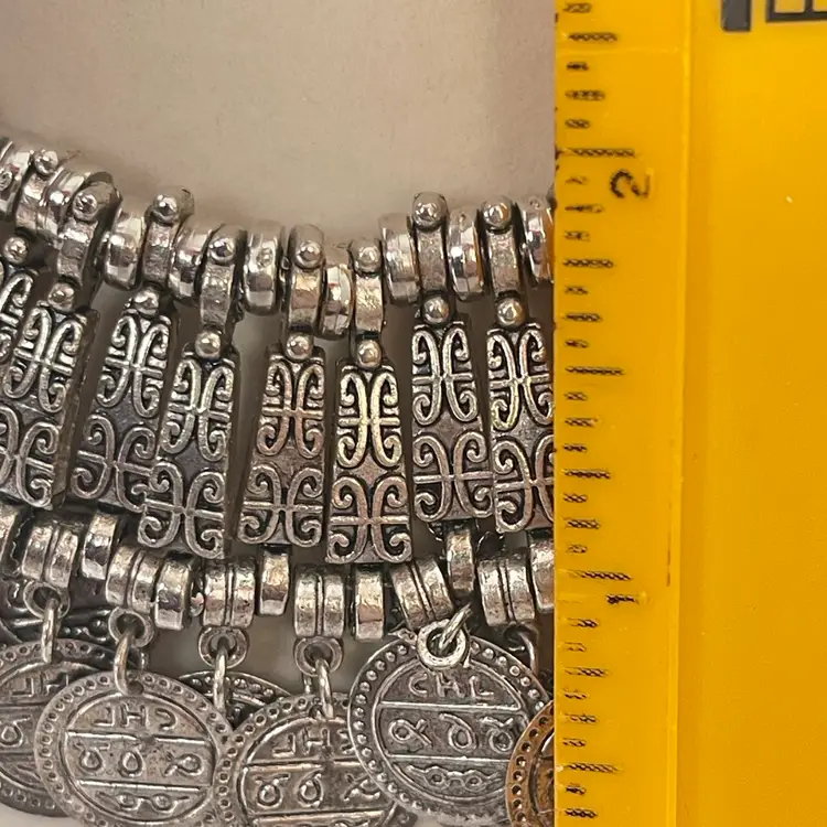 Details: • Style: Statement / Bib / Coin Fringe • Color: Silver tone • Closure: Lobster clasp with extender • Length: Approximately 16-22” adjustable (see photos with ruler) • Drop: Approx. 2–2.5” (visual estimate from photo) • Condition: Good pre-loved condition with light wear consistent with age/use. Please review all photos for details.