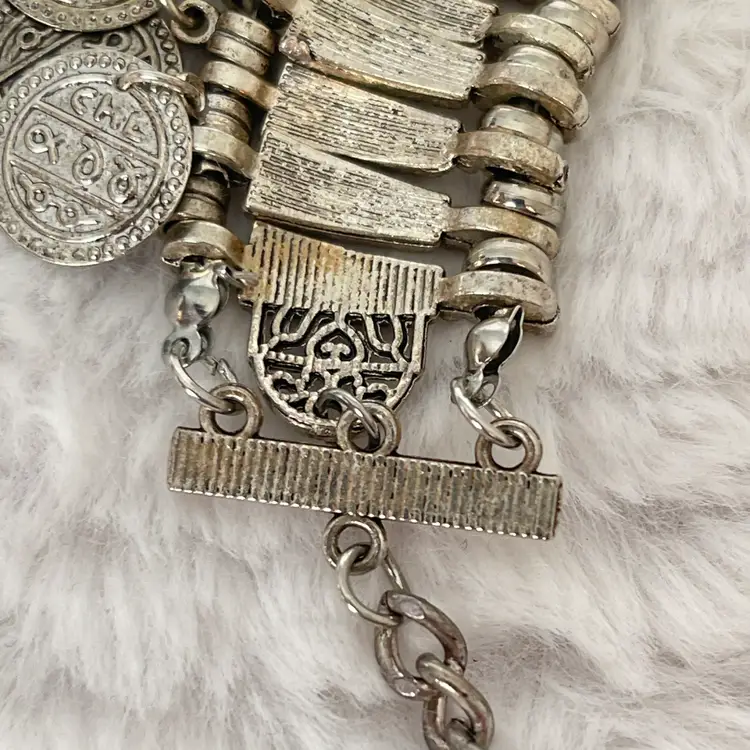 This piece has a bold boho / tribal / festival style with intricate engraved details and a layered design that makes it a true standout.