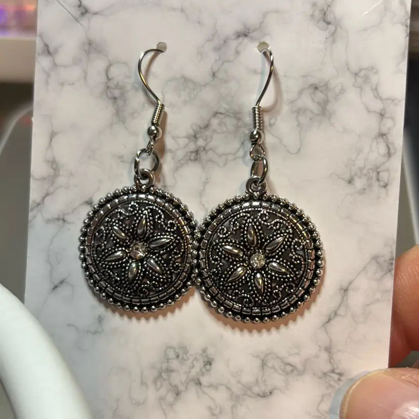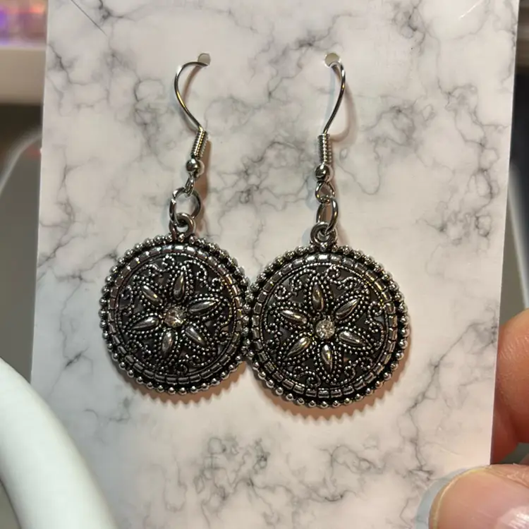 So for a fish hook, a dangle earring with a silver disc that has a clear gemstone in the middle and a flower design hat