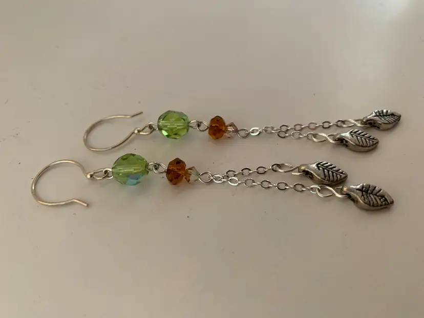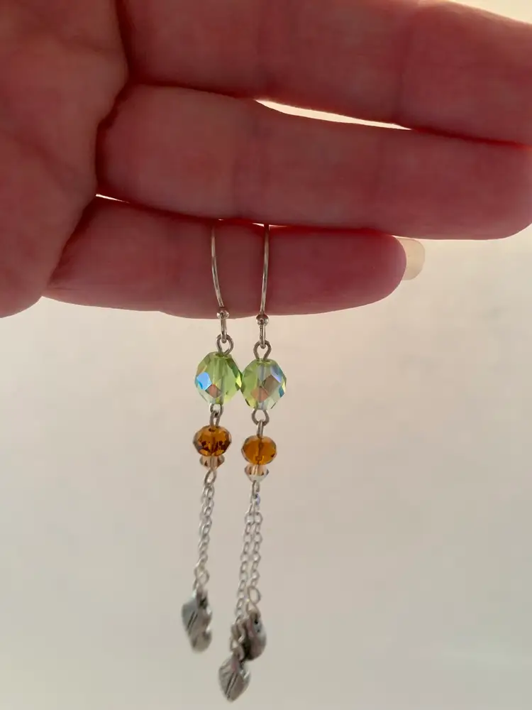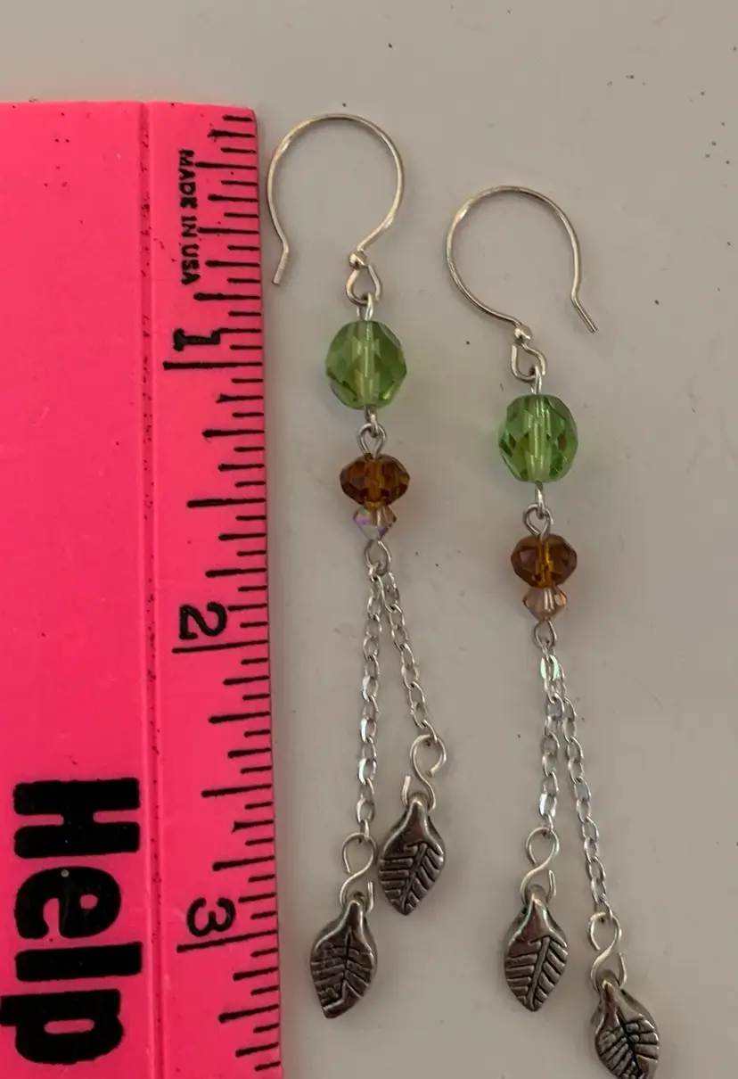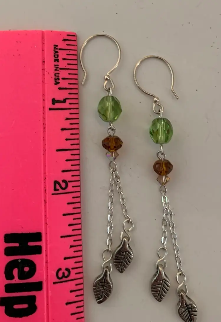 Silver toned metal leaf charms suspended from silver toned chain and glass beads in green and brown. Earrings are a little over 3” in length and made with silver toned curved ear wires.