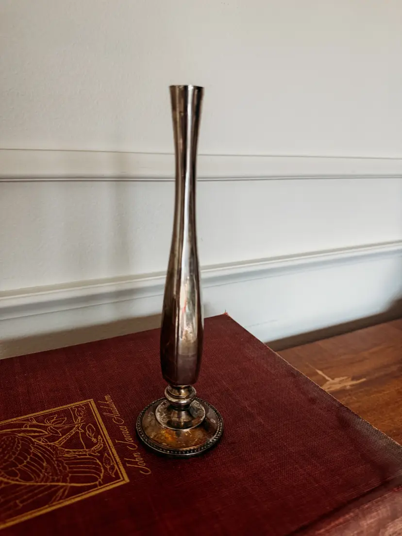 no markings. Delicate bud vase perfect for a kitchen counter, console or night stand. Add a little charm to any small space! One small nick in the metal at the top rim. 8" tall 2.25" wide base