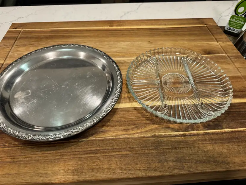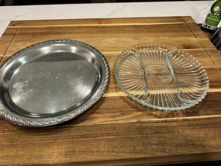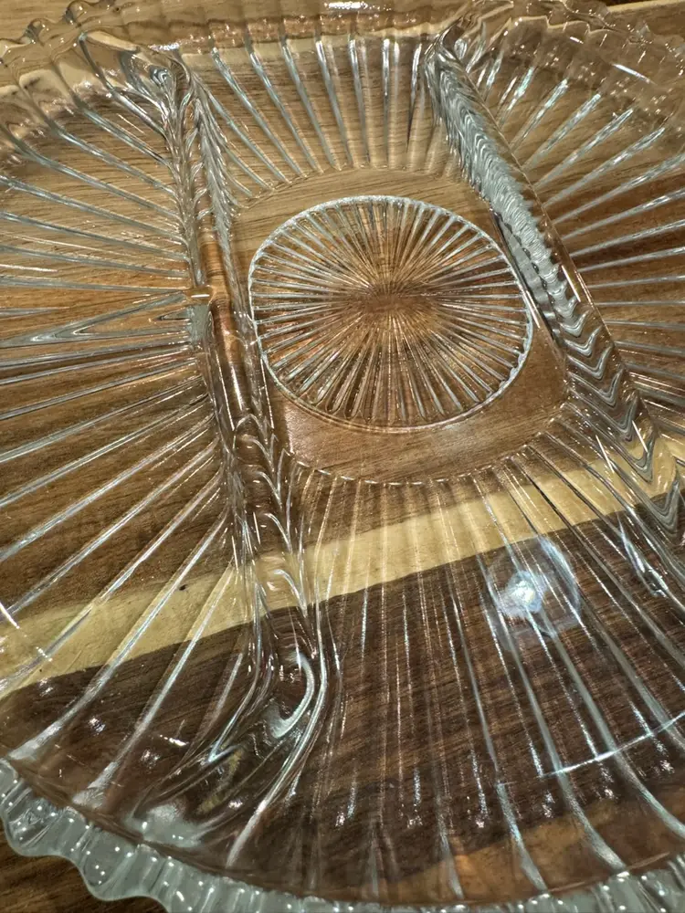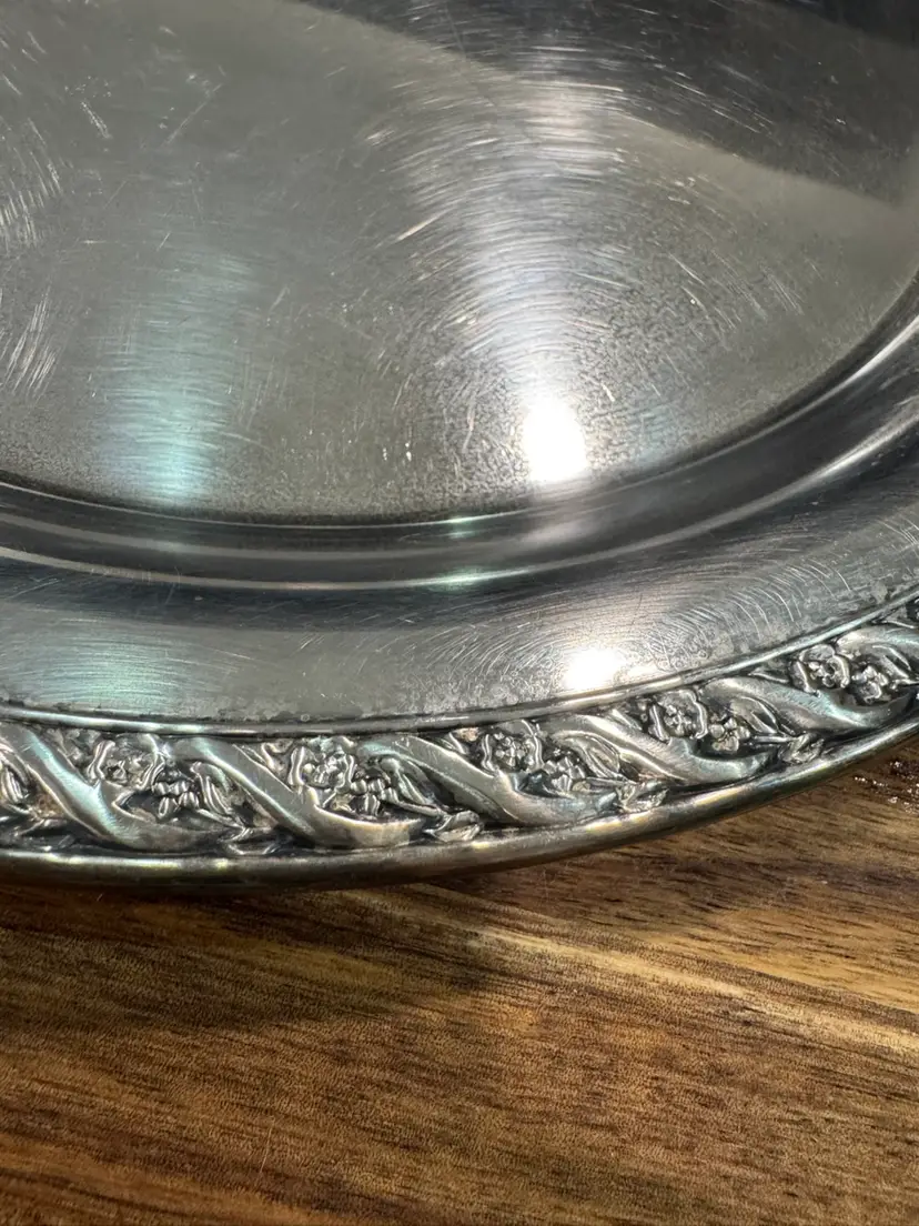 So pretty! Beautiful border on the silver tray. Fluted glass insert. 12” diameter.