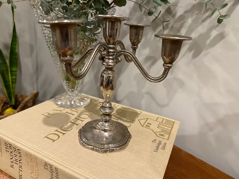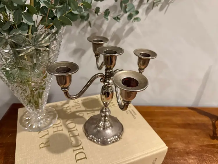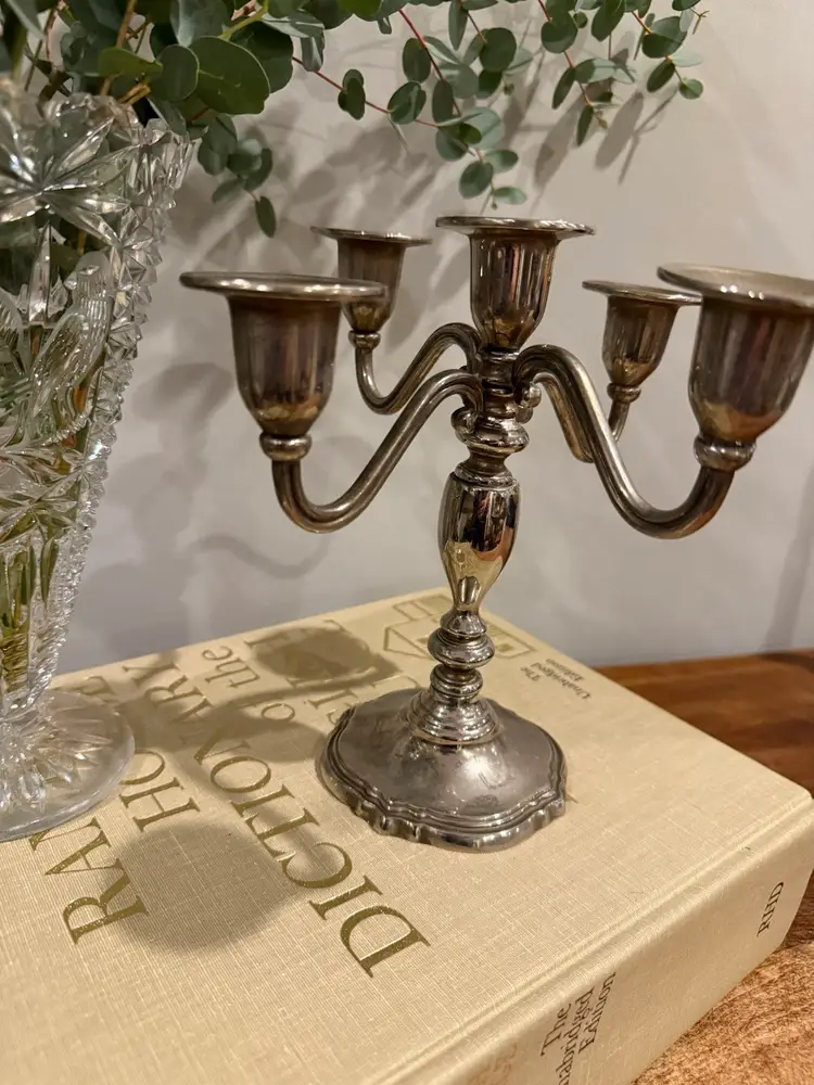 This elegant silver-plated candelabra is a stunning centerpiece, featuring a five-cup design perfect for holding multiple candles. The intricate details and polished finish make it a beautiful decorative item.