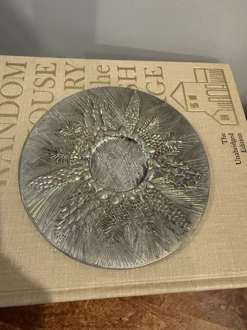 Add a touch of elegance to your dining experience with this beautiful silver-plated charger plate. Made in China, this decorative serving tray features an intricate etched design, perfect for special occasions or everyday sophistication. The silver plating shows minor wear consistent with light use, adding to its vintage charm. Elevate your dinner table with this unique piece, also great for display.