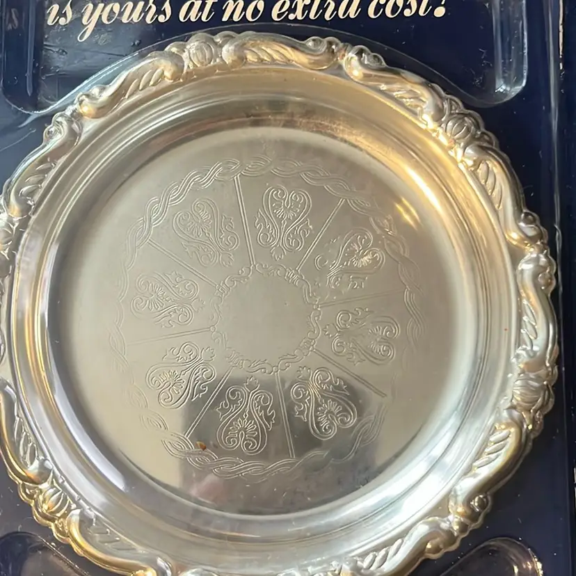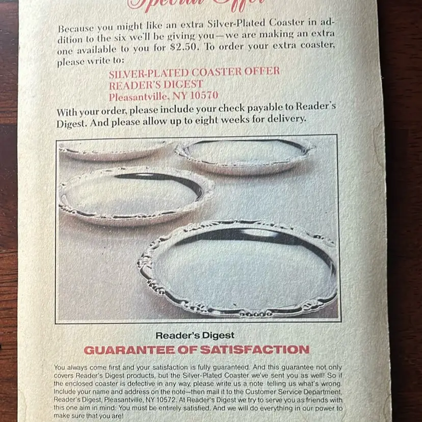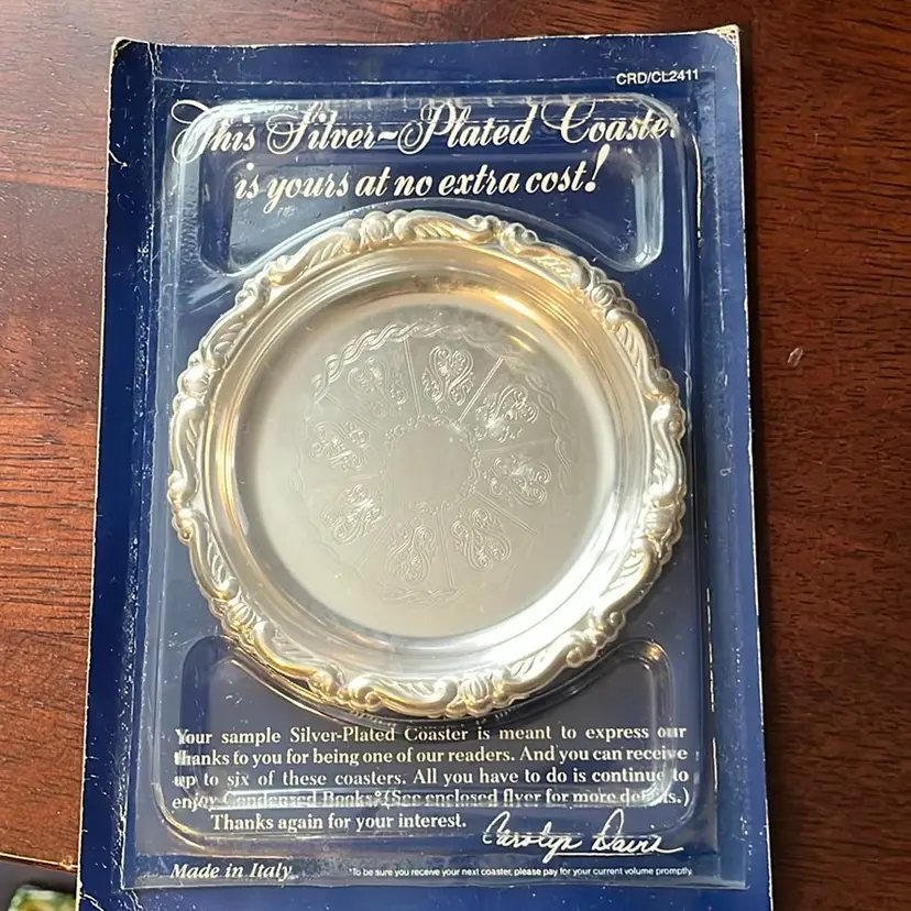 In the late 1980s, Reader's Digest offered these silver-plated coasters as a promotional item to its readers. These coasters were made in Italy and feature a simple design. They were intended as a small token of appreciation for their readership. The coasters are not made of solid silver, but rather silver-plated base metal.