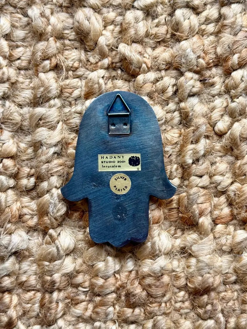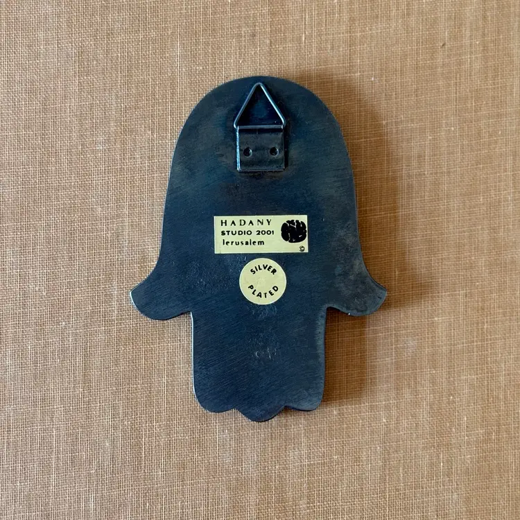 Vintage silver-plated Hamsa wall hanging from Hadany Studio (2001), Jerusalem, complete with its original cobalt blue presentation box. This design features Hadany’s signature sculptural lines, raised detailing, and a central star motif. A substantial piece at 153 grams and approx. 4.75” tall, with the original studio labels still intact on the reverse.