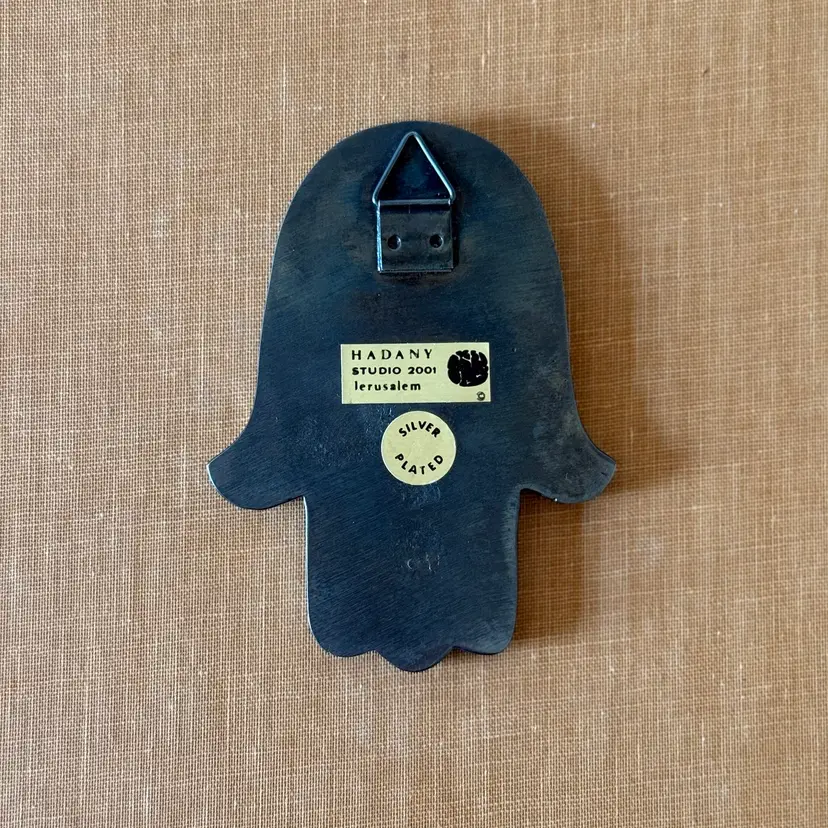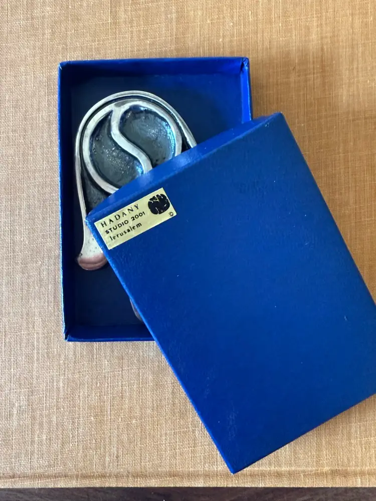 Details: • Silver-plated metal • Marked “Hadany Studio 2001 Jerusalem” • Includes original box • Built-in metal hanger • Weight: 153 g • Height: approx. 4.75” • Condition: Very good vintage condition with natural patina