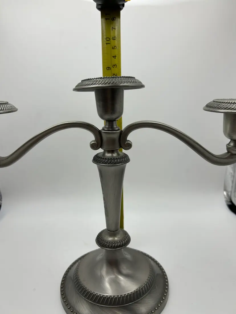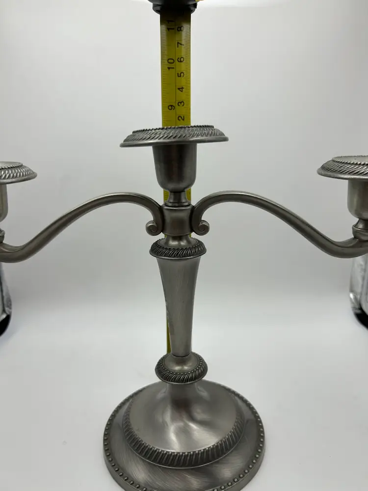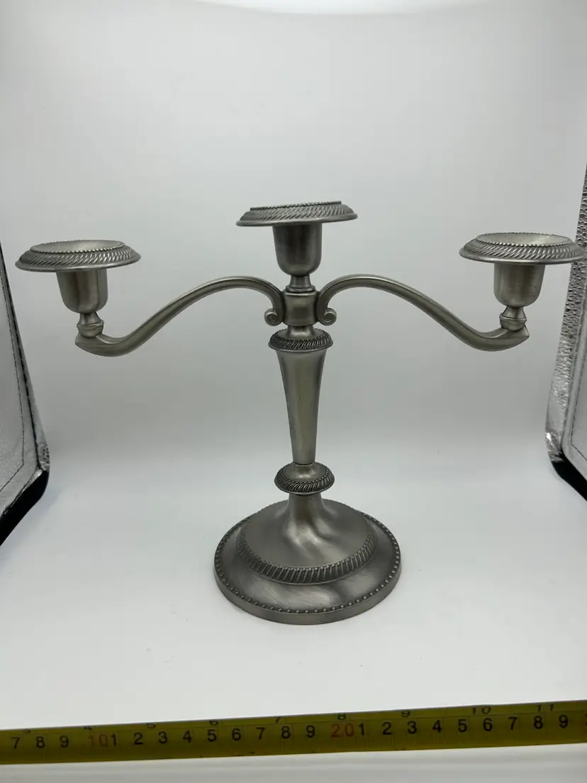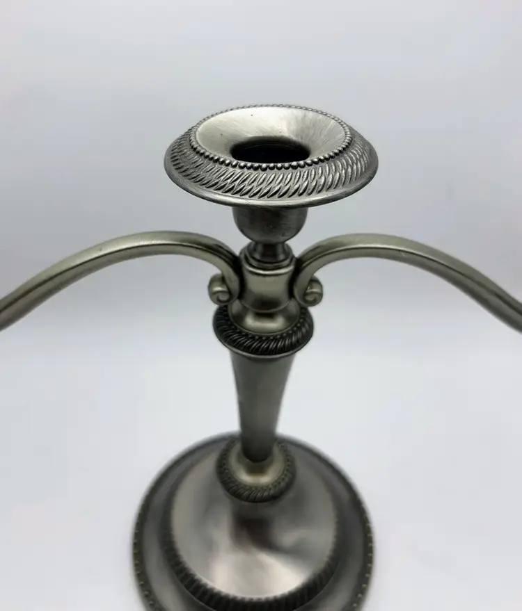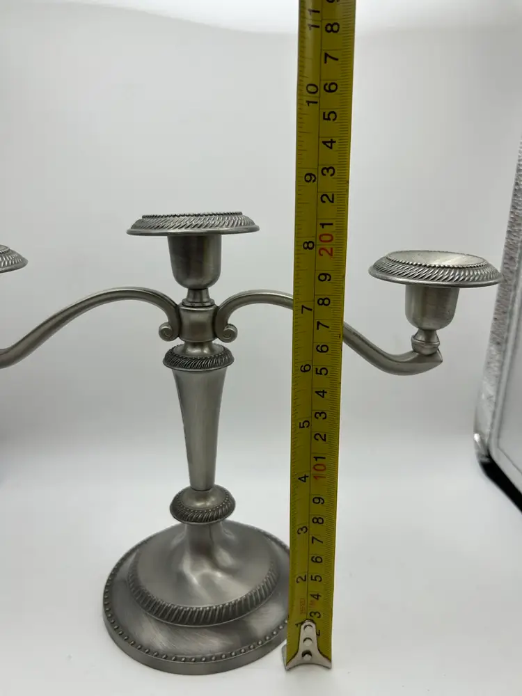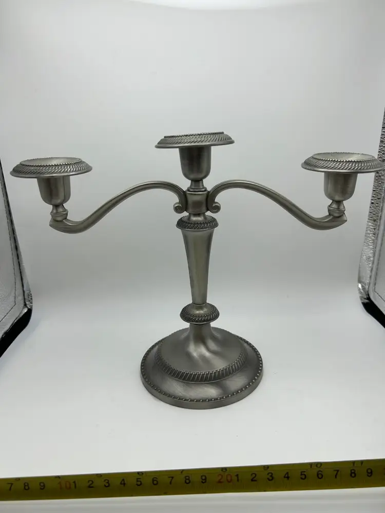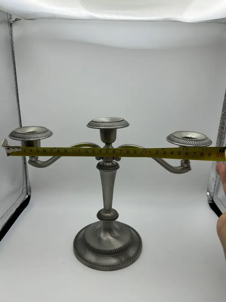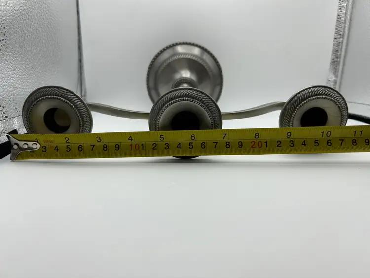 This vintage silver-plated candelabra is perfect for adding a touch of elegance to any room. With its ornate design and three branches, it is suitable for tapered candles and fits in with any decor, whether it's Art Deco, MCM or contemporary. The candelabra is a medium-sized, silver-colored piece that weighs 1 lb 3.8 oz and stands at 8.5 inches tall, with an item width of 11 inches.