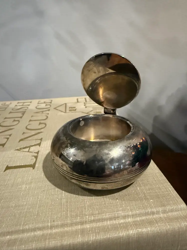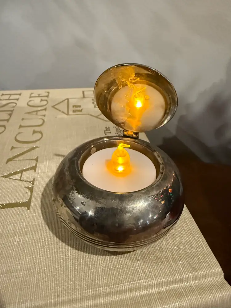 Add a touch of vintage elegance to your home with this silver plated votive candle holder. Measuring 3 inches, this round holder features a convenient lid and was crafted in India. Its classic design makes it a versatile piece for various decor styles. It can be used for candles or other small treasures. The candle holder is in very good vintage condition.
