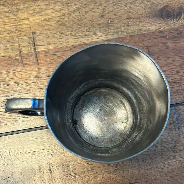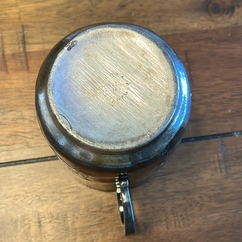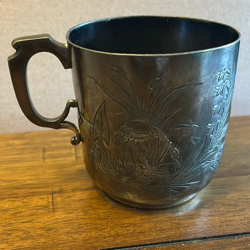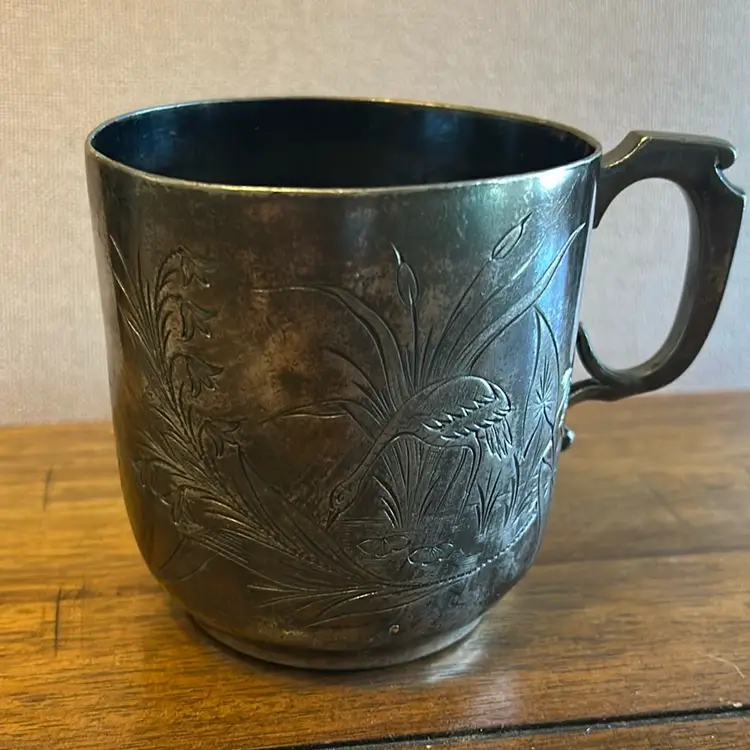 This is a sliver plated mug with etched crane birds and it is stamped on the bottom. It is about 3.5 inches in hight.