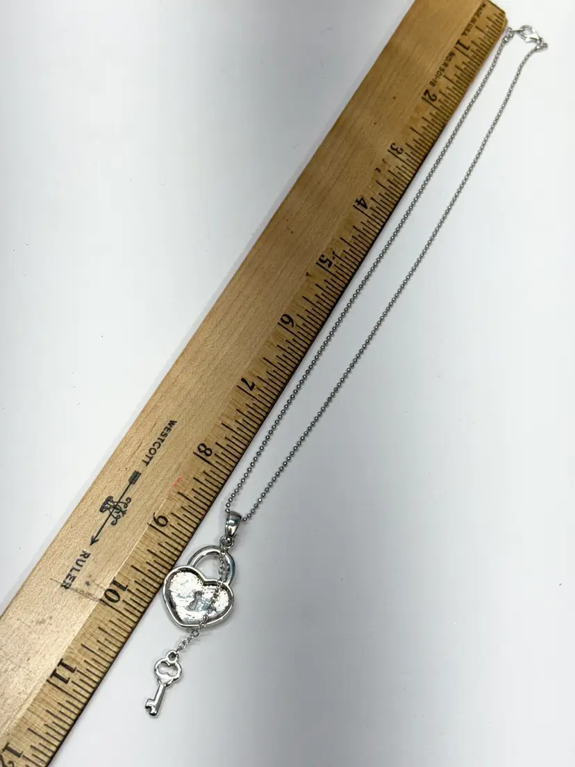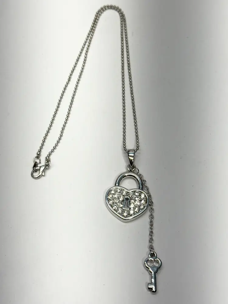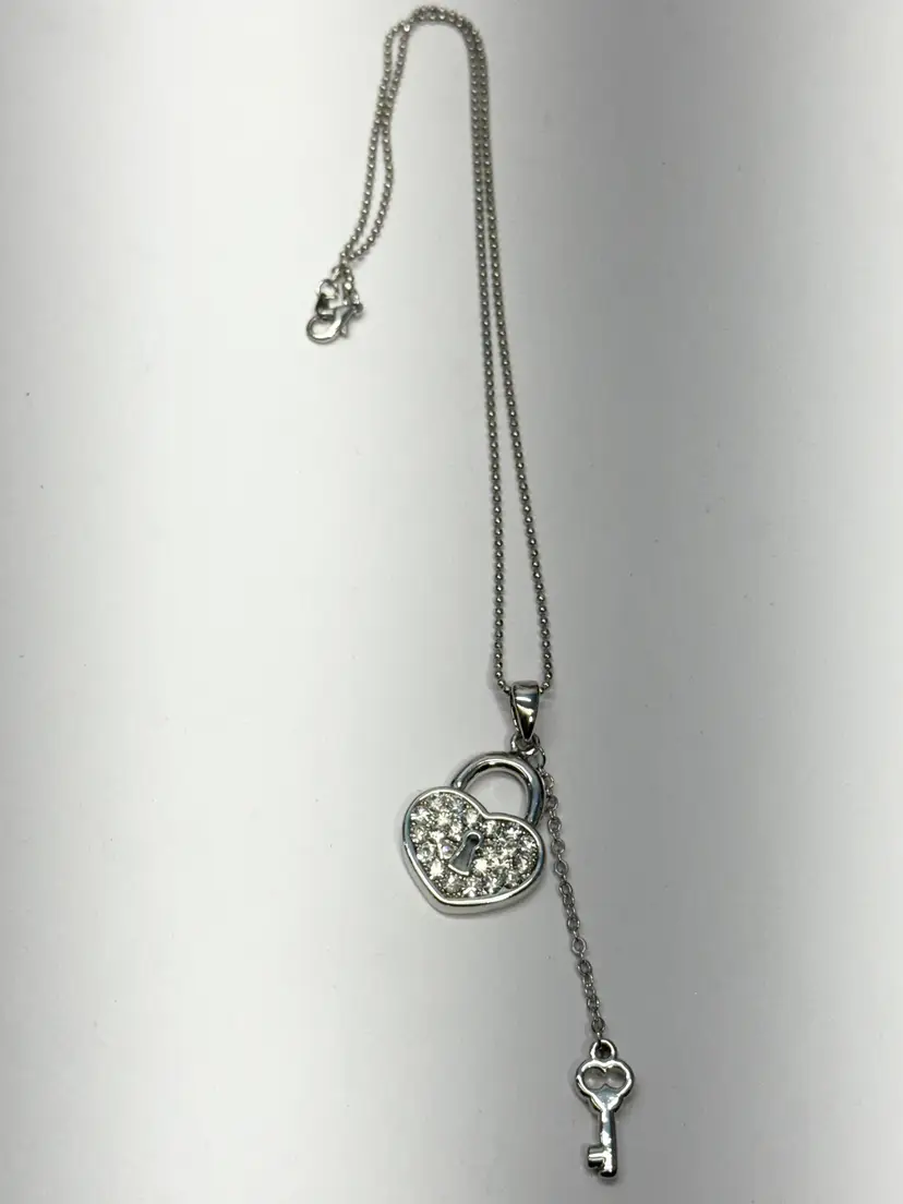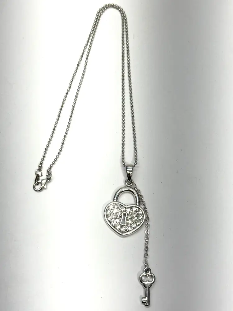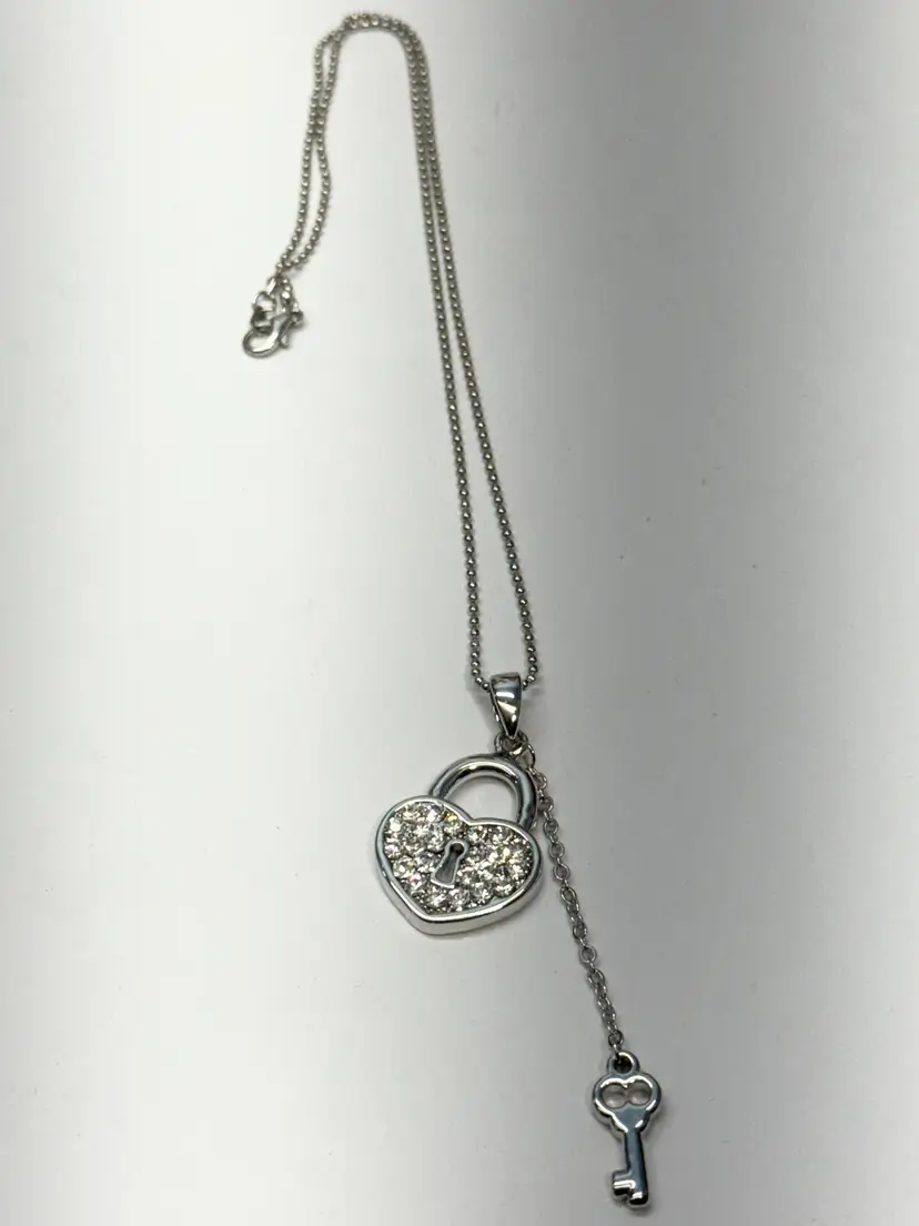 Silver rhinestone heart and key charm necklace. Rhinestone heart lock and key hanging charm necklace. Silver tone necklace. MN55GH.