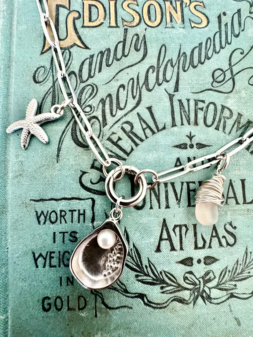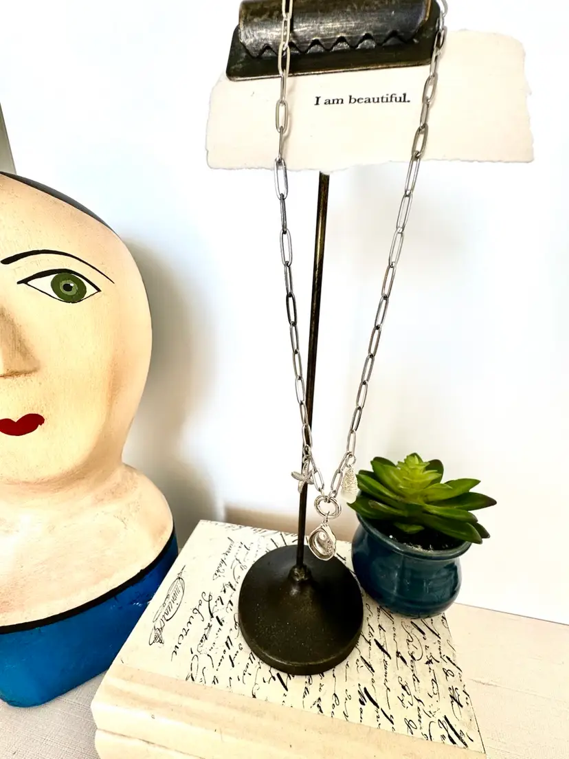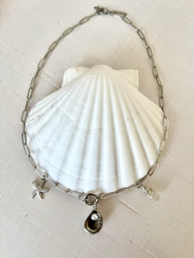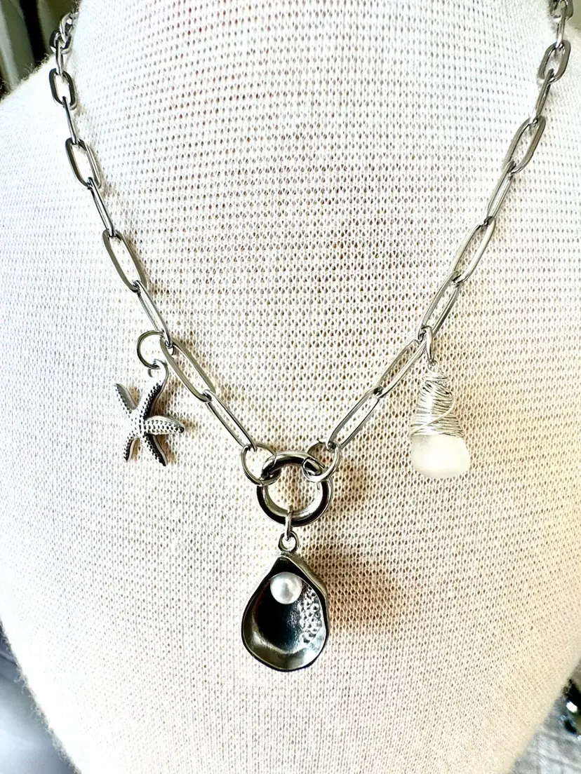 20” with shell charm Paperclip dainty Silver pvd over stainless for non tarnish wear Hand wrapped Sterling Silver Sea Glass Removable shell charm as well as charm holder.