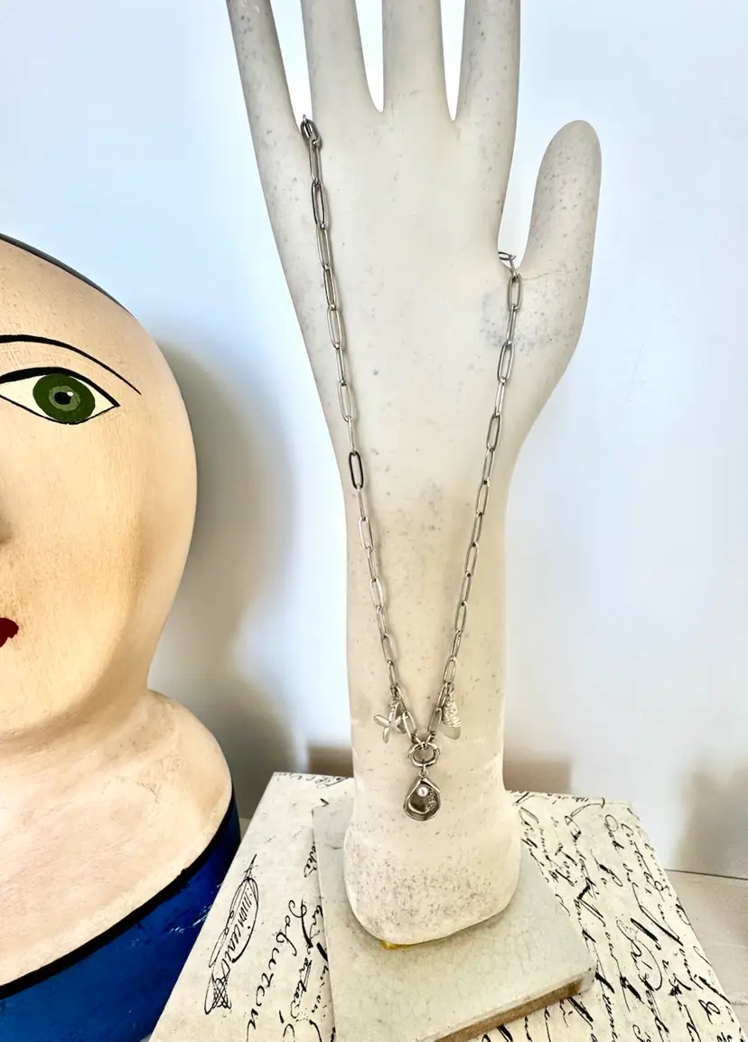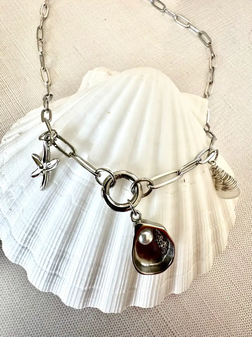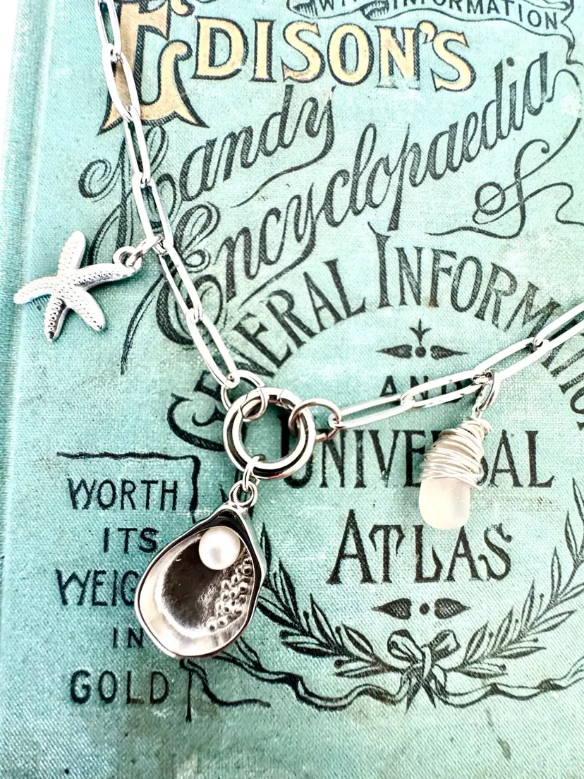 20” with shell charm Paperclip dainty Silver pvd over stainless for non tarnish wear Hand wrapped Sterling Silver Sea Glass Removable shell charm as well as charm holder.
