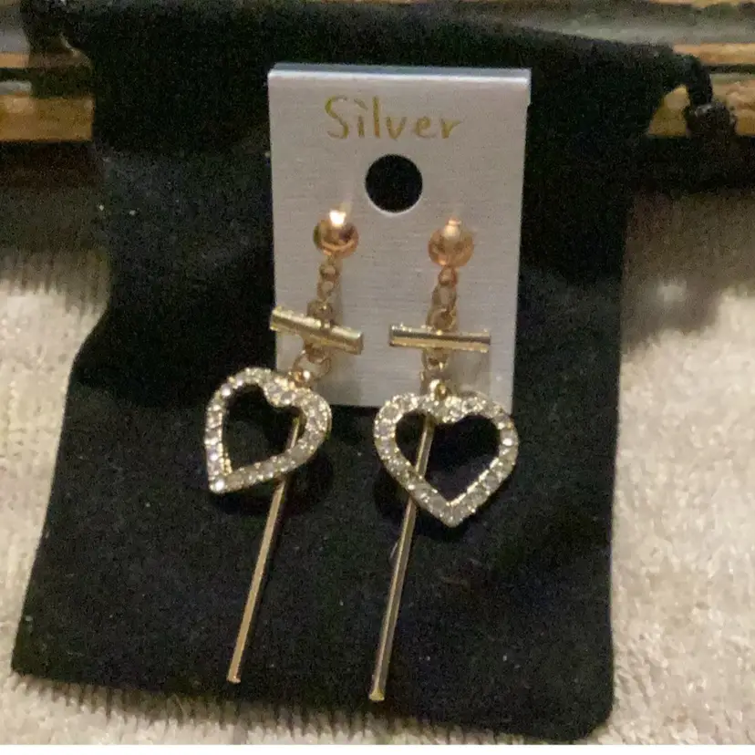 The paper says silver, but they’re not silver. These are gold toned, but beautiful little teardrops with hearts and a long gold piece.