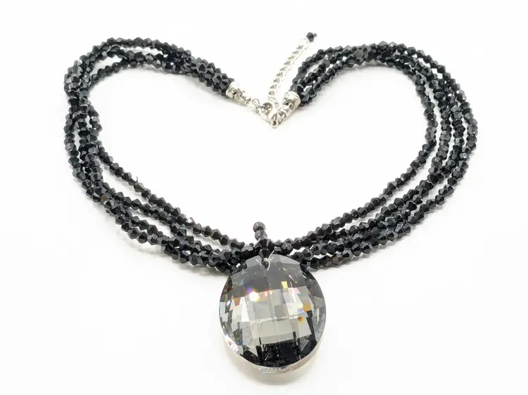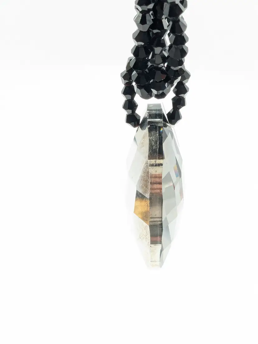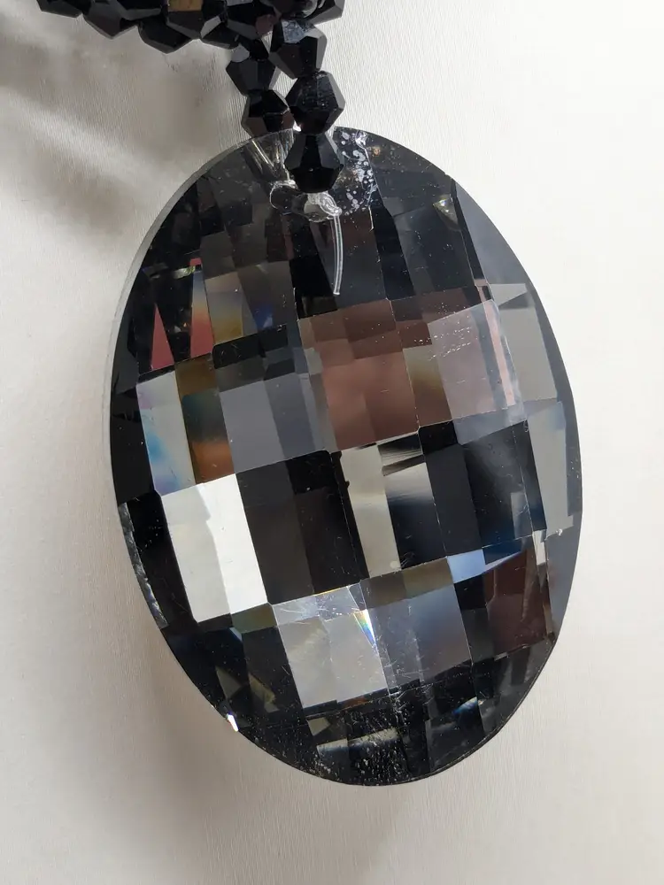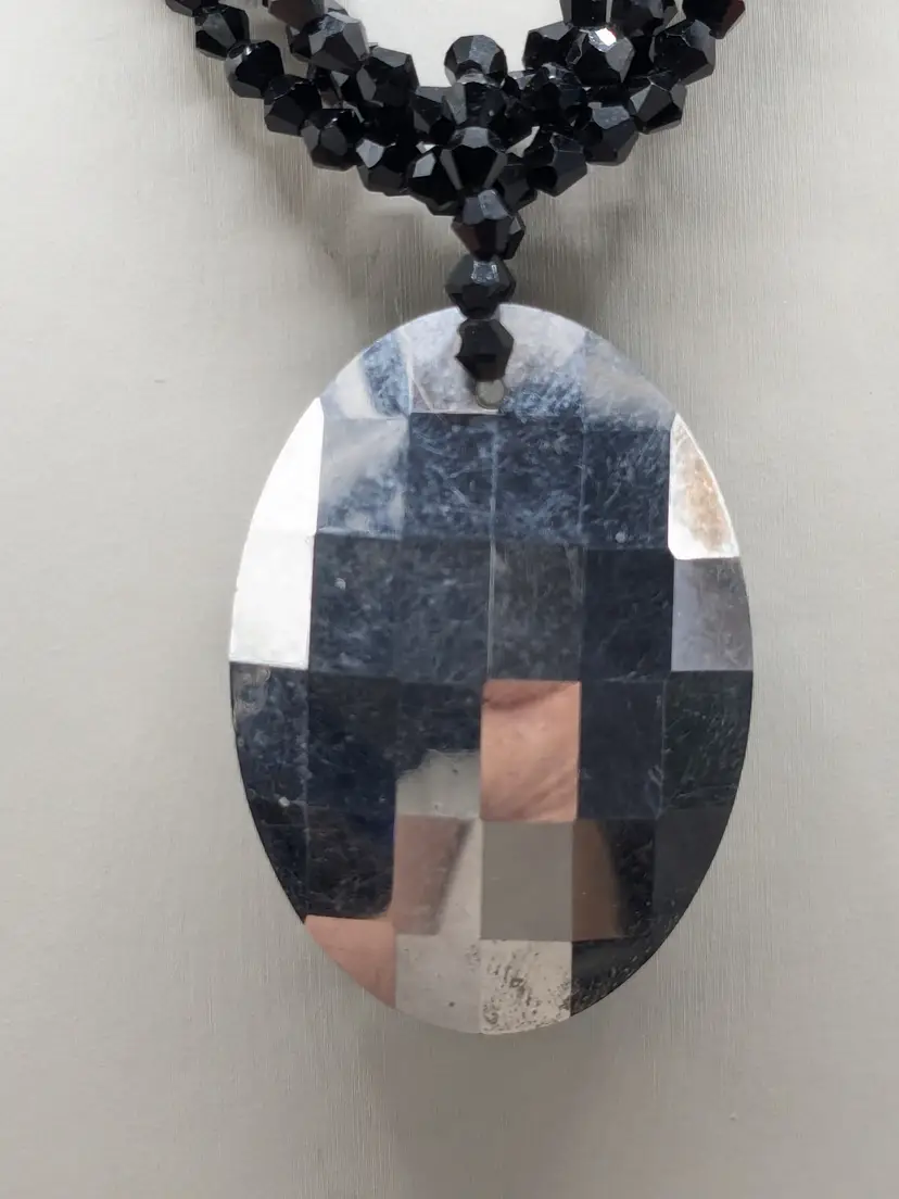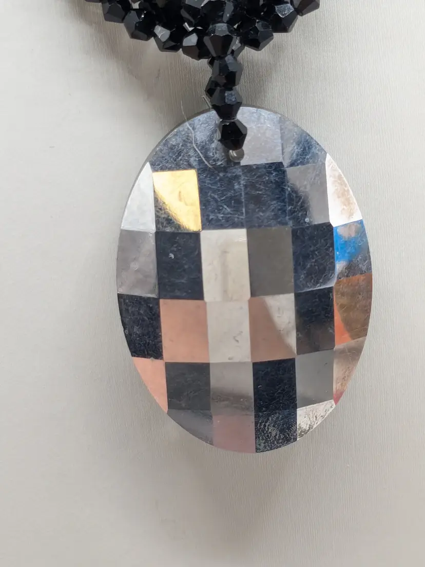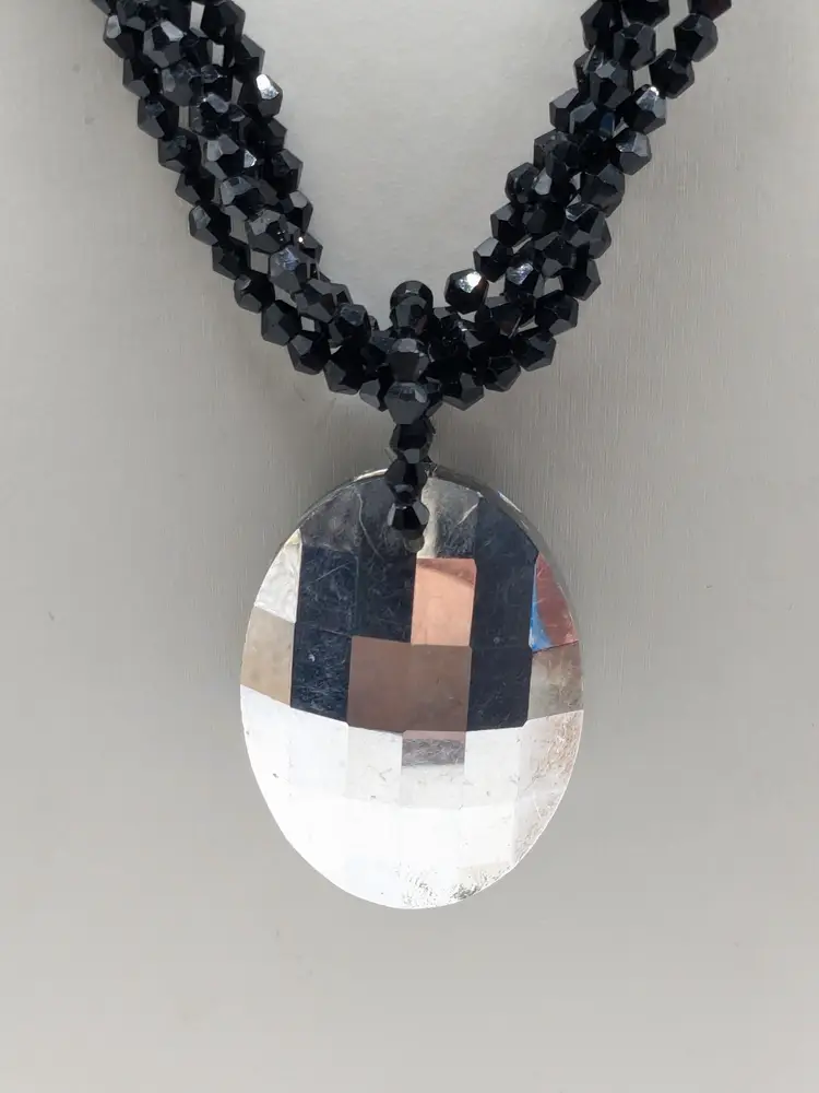 Good condition. READ: Some scratches and scuffs on pendant. Depicted in the last photo is a piece of knotted plastic used in the making of the necklace, which needs to be trimmed and put back in place. Features a large glass faceted pendant, silver tone on one side and smokey color on the other. Necklace is comprised of faceted black glass beads. Pendant measures 2" in length and 1 1/2" wide. Necklace measures 20" with a 3" extension. EN3