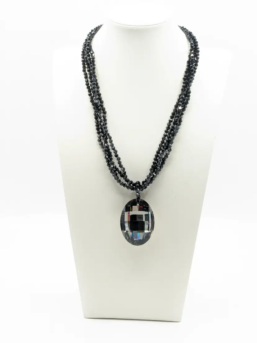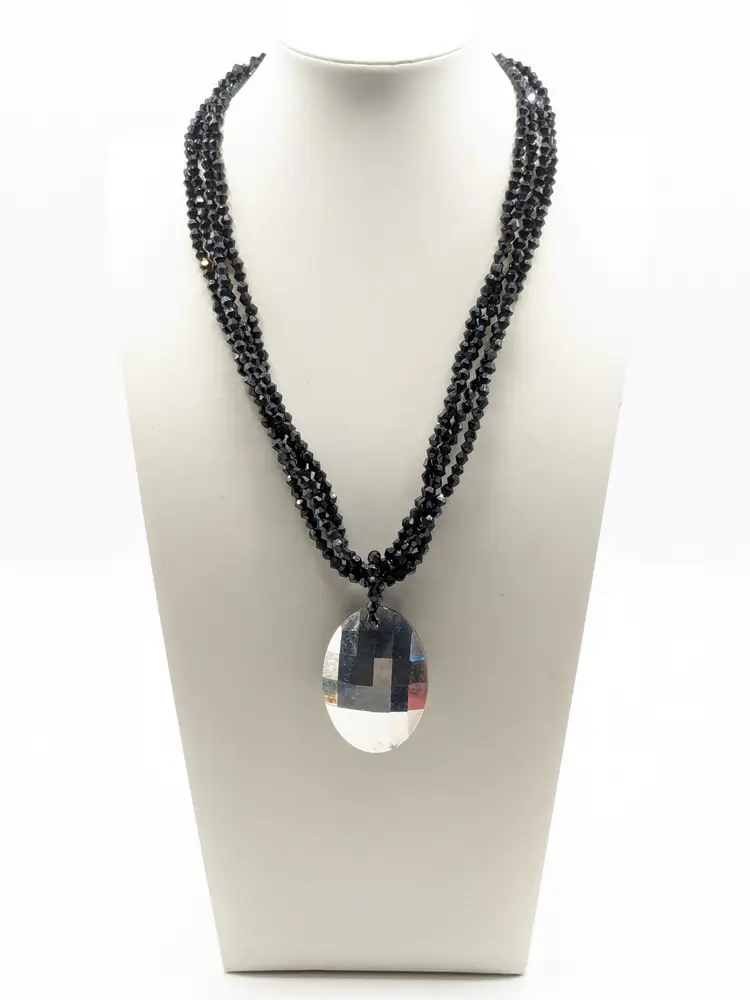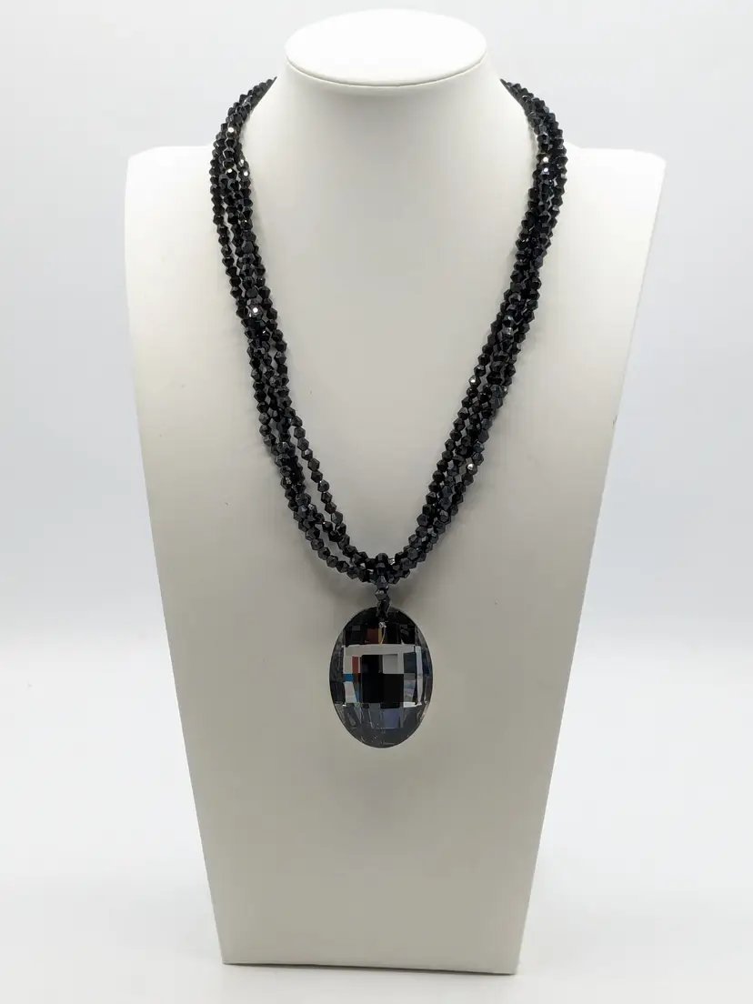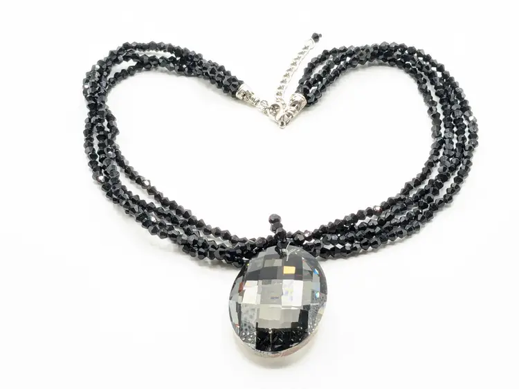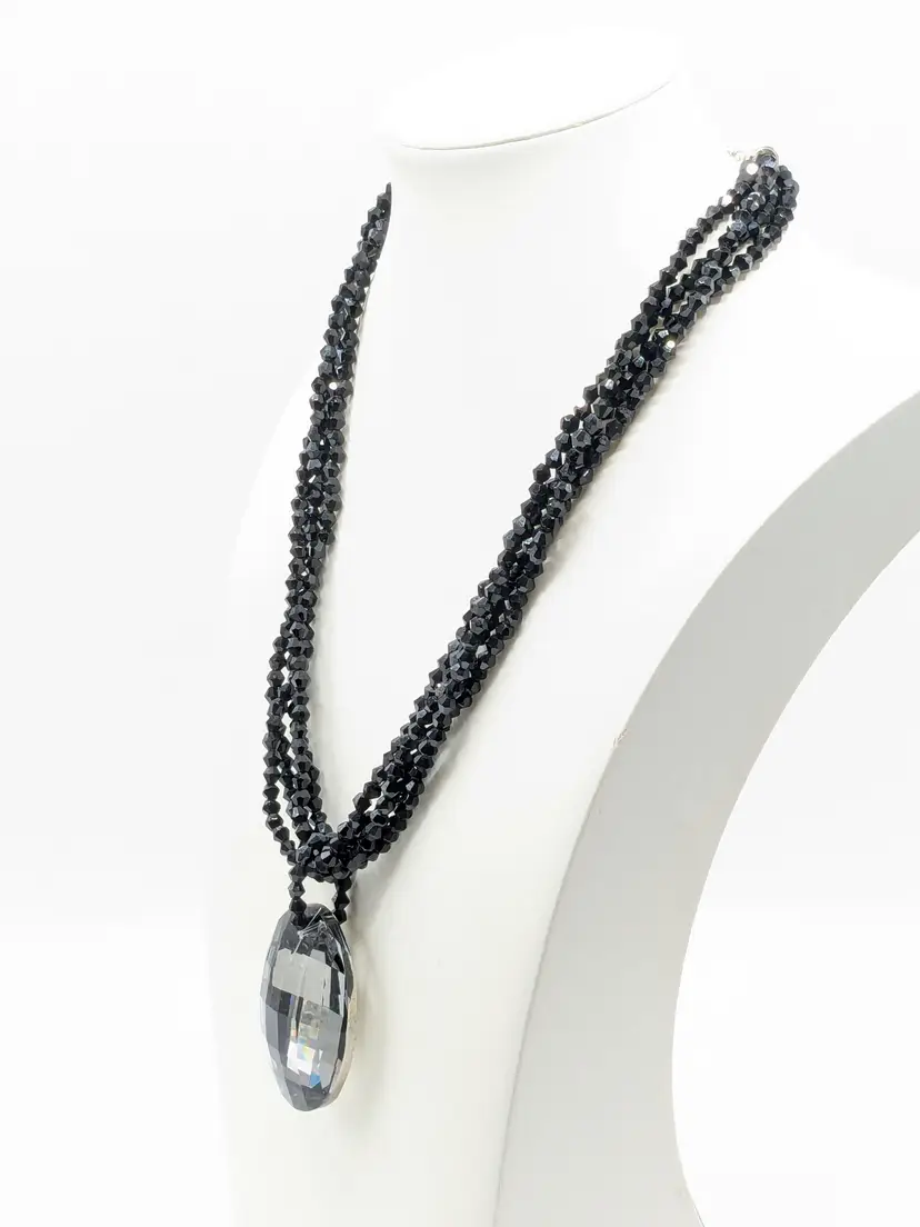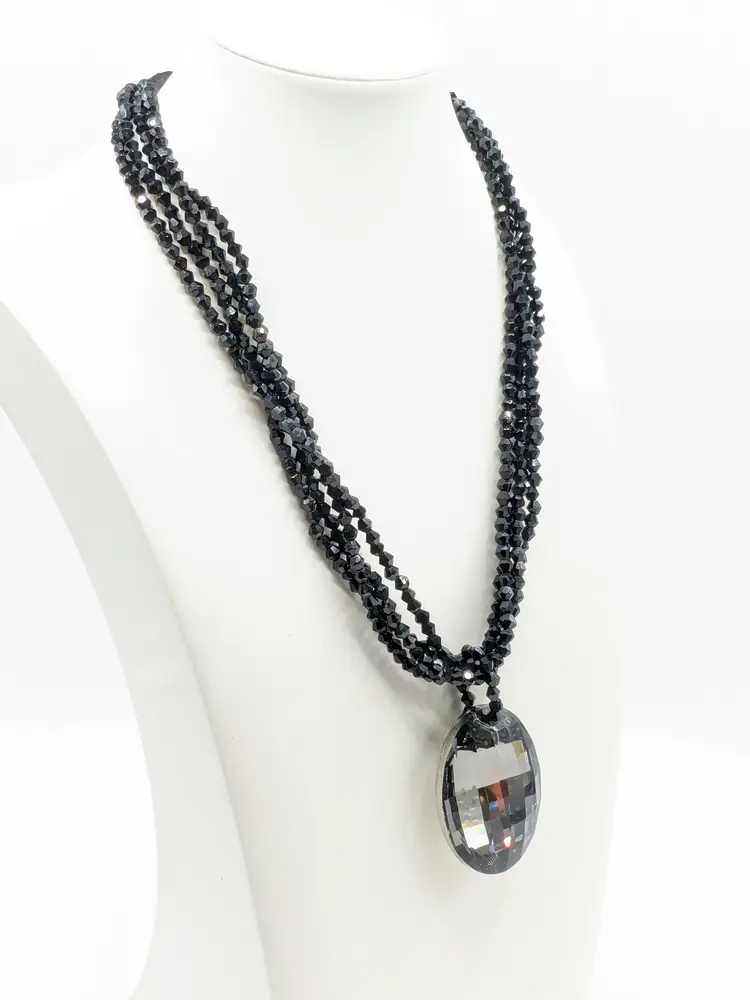 Good condition. READ: Some scratches and scuffs on pendant. Depicted in the last photo is a piece of knotted plastic used in the making of the necklace, which needs to be trimmed and put back in place. Features a large glass faceted pendant, silver tone on one side and smokey color on the other. Necklace is comprised of faceted black glass beads. Pendant measures 2" in length and 1 1/2" wide. Necklace measures 20" with a 3" extension. EN3