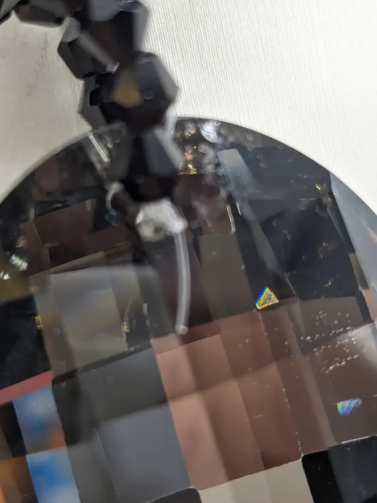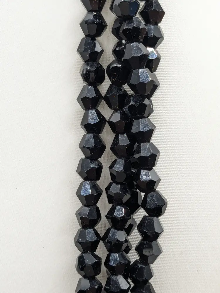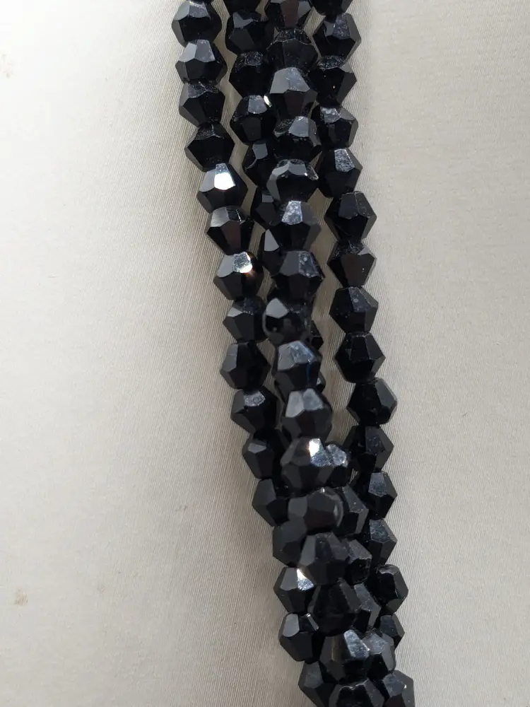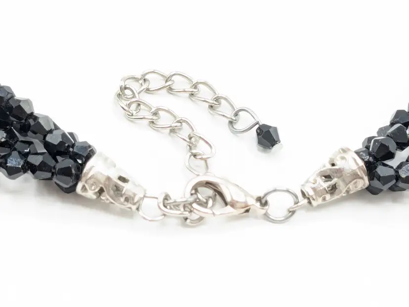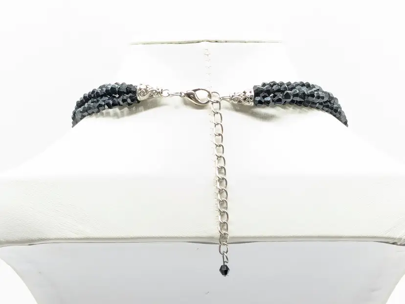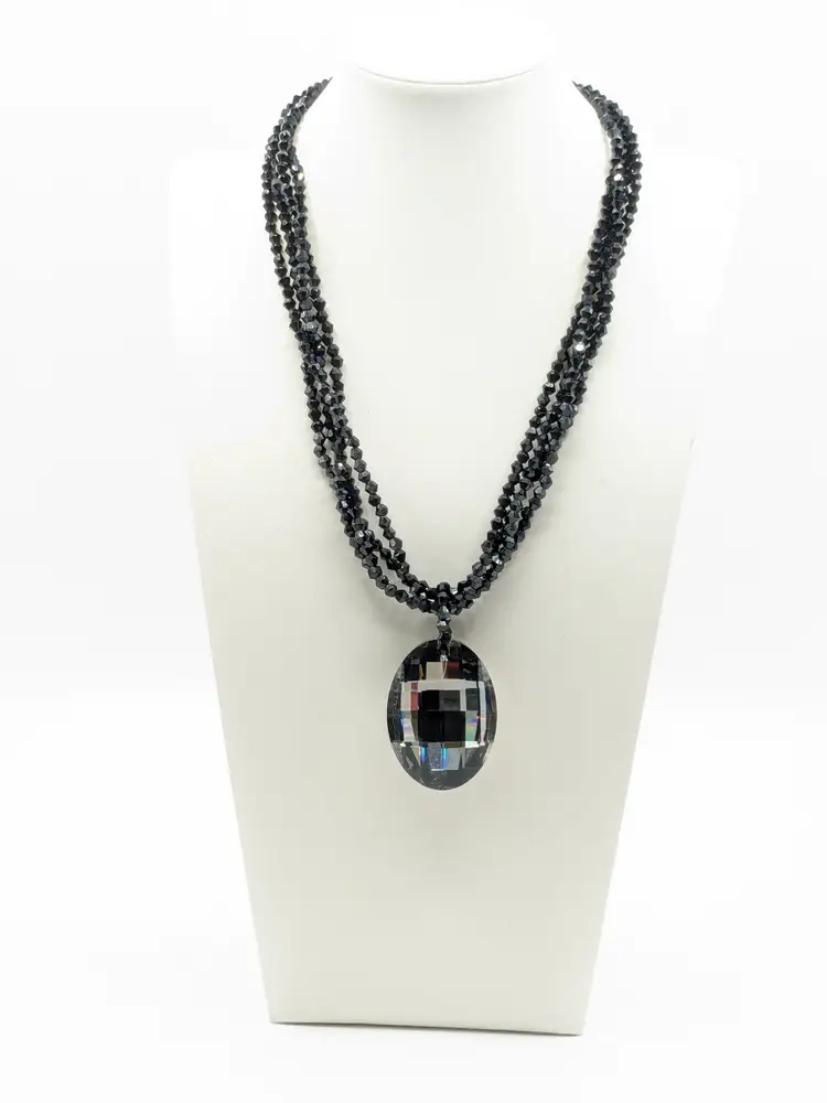 Good condition. READ: Some scratches and scuffs on pendant. Depicted in the last photo is a piece of knotted plastic used in the making of the necklace, which needs to be trimmed and put back in place. Features a large glass faceted pendant, silver tone on one side and smokey color on the other. Necklace is comprised of faceted black glass beads. Pendant measures 2" in length and 1 1/2" wide. Necklace measures 20" with a 3" extension. EN3
