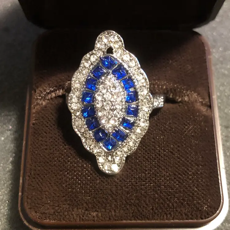 Silver-Tone Blue and Clear Stone Ring Statement Cocktail Ring Size 7.5