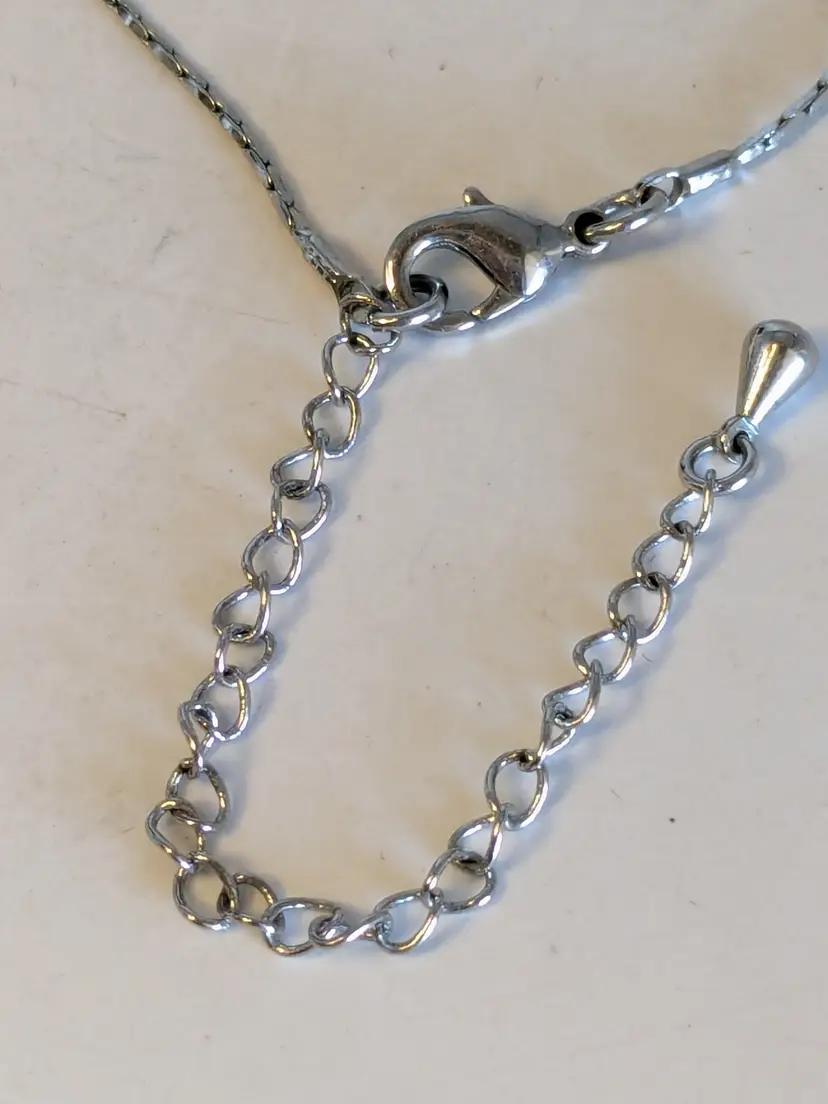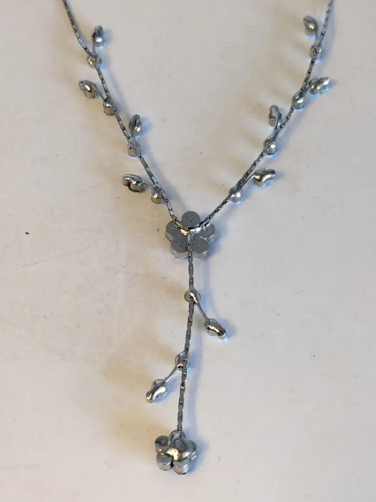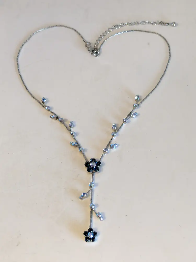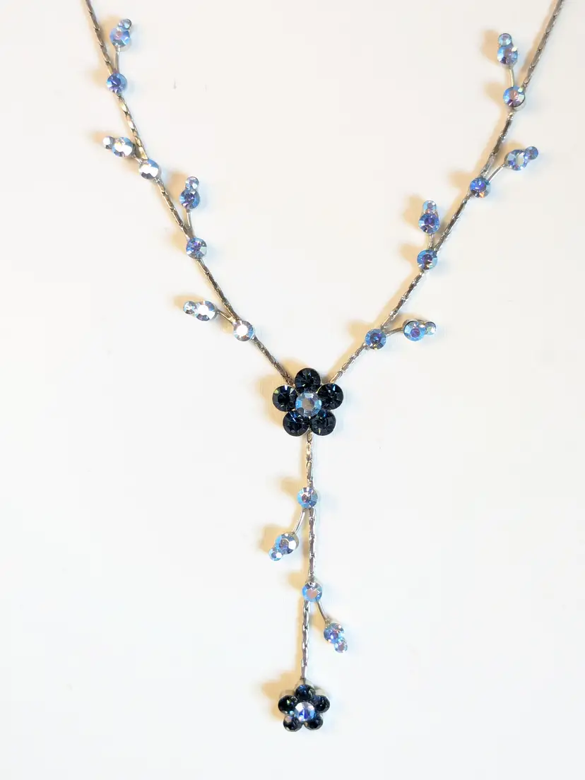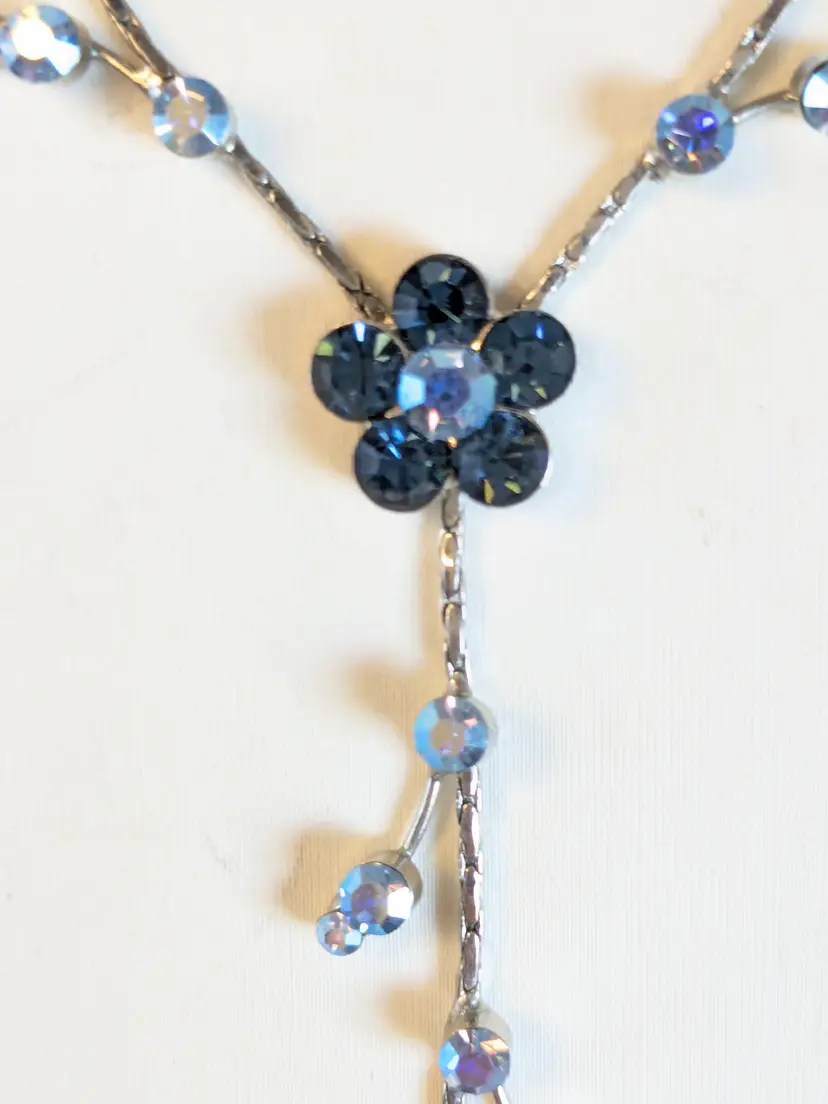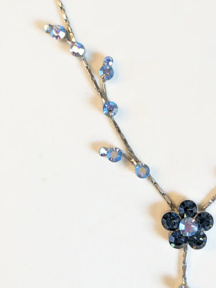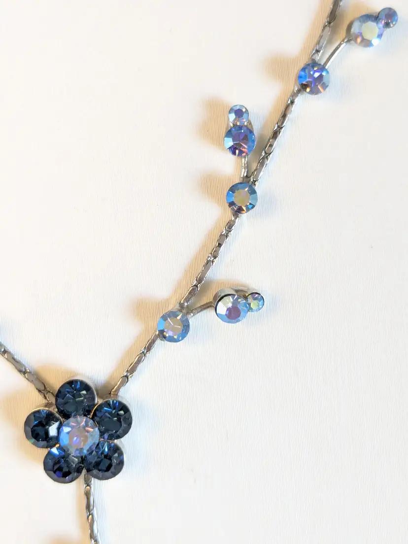 Dainty Floral Necklace! Good condition. Features sparkling blue crystals in a floral design with a delicate drop. Silver tone with no color loss. Measures 16" with a 3" extension. 2" drop. wen