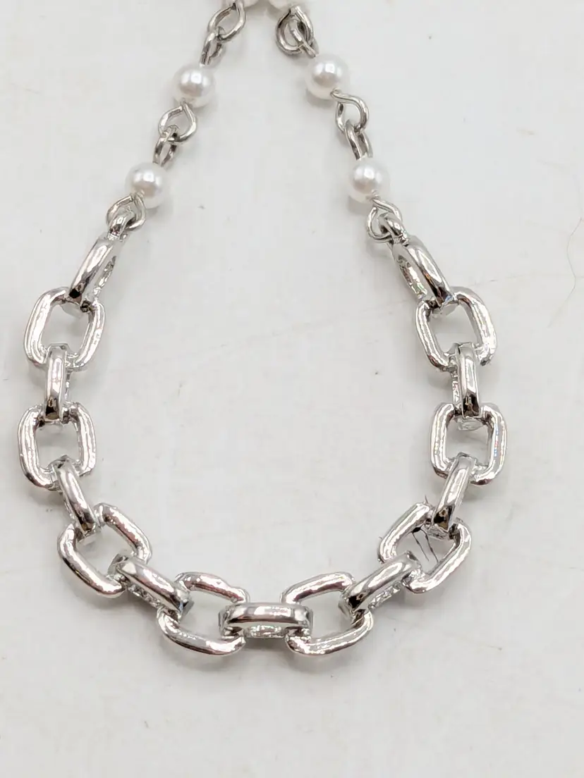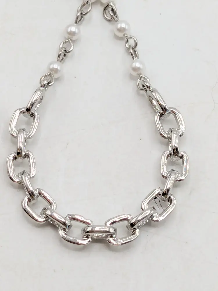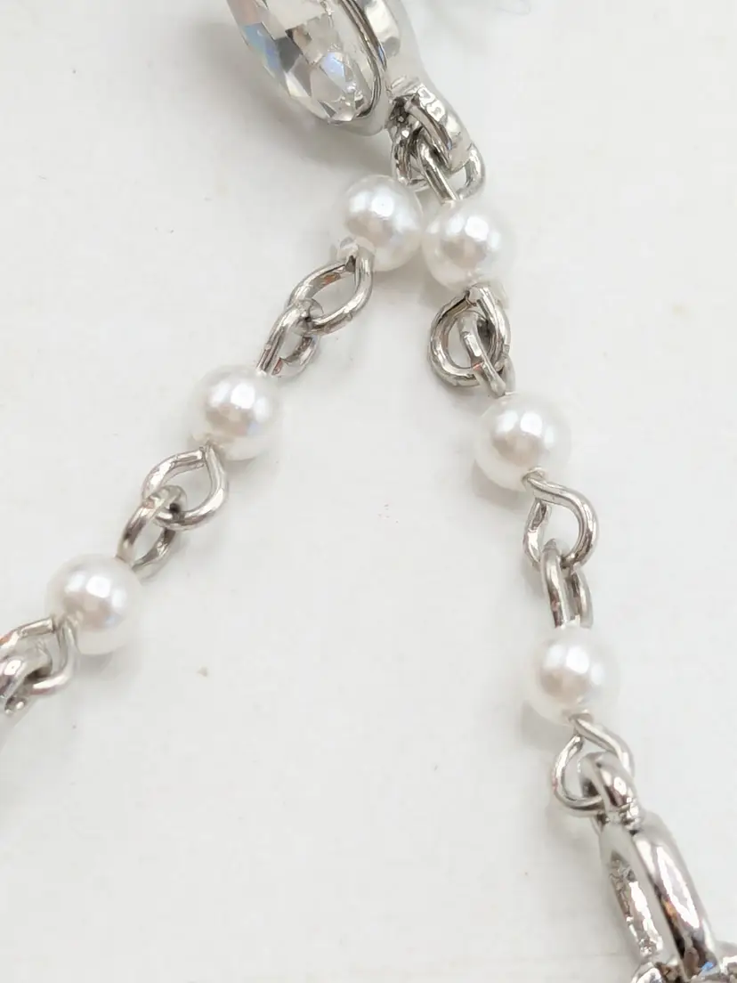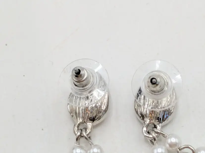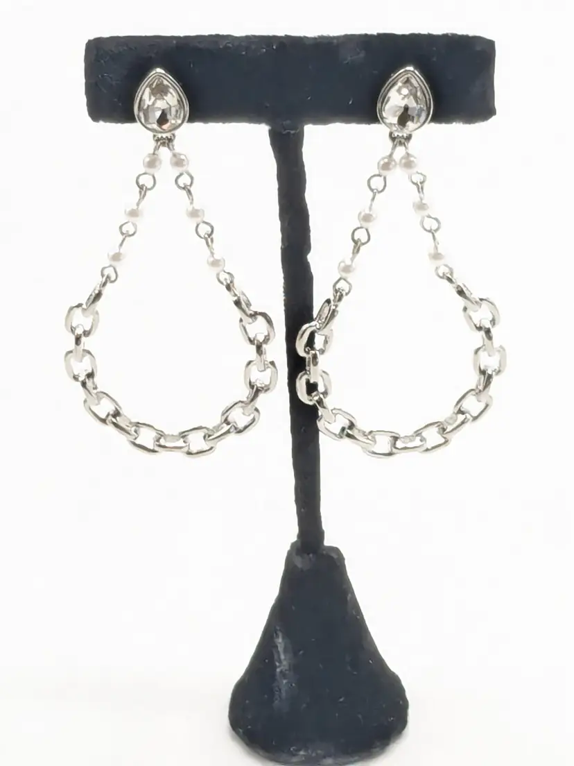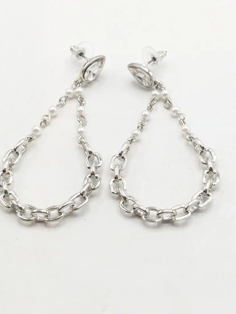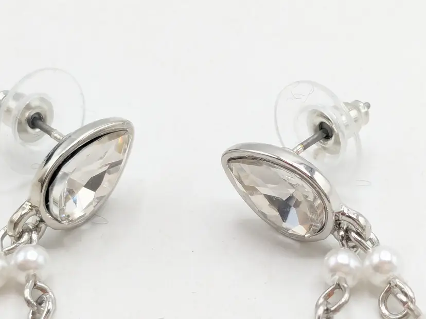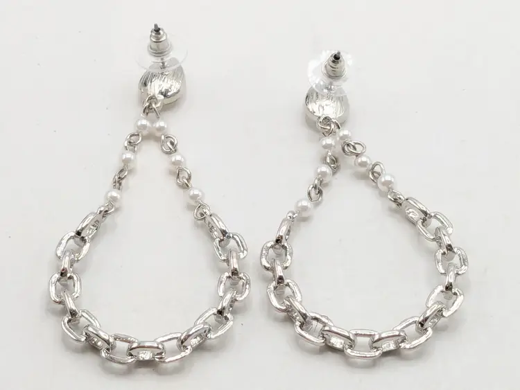 Good condition. Features sparkling rhinestones and faux pearls with a stylish chain drop design. Silver tone is bright and shiny with no color loss. Measures 2 3/4" in length and 1 3/8" wide. wen