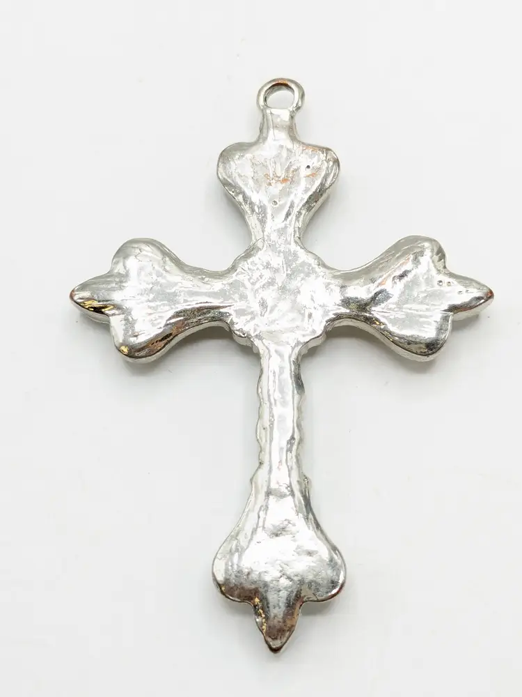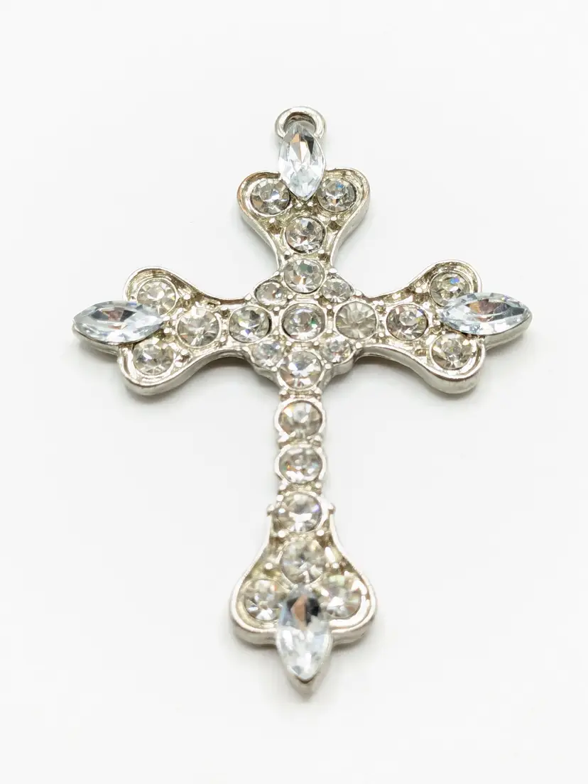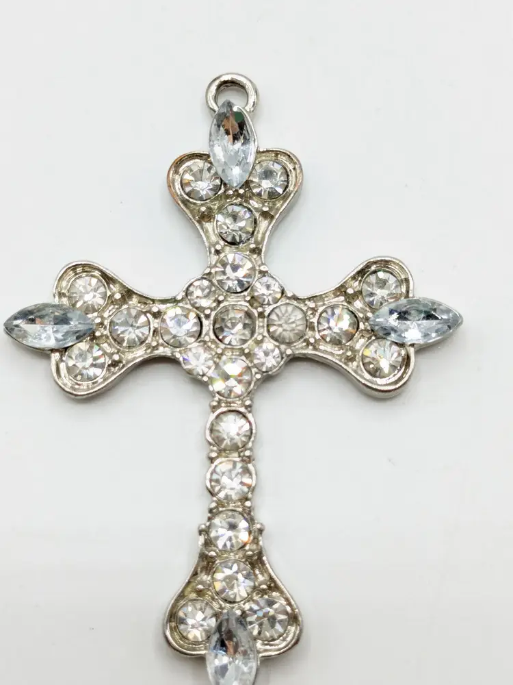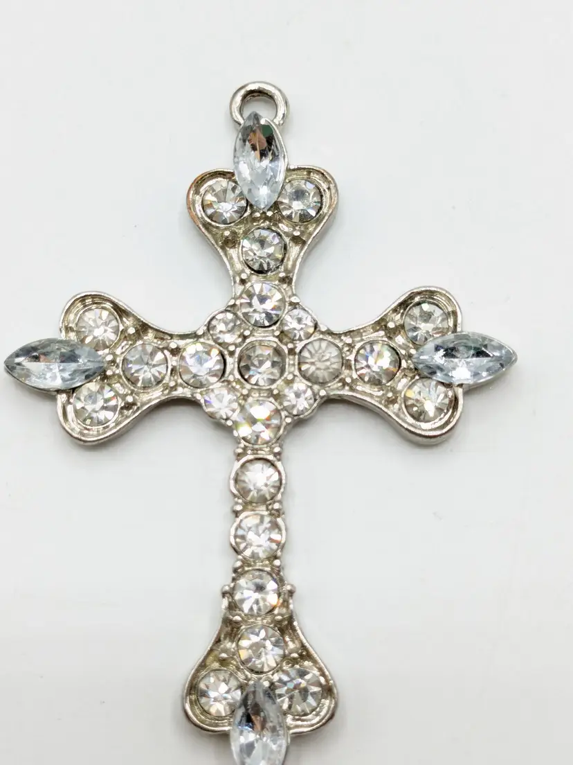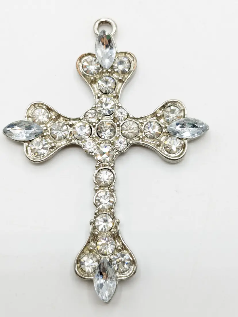 Good condition. All rhinestones are present and sparkly. Silver color is bright and shiny. Measures 2 1/2" length x 2" wide.