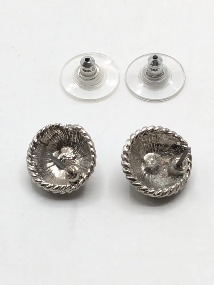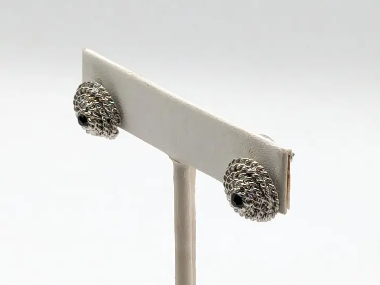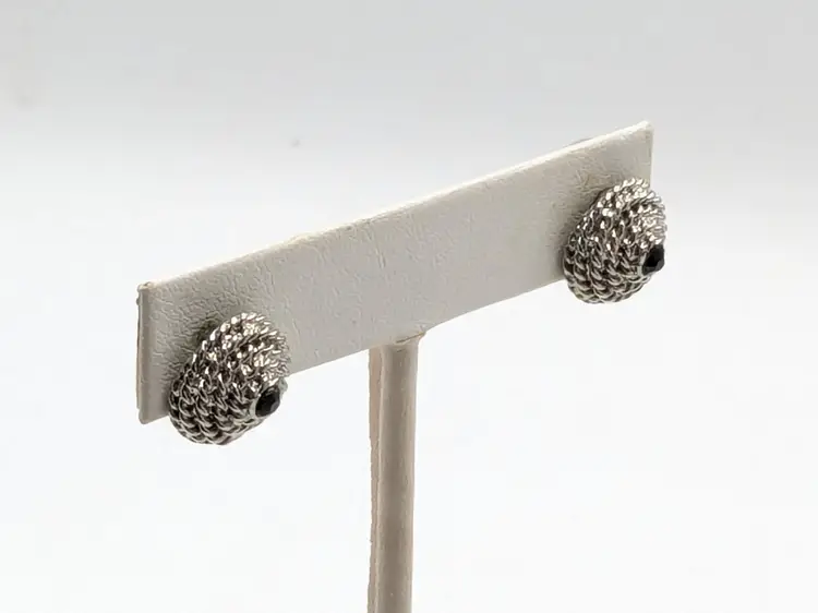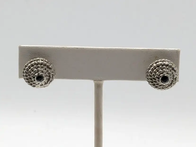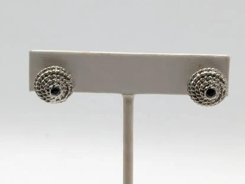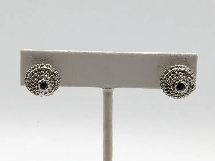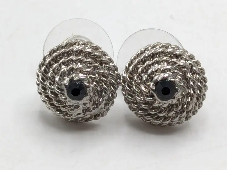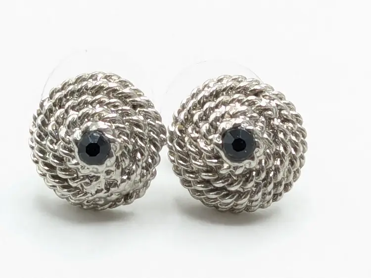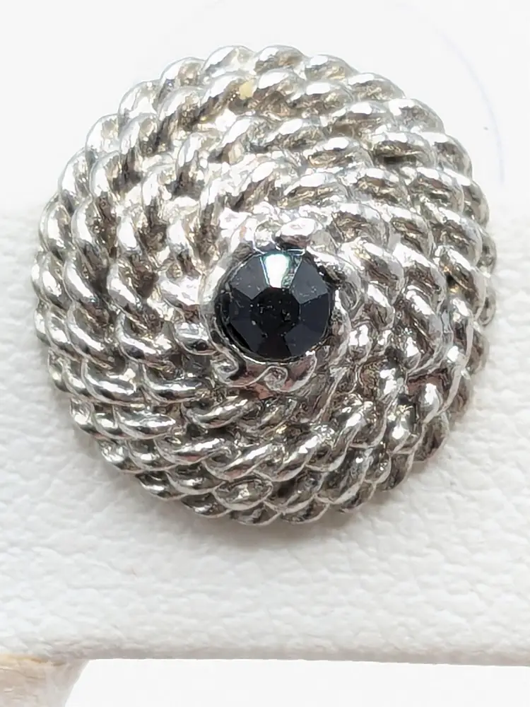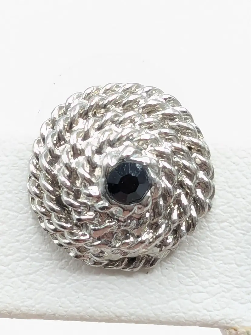 Good condition. Features a unique spiral rope design with a central black stone. Perfect for adding a touch of elegance to any outfit. Measures approximately 1/2 inch in diameter. EN2