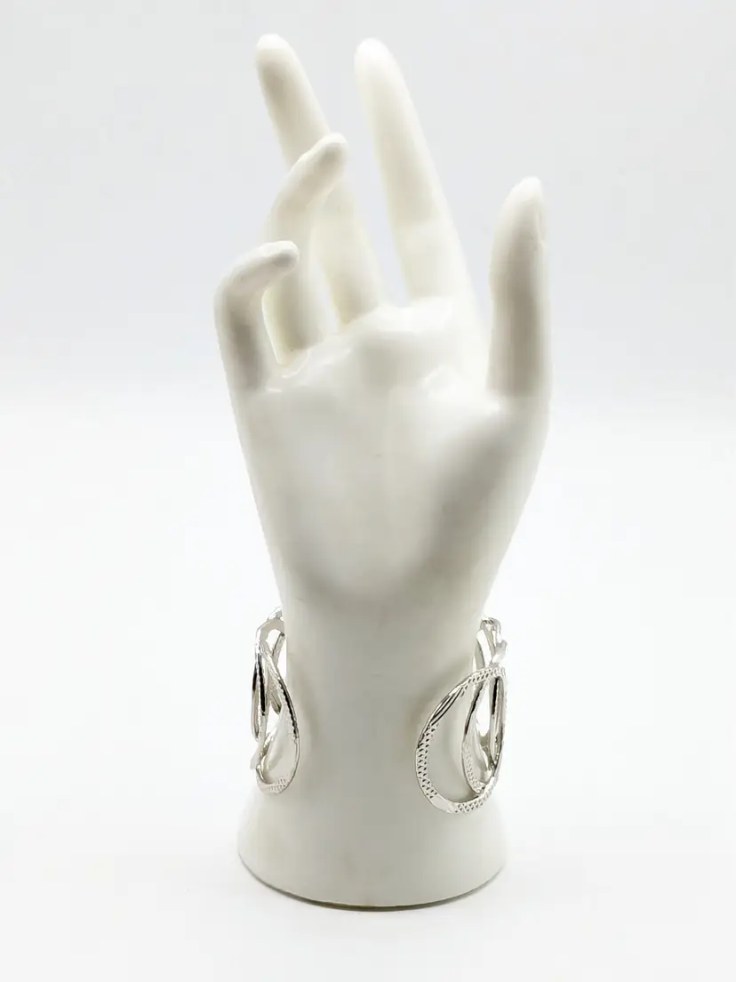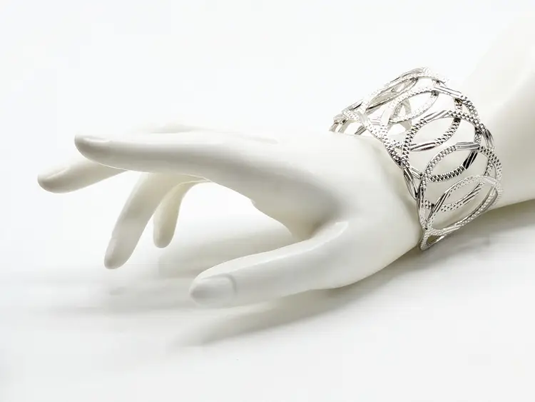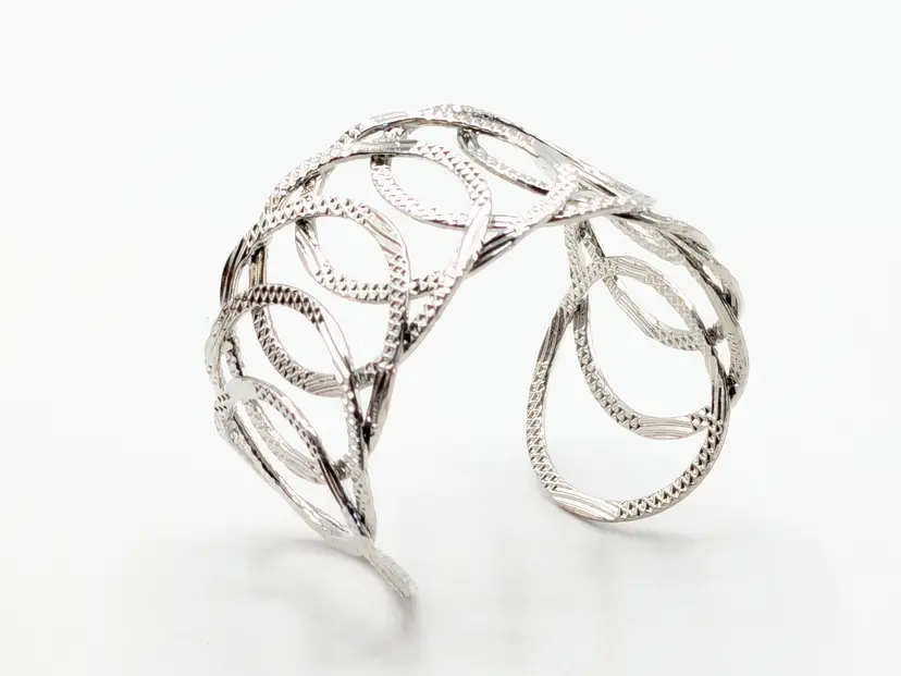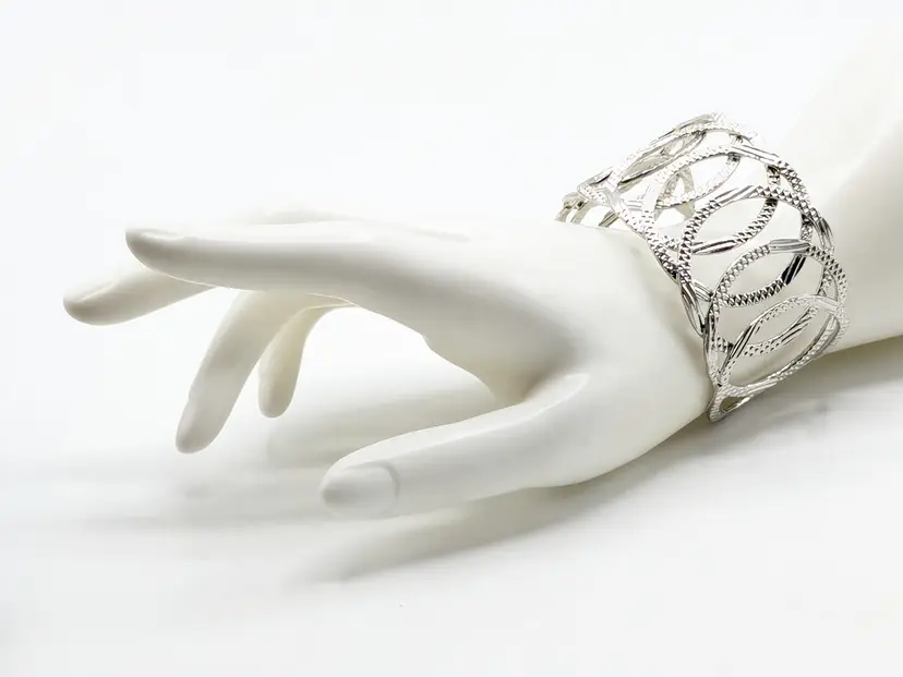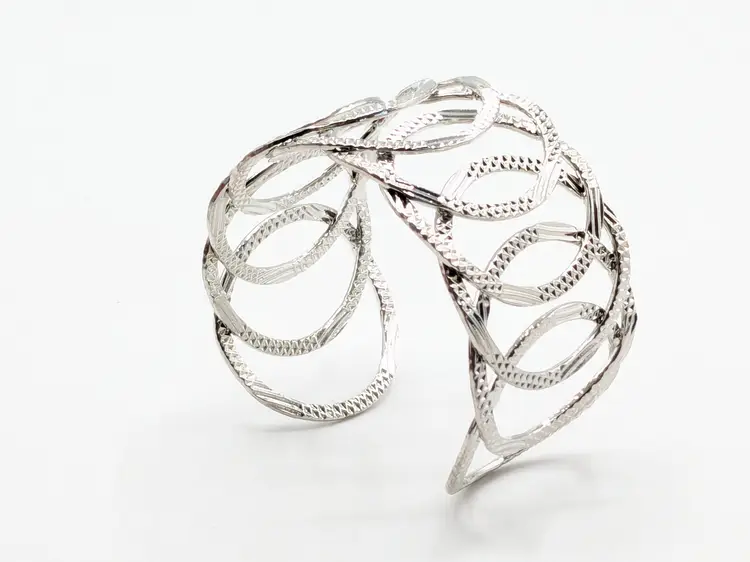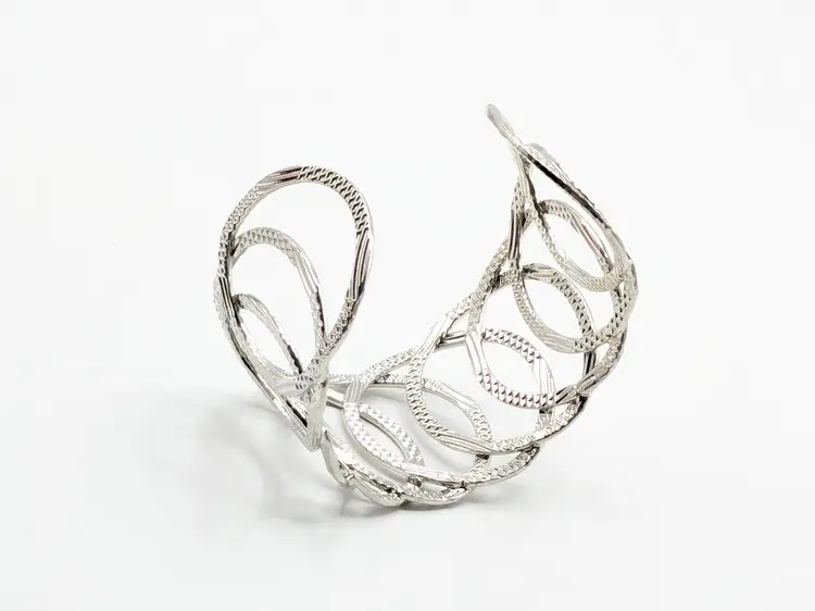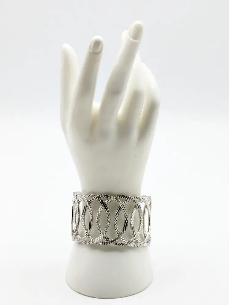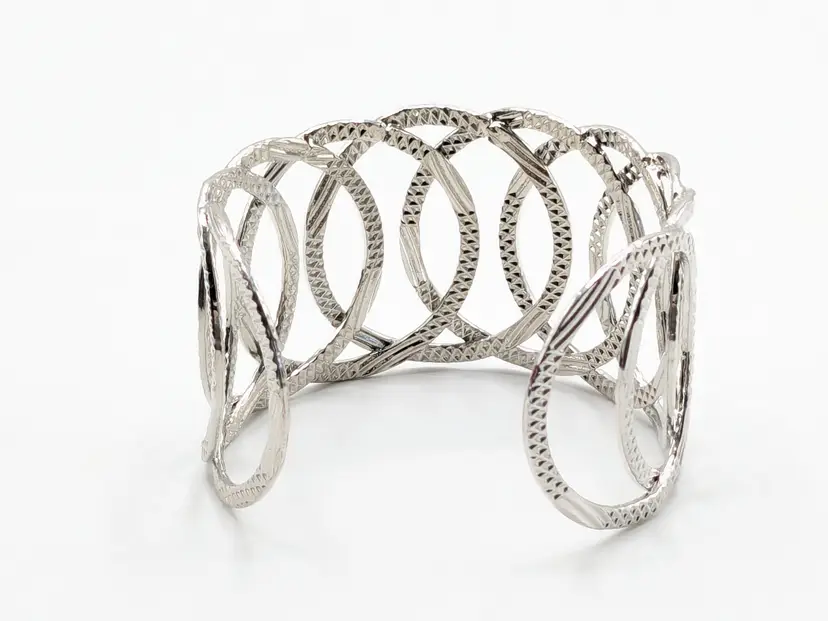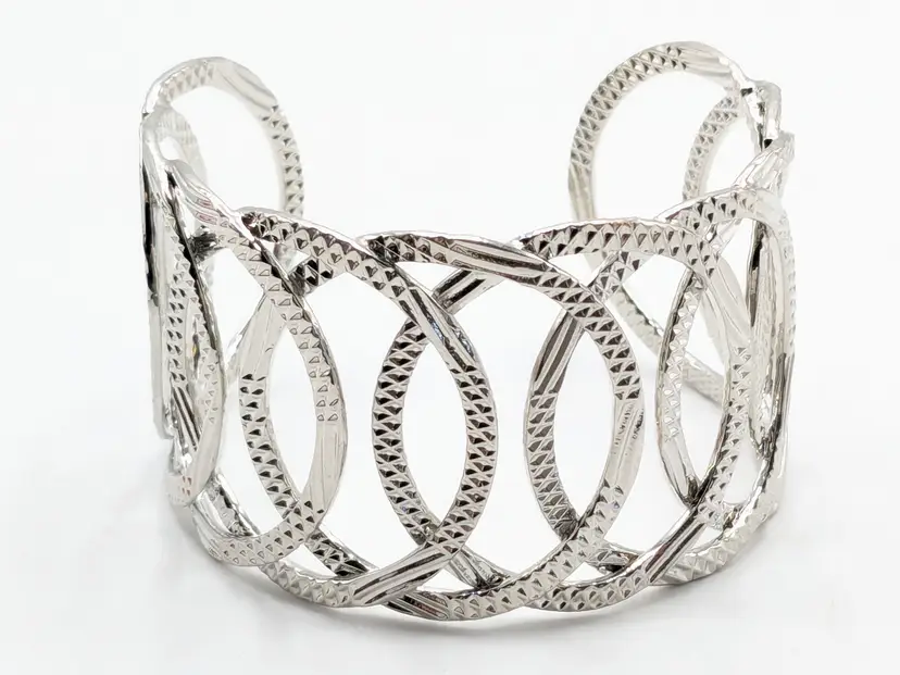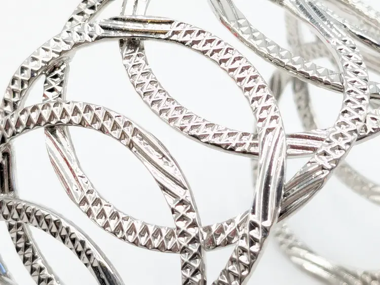 Good condition. Silver tone is bright and shiny with no color loss. Features over lapping etched circles. Size 7" and 1 1/2" wide. EN3