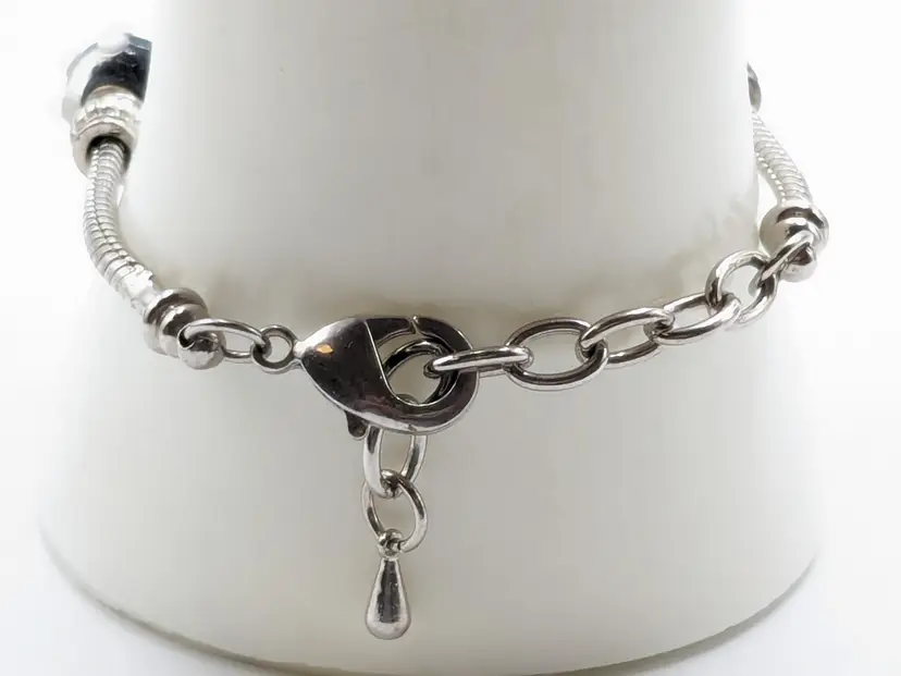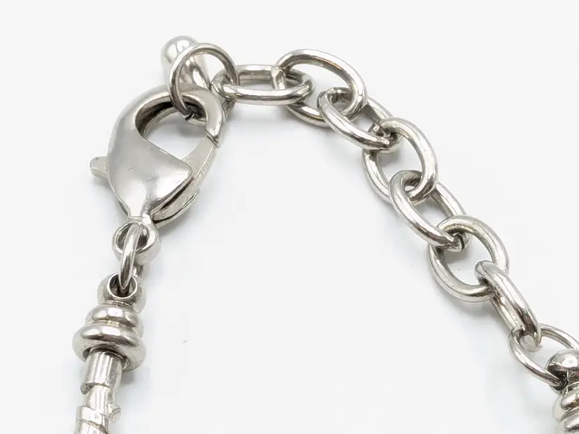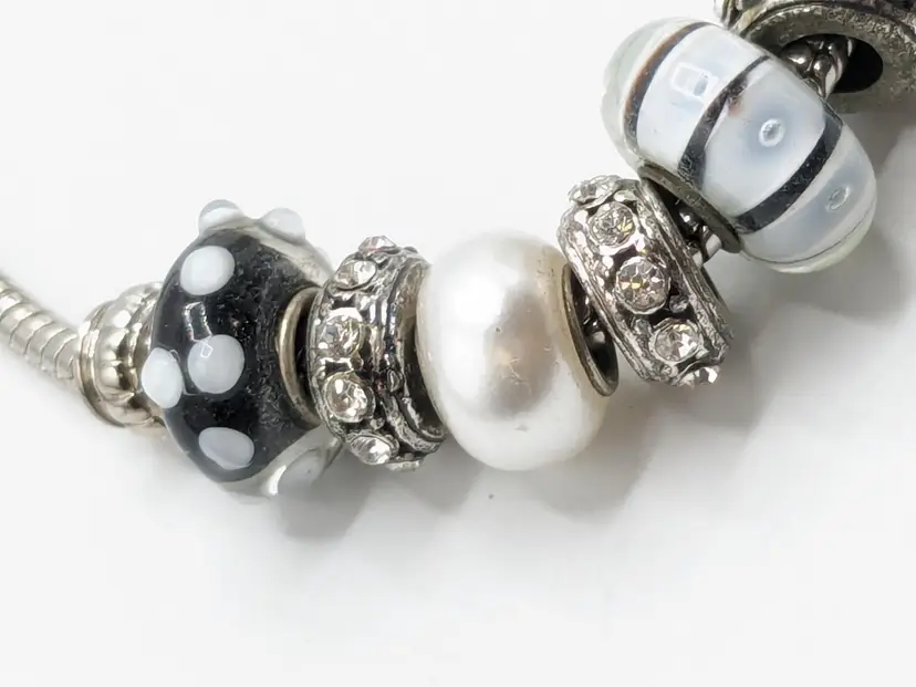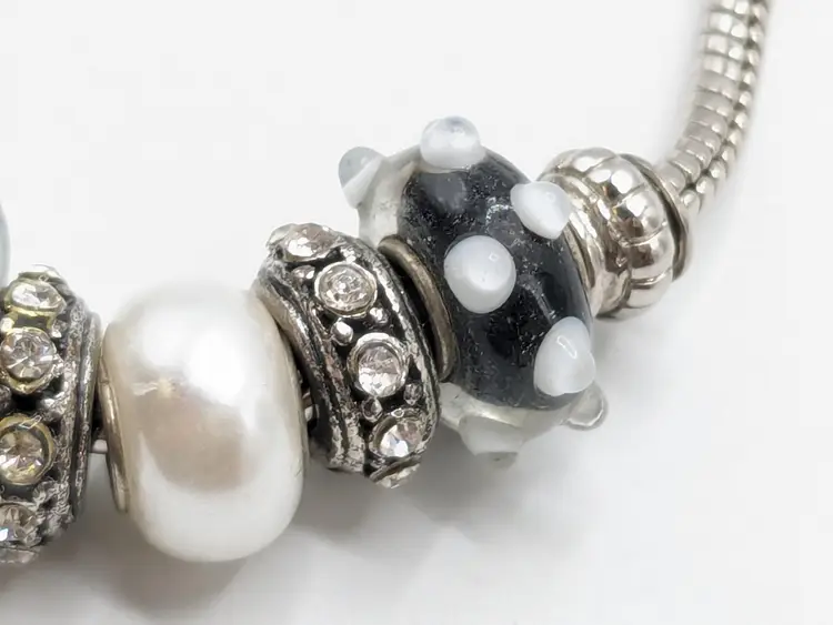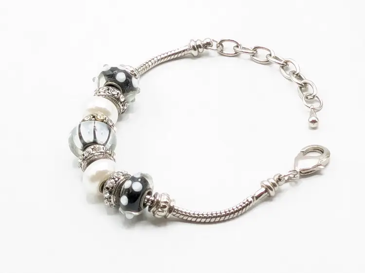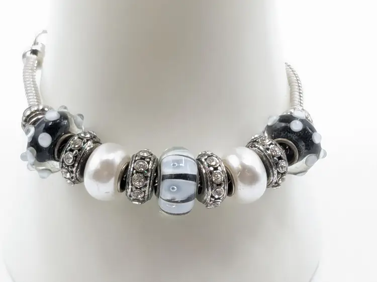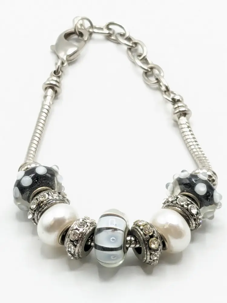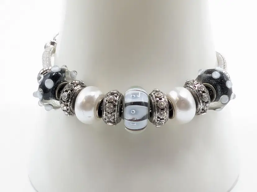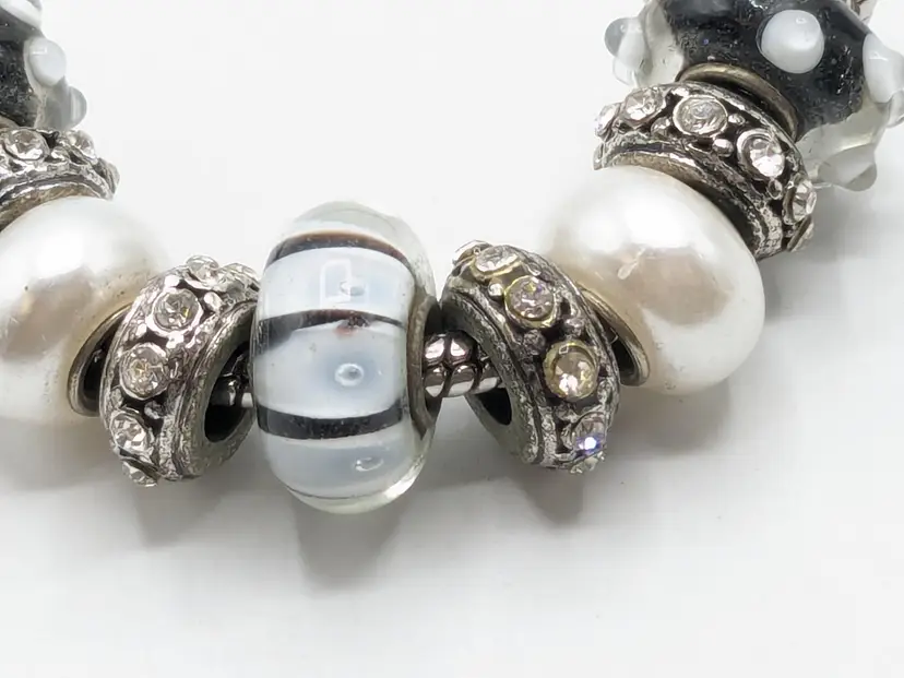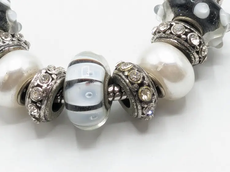 Good condition. Black and white beads are glass. All rhinestones are present. Measures up to 7 1/2". (EN1)