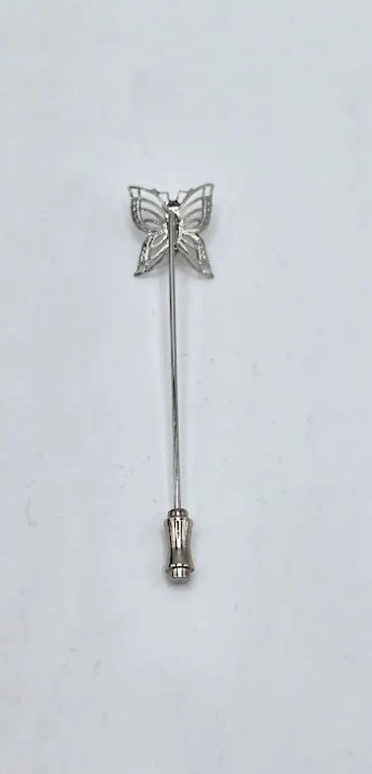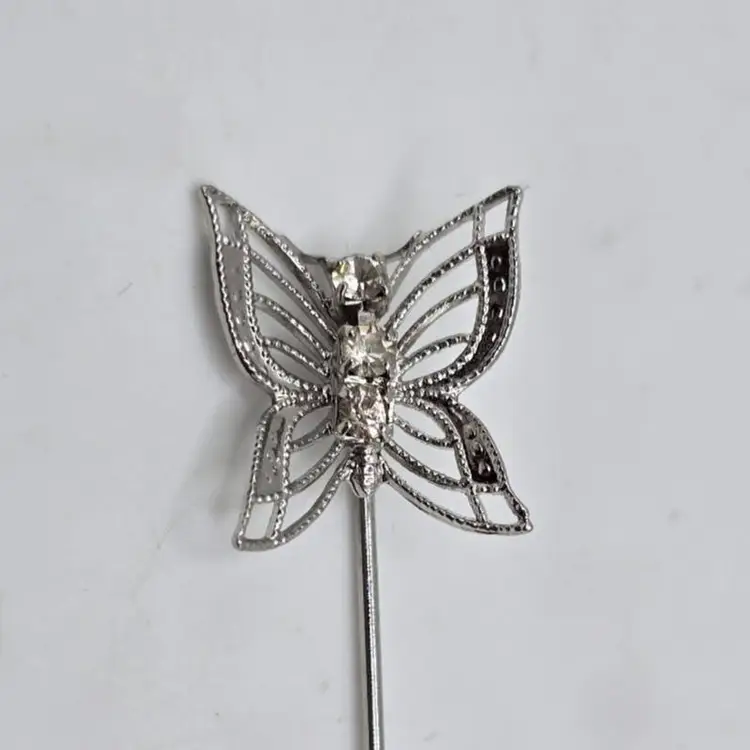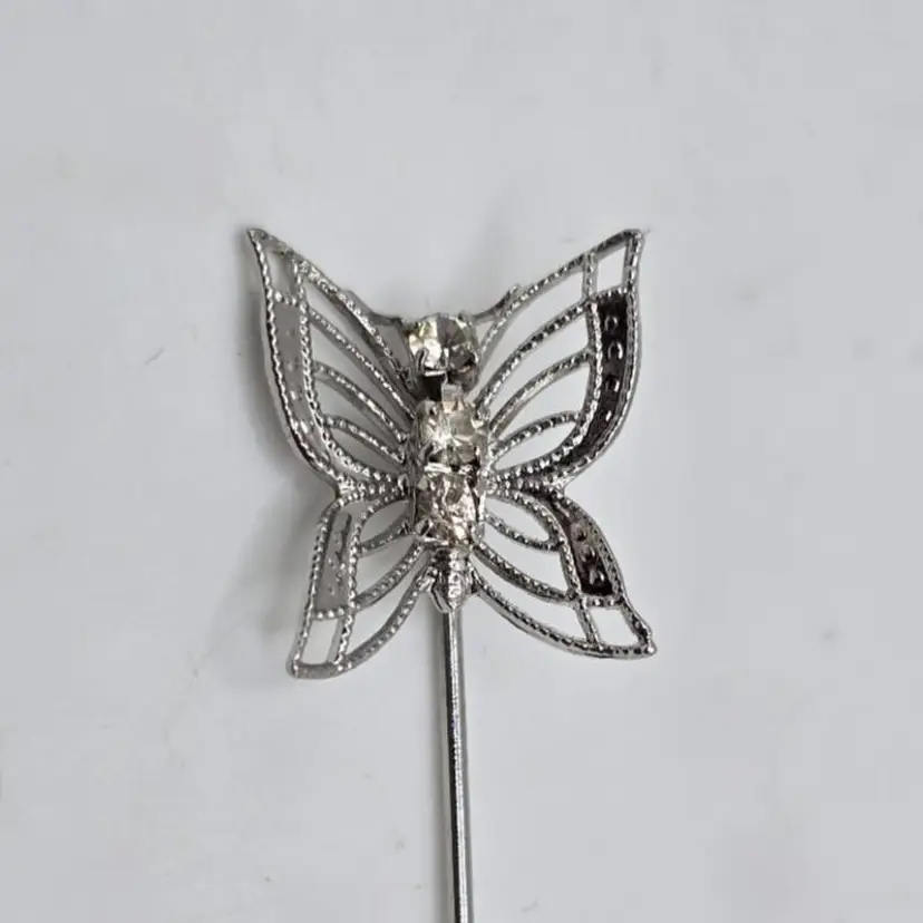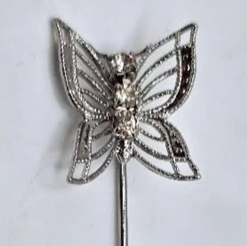 Silver tone filigree butterfly and rhinestone stick/hat pin. Measures 2 3/4" long x 1/2" wide. No maker's mark.