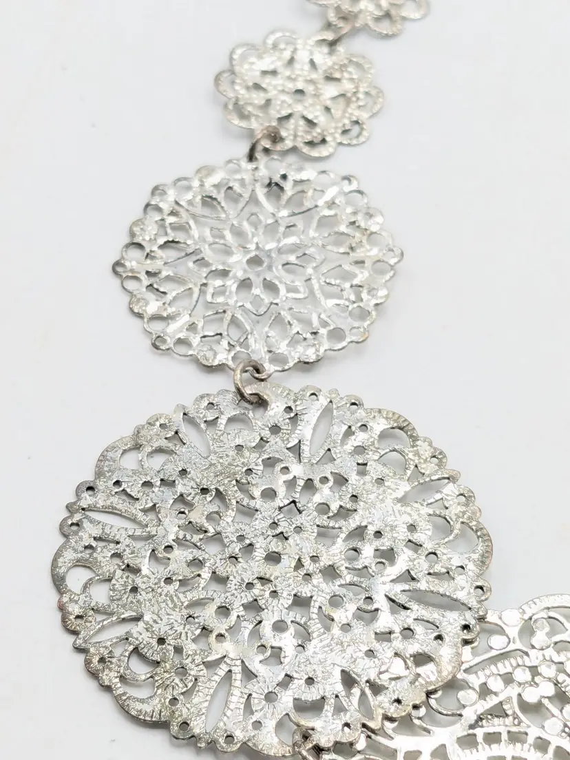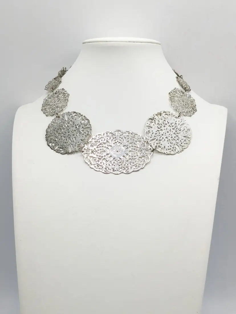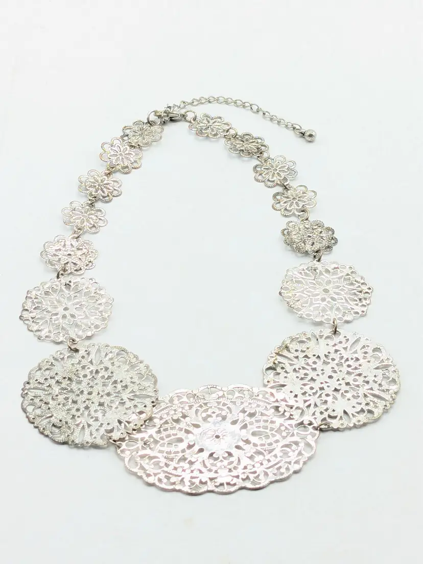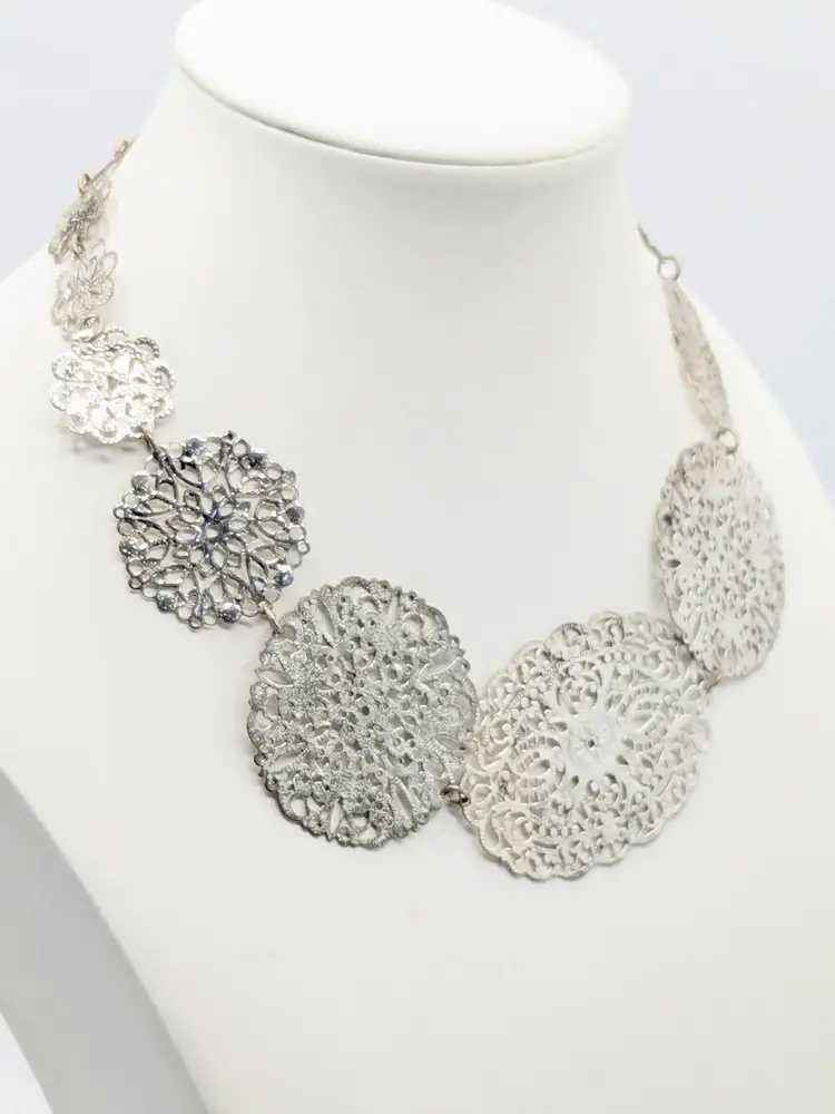 Good condition. Elegant lightweight necklace featuring intricate silver filigree designs. Perfect for adding a touch of sophistication to any outfit. Measures 15" + 3" extender. (EN2)