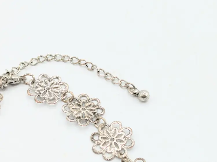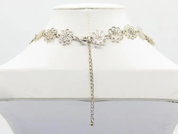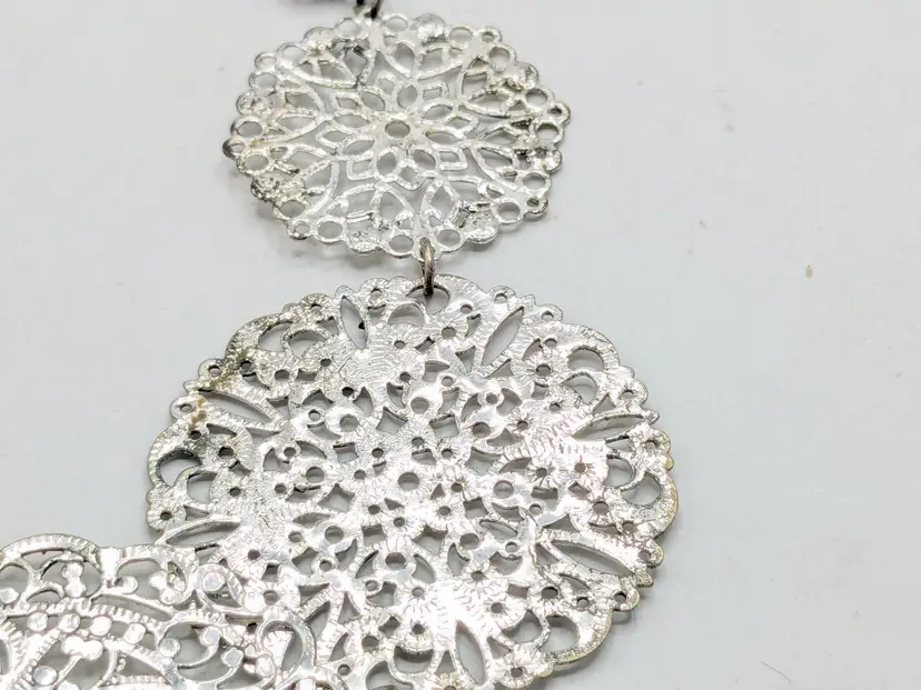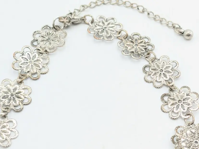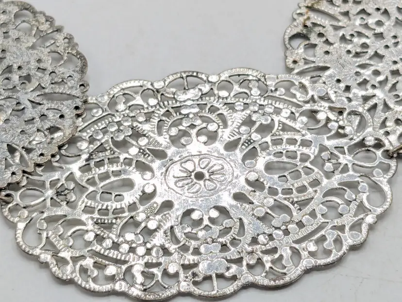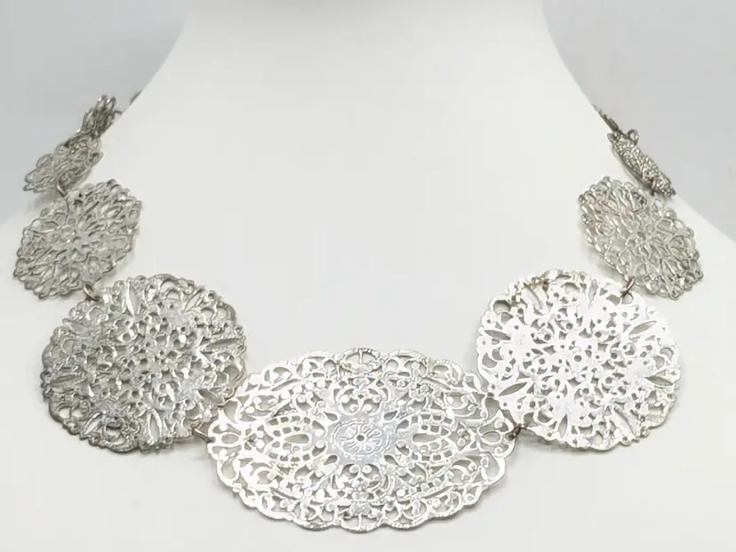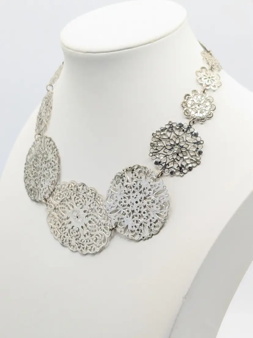Good condition. Elegant lightweight necklace featuring intricate silver filigree designs. Perfect for adding a touch of sophistication to any outfit. Measures 15" + 3" extender. (EN2)
