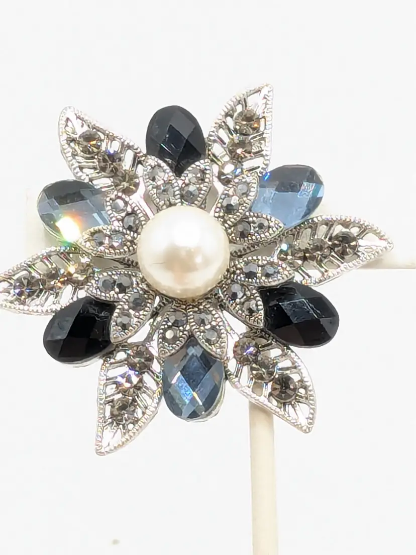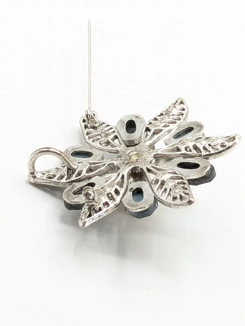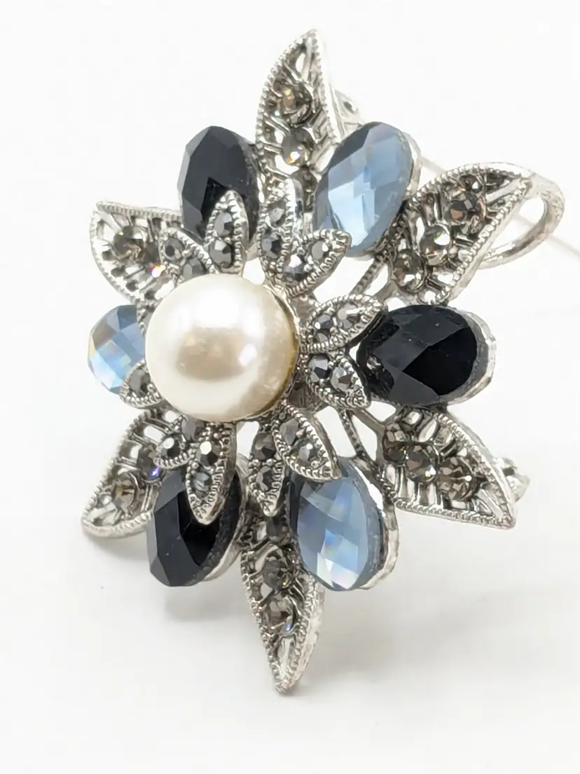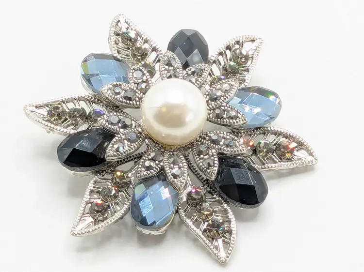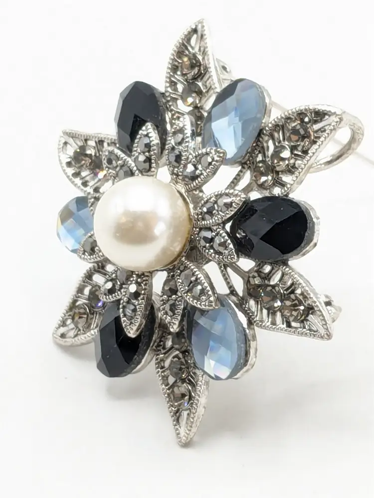 Good condition. No color loss. Faux pearl center and light and dark blue glass stones. Can be worn as a pendant or brooch. Measures 2 1/4". EN2