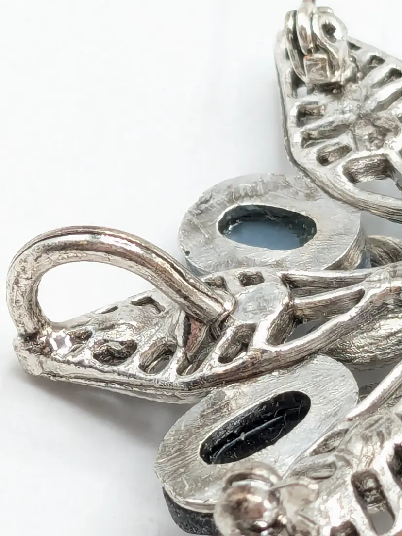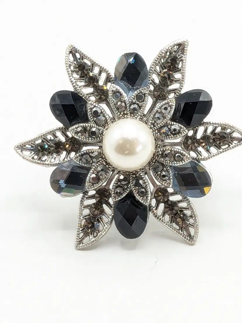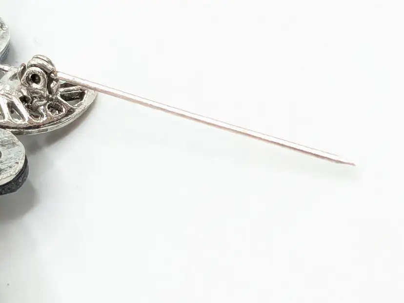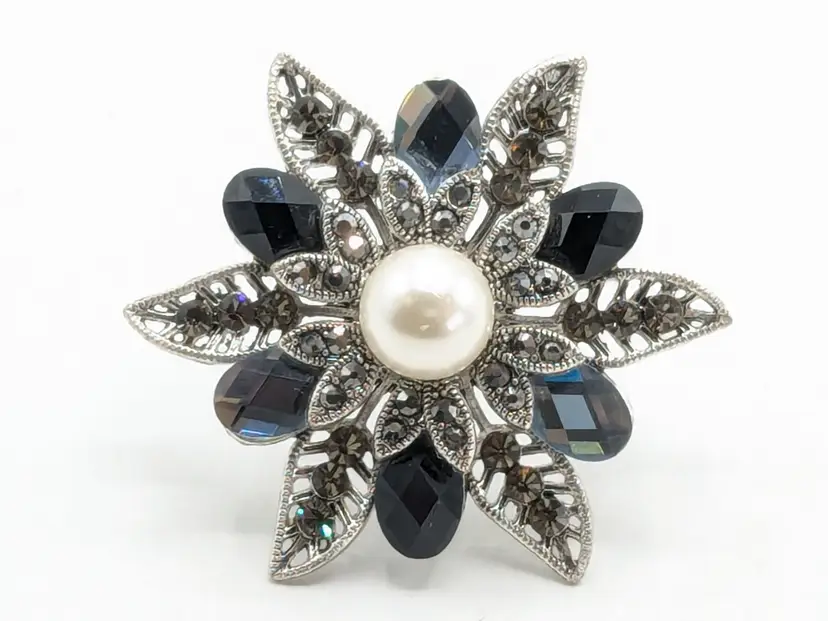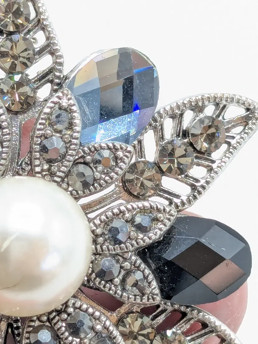 Good condition. No color loss. Faux pearl center and light and dark blue glass stones. Can be worn as a pendant or brooch. Measures 2 1/4". EN2