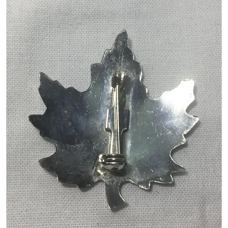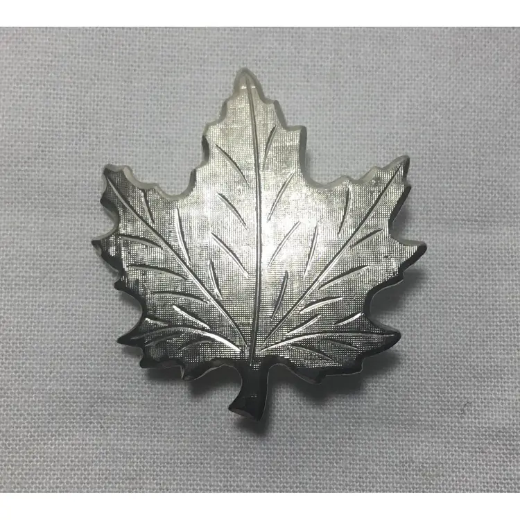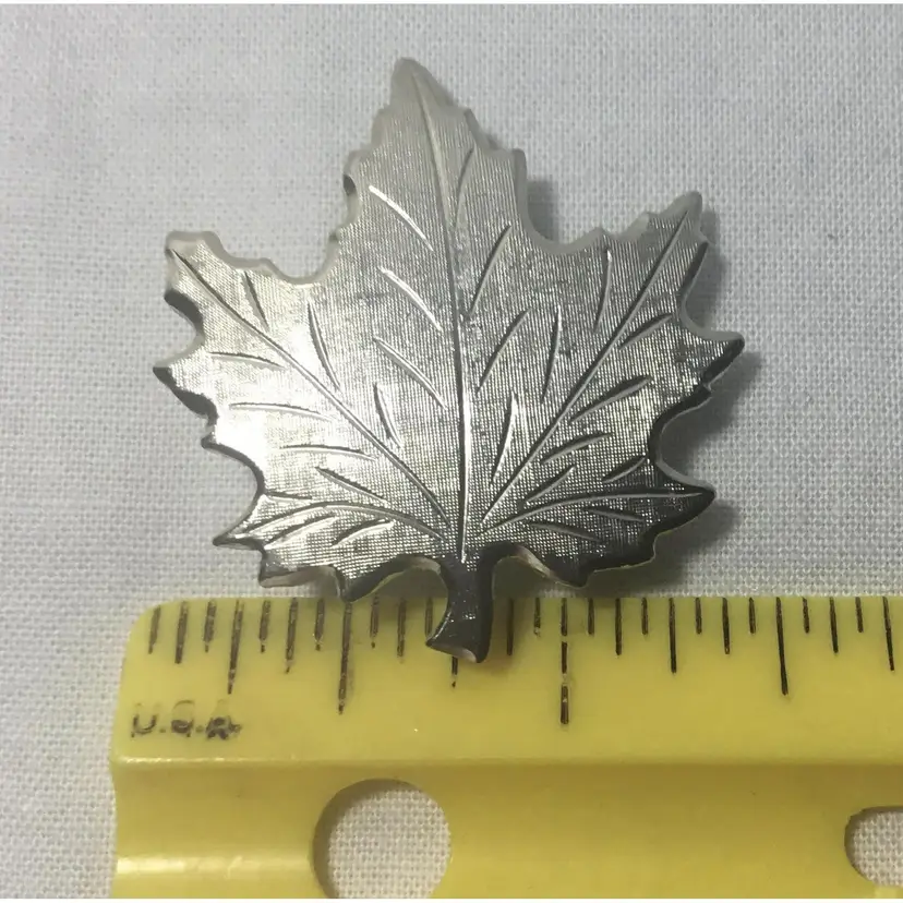 1.5 inches wide by 1.5 inches tall, silver tone maple leaf, textured front with leaf veins etched in. Pin with safety catch on back.