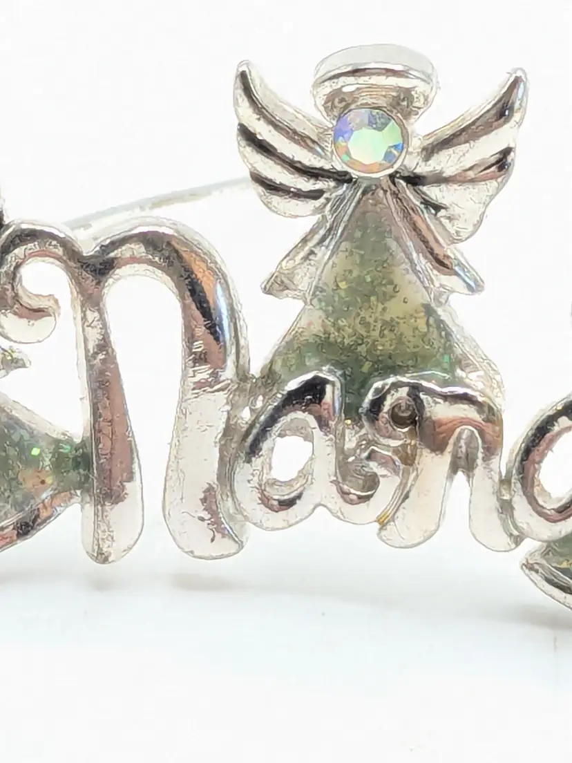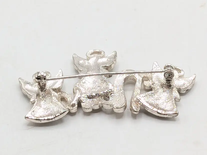 Good condition. Brooch is bright and shiny with no color loss to the silver tone. Measures 2 1/8" in length and 1" height. EN2