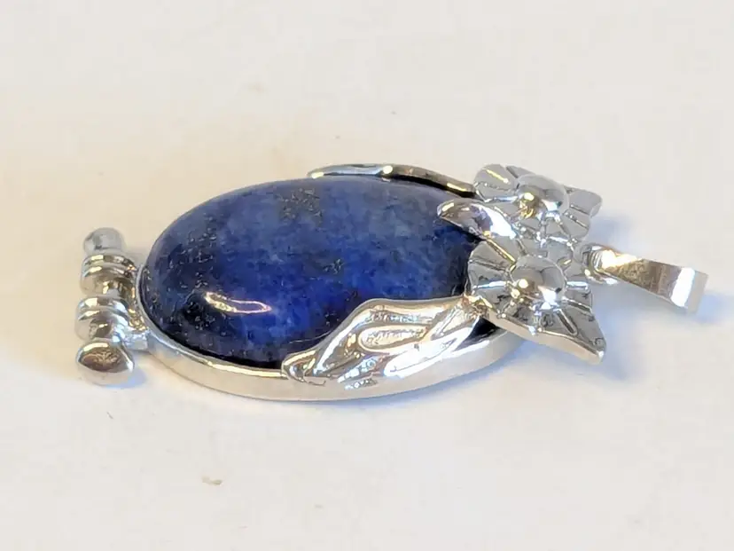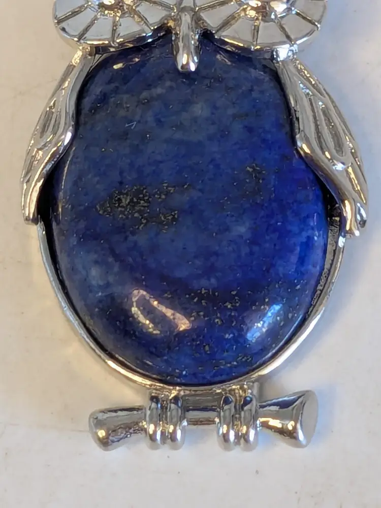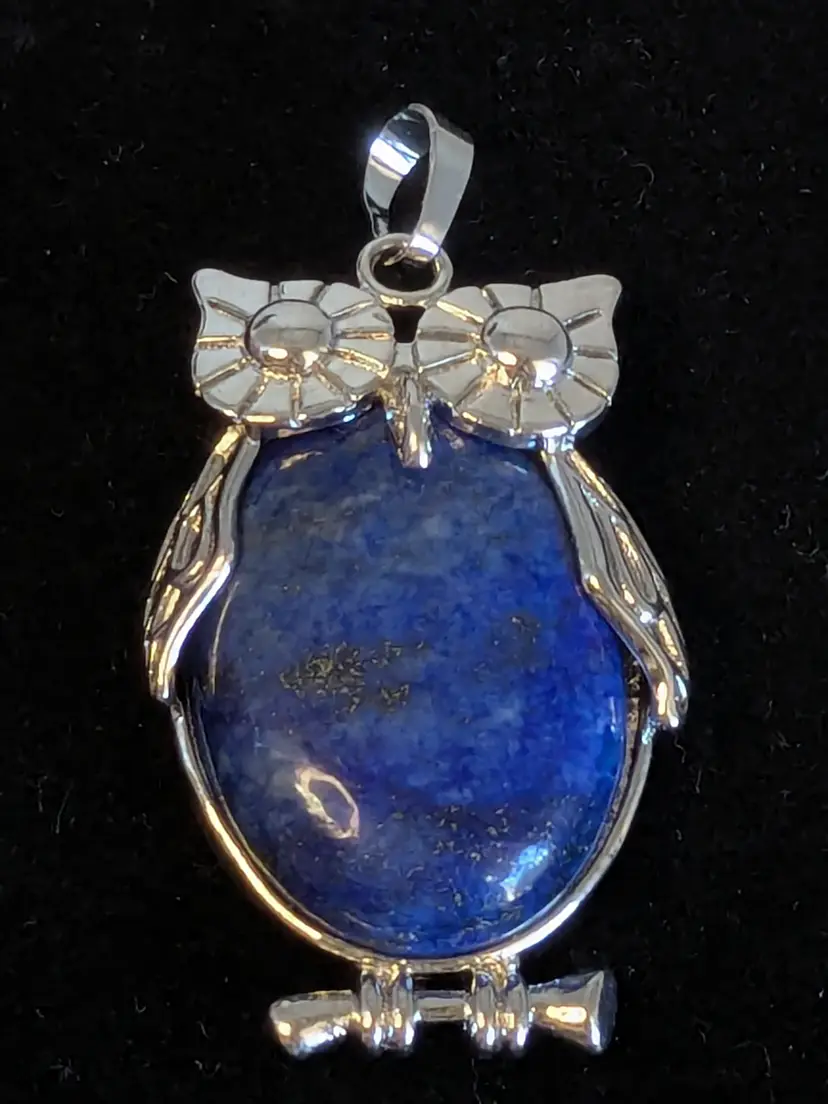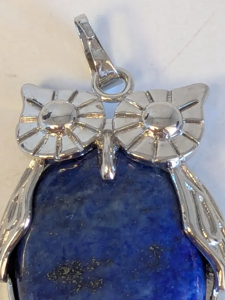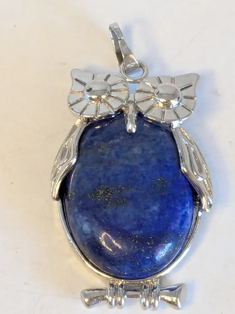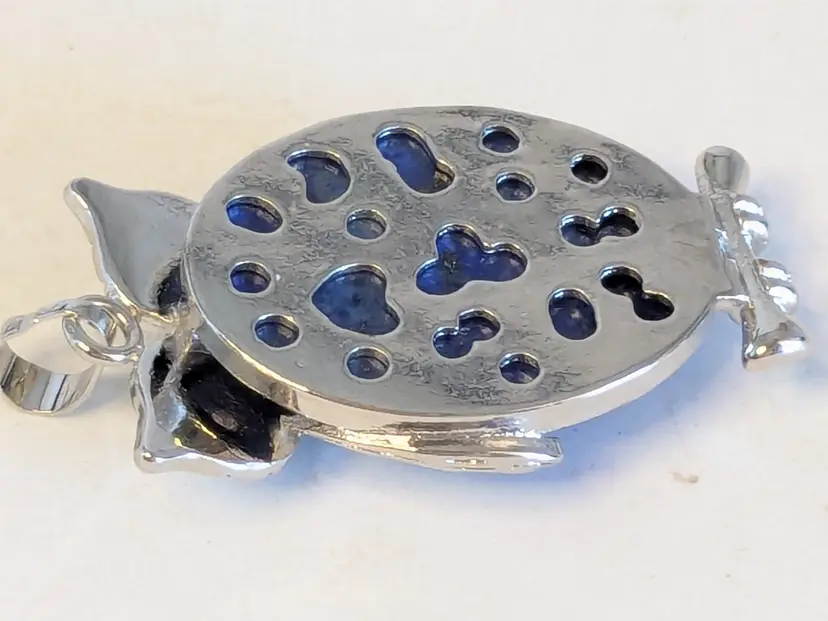 Good condition. Silver tone is bright and shiny with no color loss. Blue stone belly. Pendant. Measures 1 1/2" in length and 1" wide. wen
