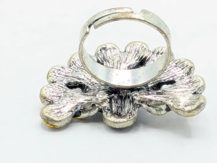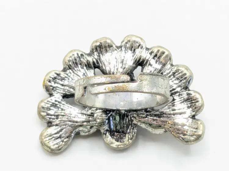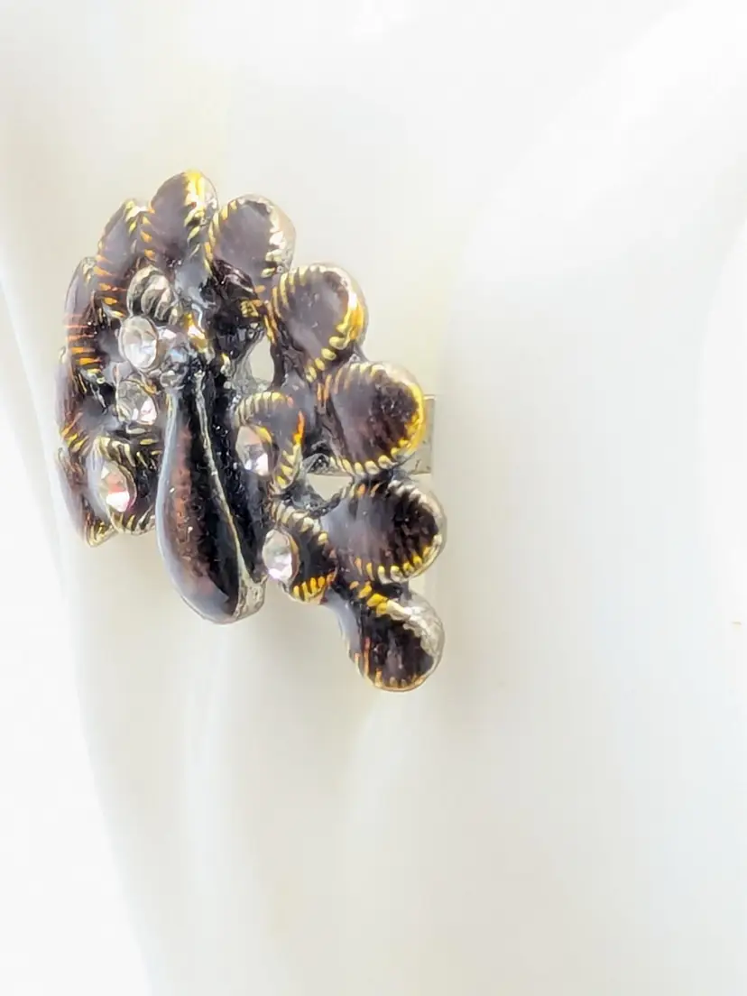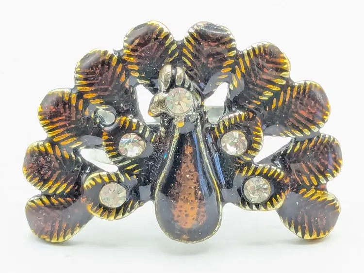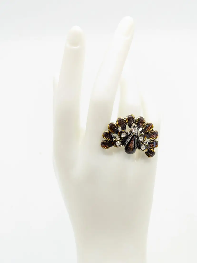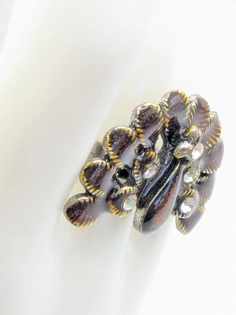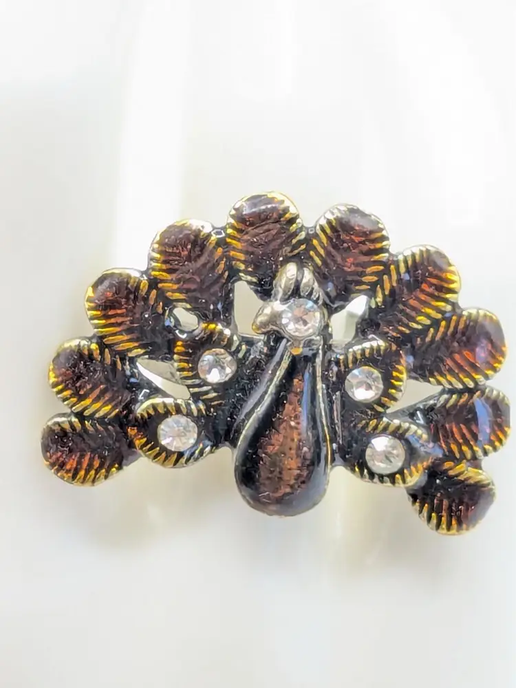 Bird is the word! Good condition with a bit of tarnish on bottom band of ring. Peacock ring with shimmering rhinestones and silver tone. Size 7 but is adjustable. (EN2)