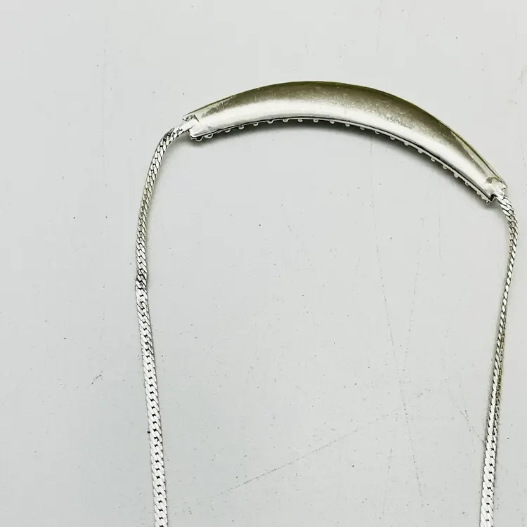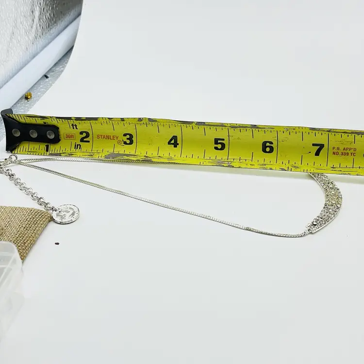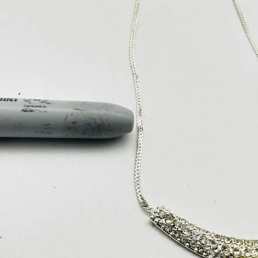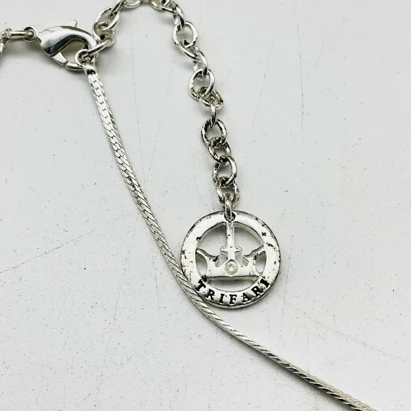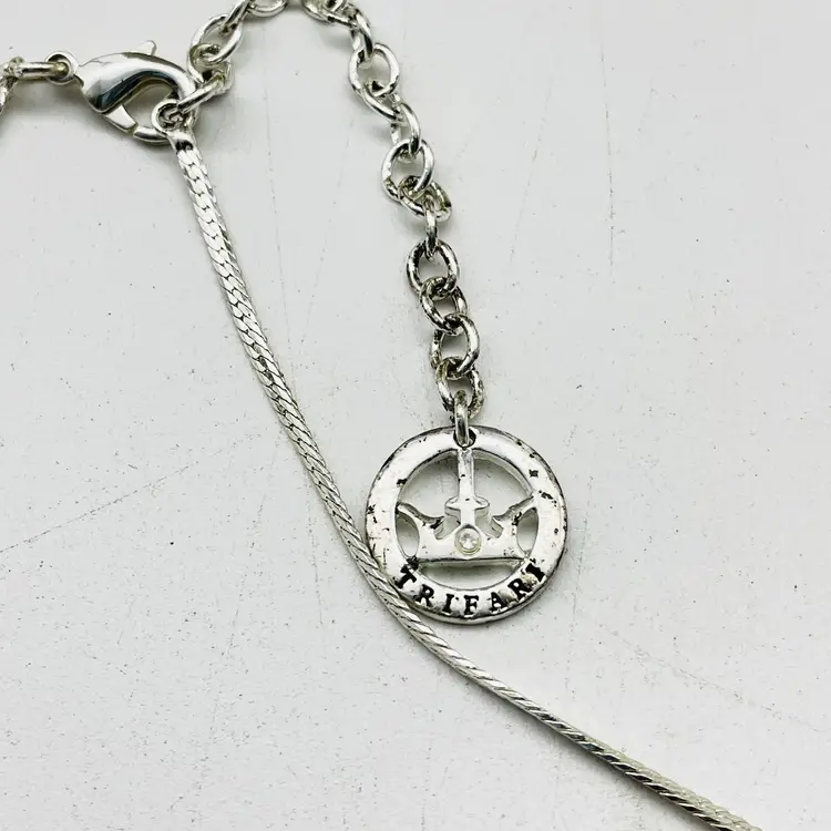 Features: Silver tone bar design Clear rhinestone accents Adjustable extender with Crown Trifari logo charm detail Lightweight and versatile Great for layering or standalone wear Kink in chain 14 inches See photos