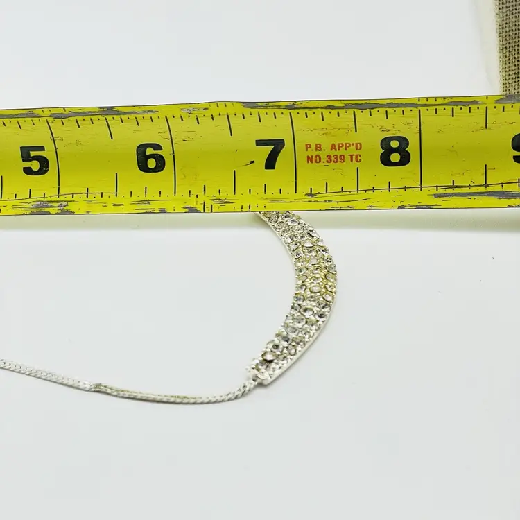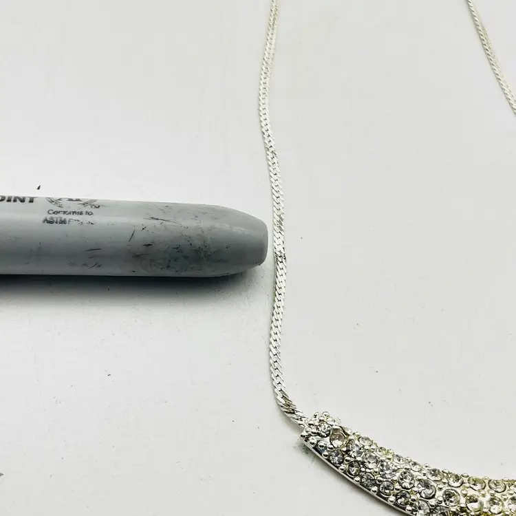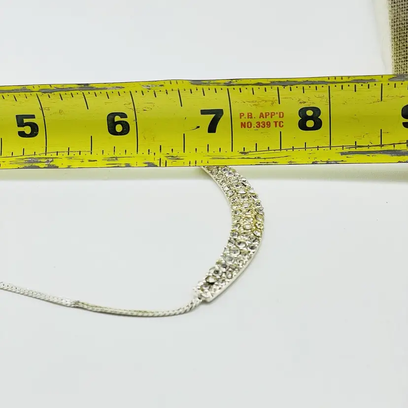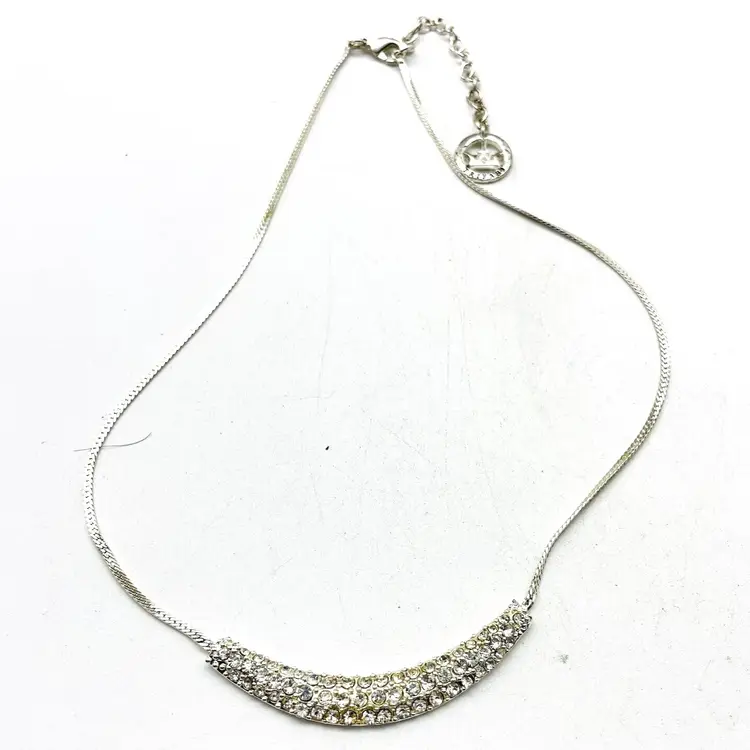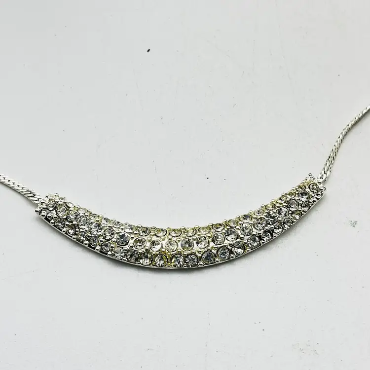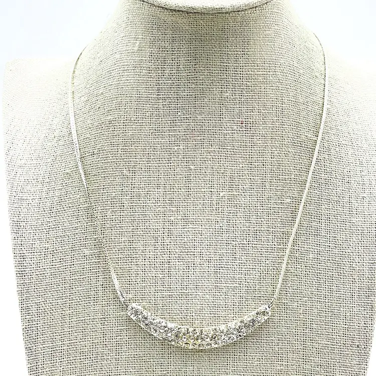 Chic silver tone necklace featuring a curved bar encrusted with clear rhinestones. Includes extender for adjustable fit. Perfect for adding sparkle to any outfit.