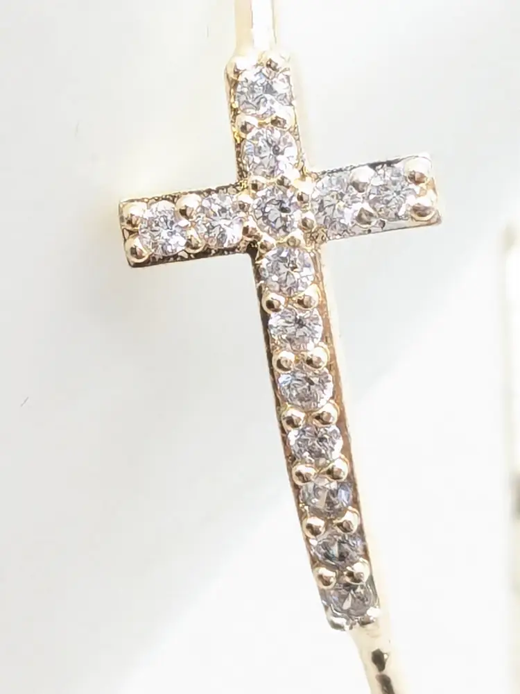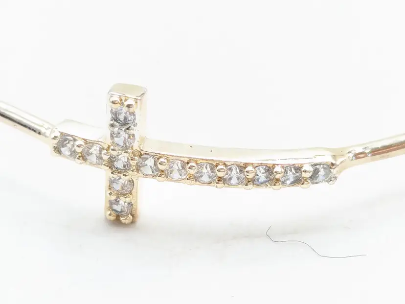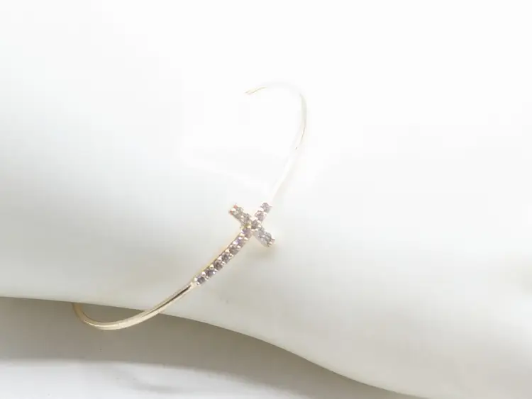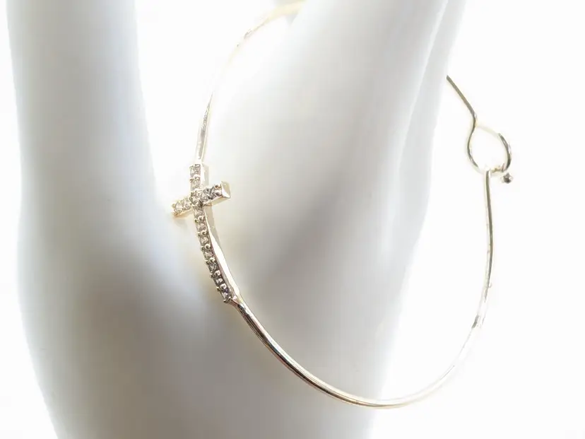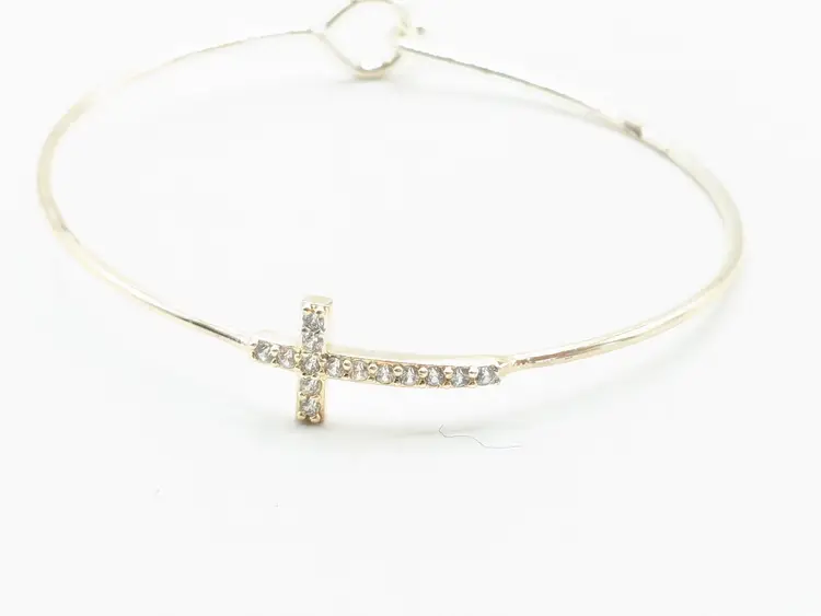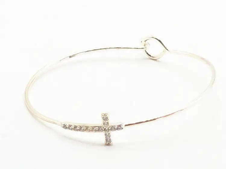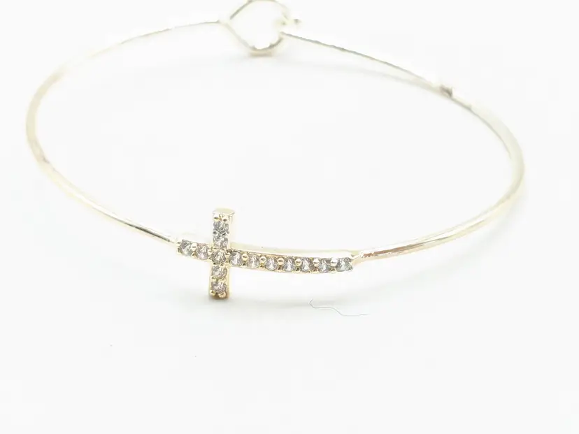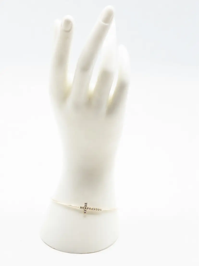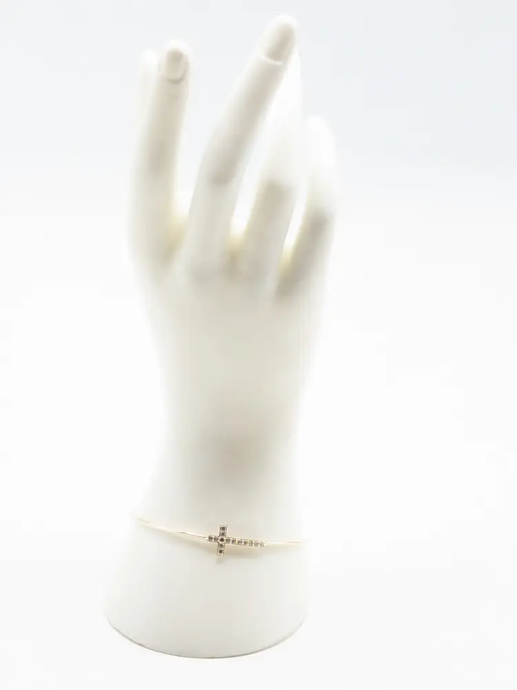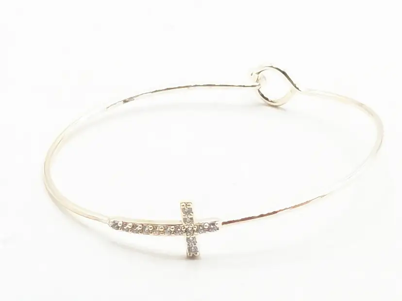 Good condition. Silver tone is bright and shiny with no color loss. All stones are present on cross. Bracelet measures 7 1/4". Cross measures 3/4" in length and 3/8" wide. EN2