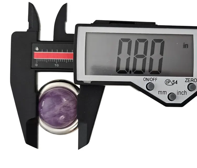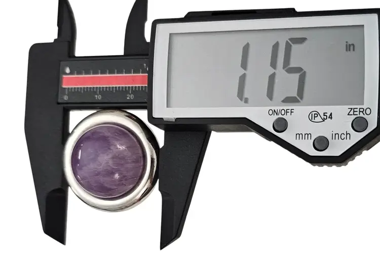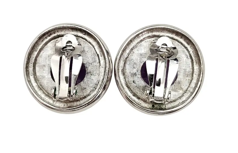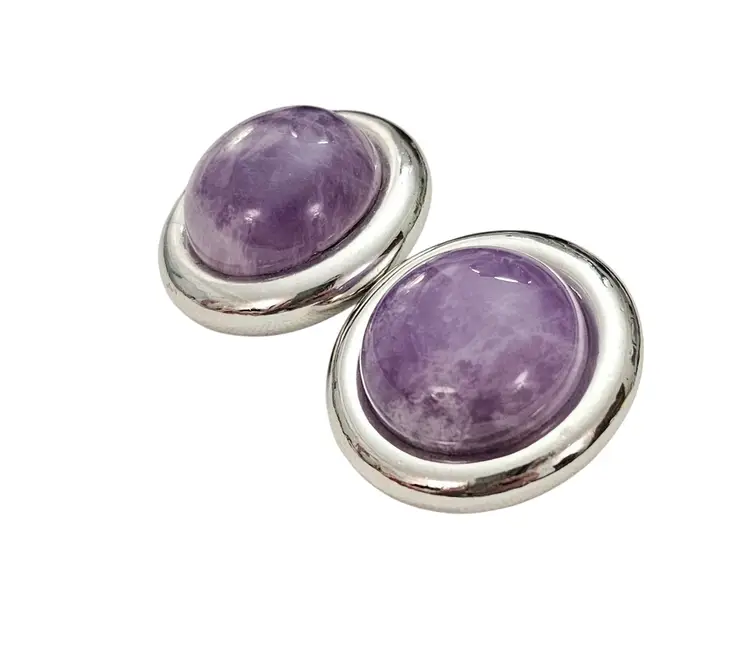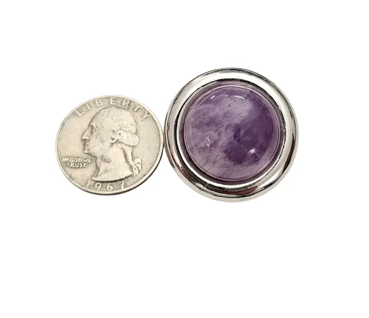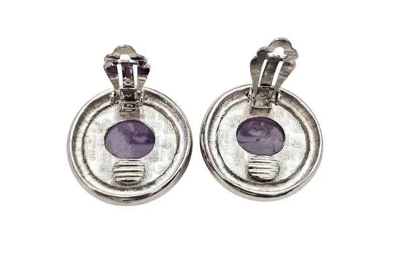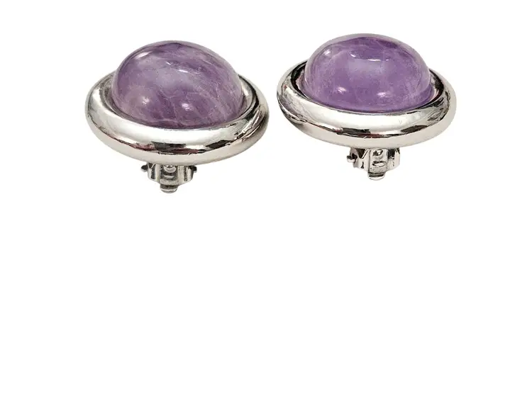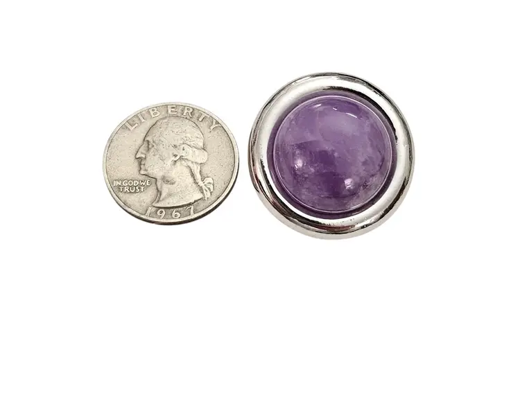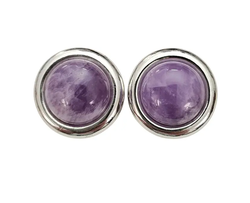 • Vintage Round Clip-On Earrings • Classic round dome-shaped earrings • Silver tone base metal • Polished, smooth, round-shaped frame • Purple Amethyst centerpiece, a popular gemstone widely used in jewelry • The Purple Amethyst stone measures approximately 0.8 inches in diameter • Both earrings measures appoximately1.2 inches in diameter • Wide paddle back clip-on closure, ensuring a comfortable and secure fit for all-day wear • Good condition • J185