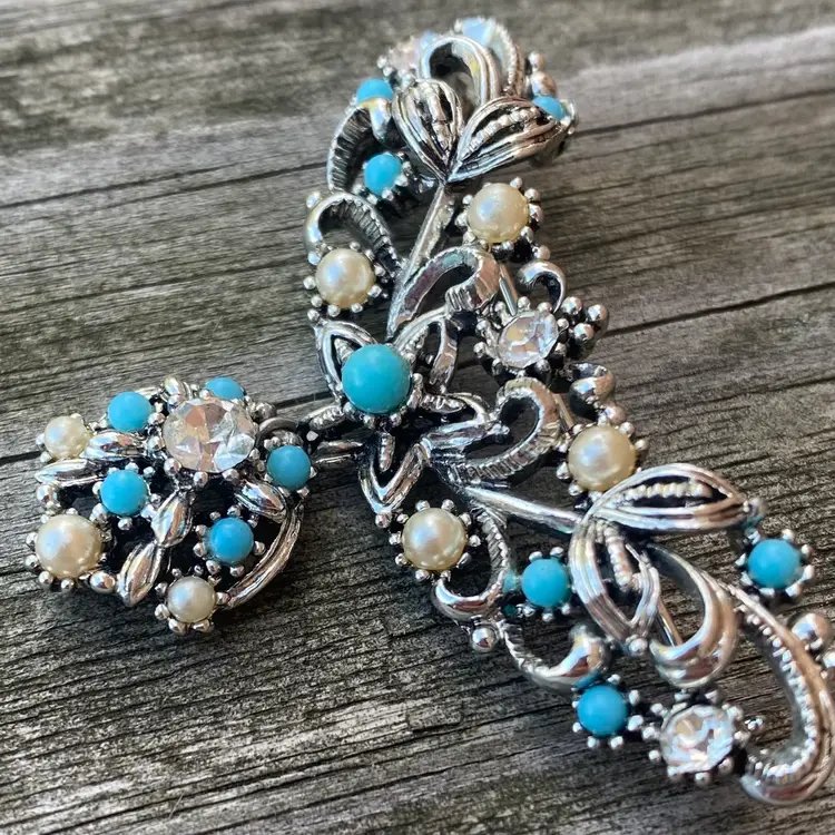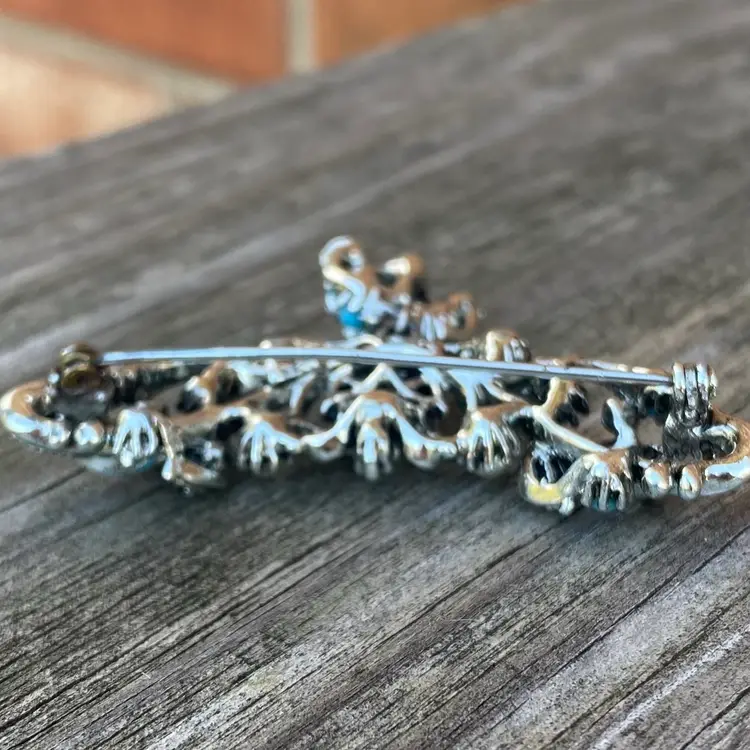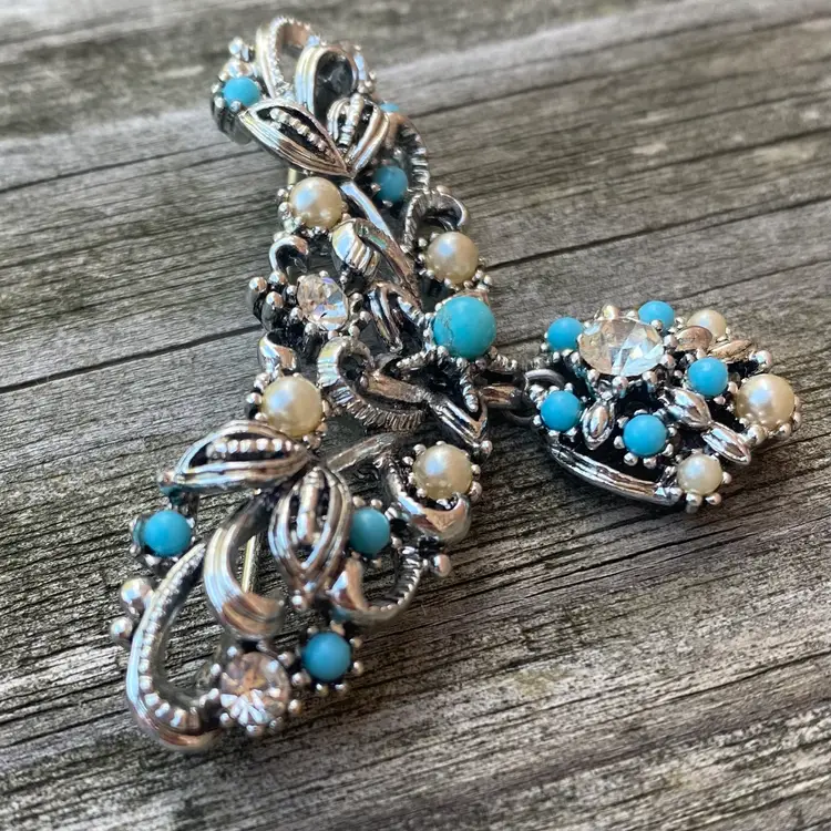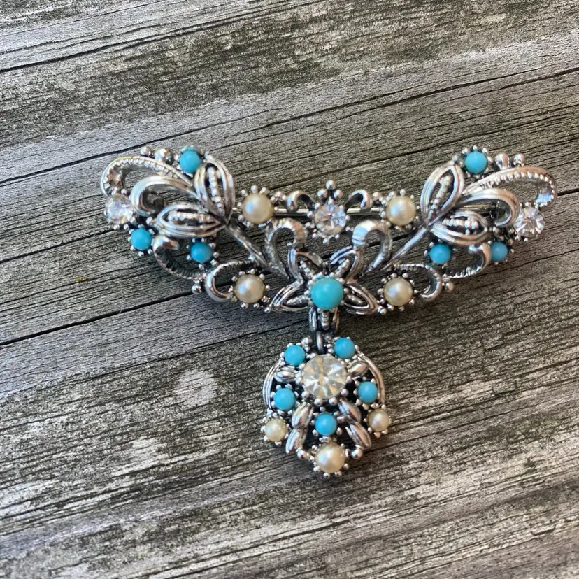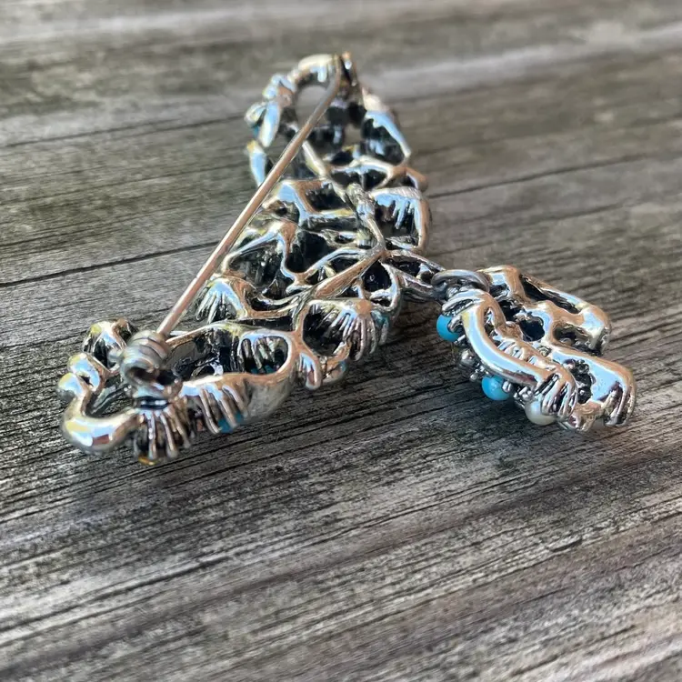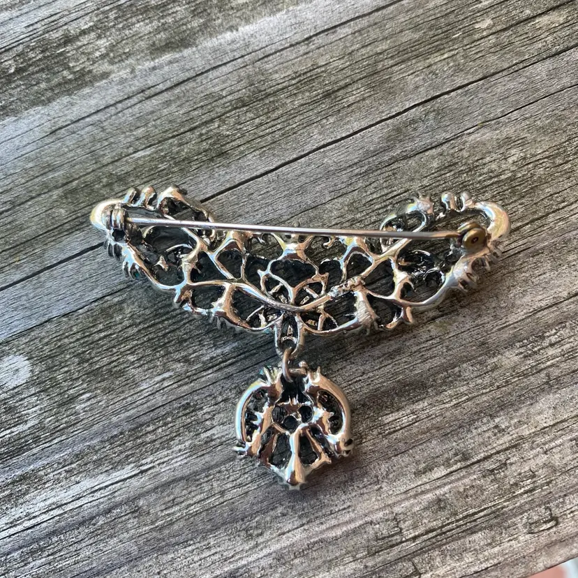 The condition is excellent given how old it is and the pin works as it should. There’s a bit of wear at the hinge of the pin and on the pin itself. The link that connects the pendant to the brooch is slightly open. The pendant doesn’t detach but there is a space. It could likely be easily closed by a skilled hand. I am not that person and won’t risk damaging the piece.