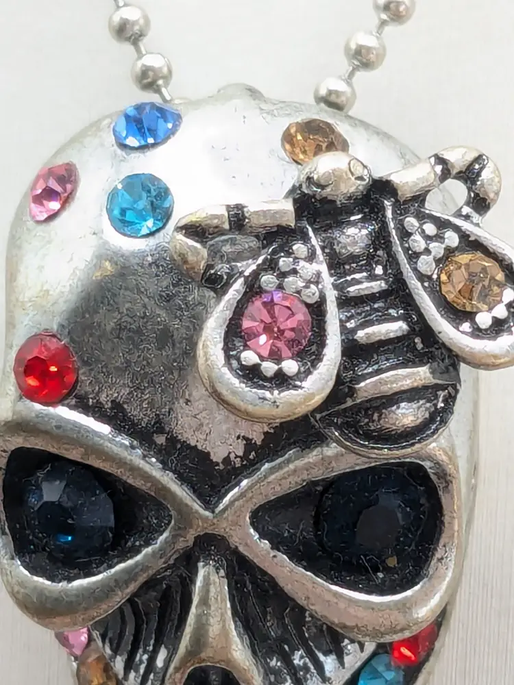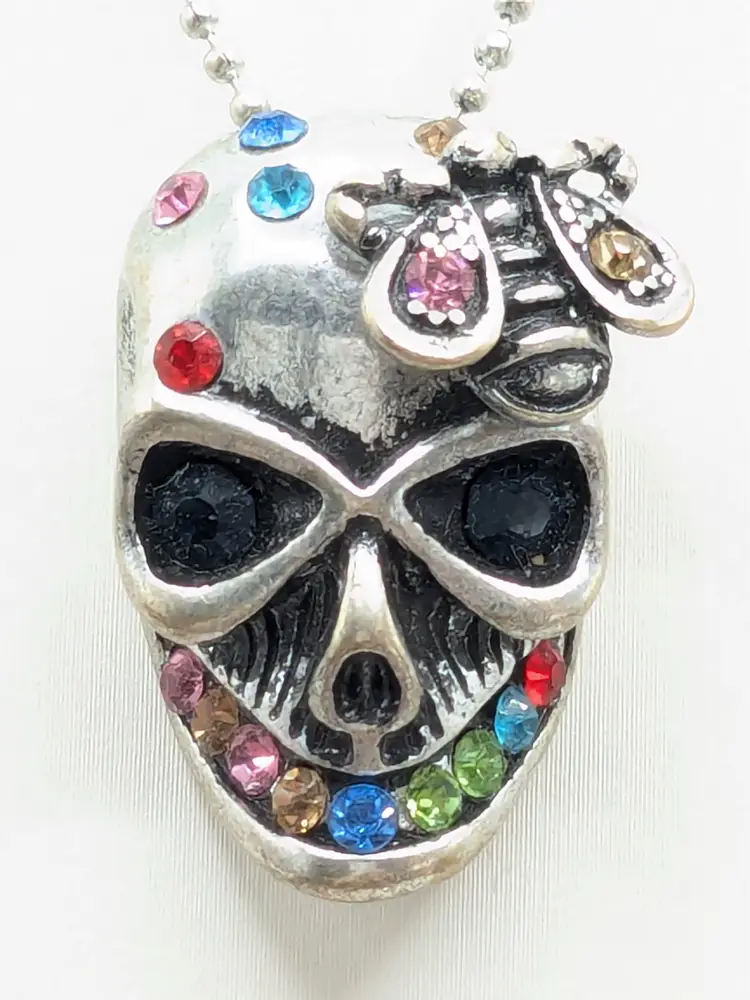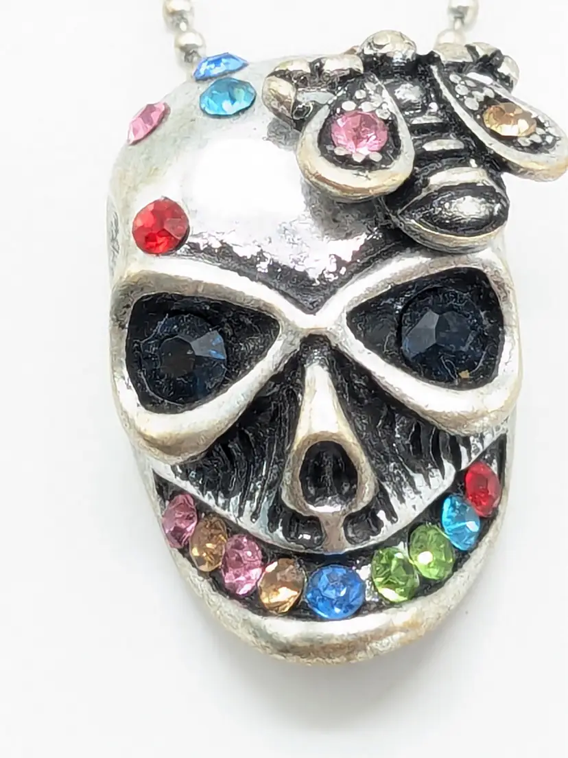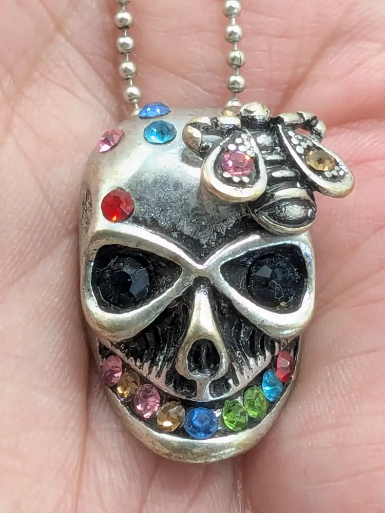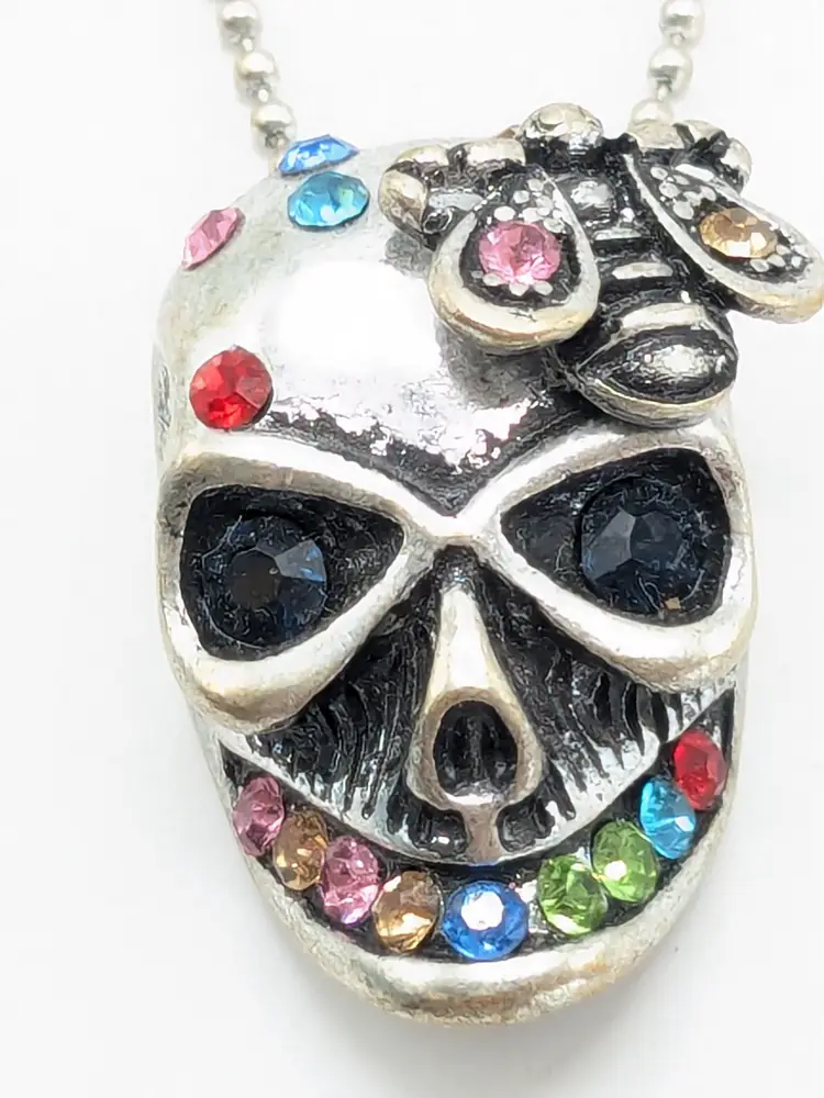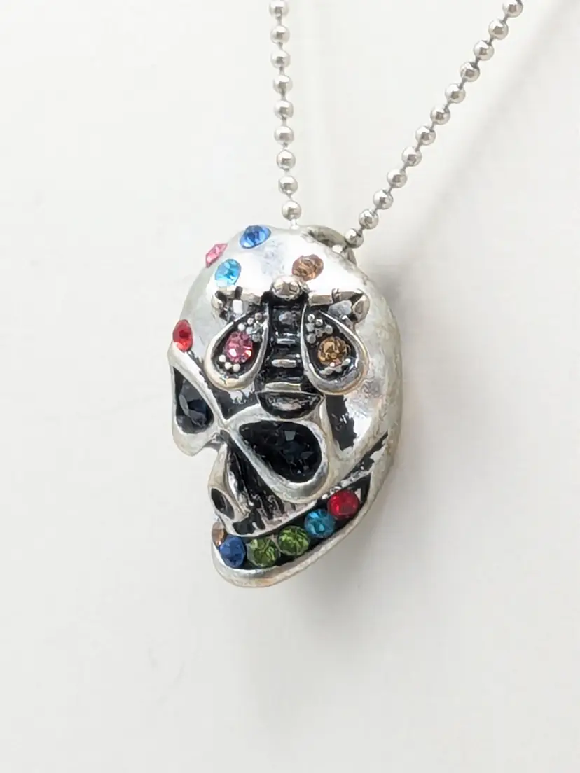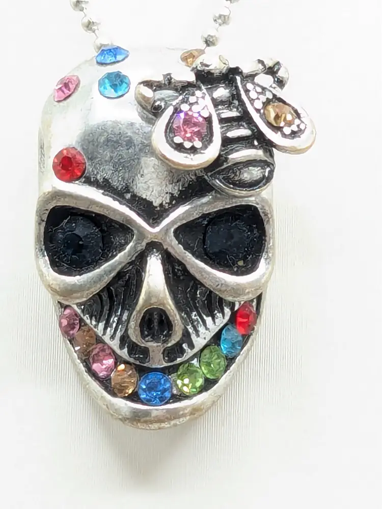 Good condition. Skull features dark rhinestones in eyes and colorful stones. Atop his head is a bee. Perfect for Halloween! Chain measures 16" with a 2" extender. Pendant measures 1 1/8" in length and 5/8" wide. EN3
